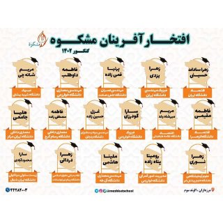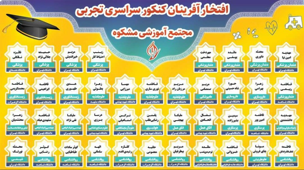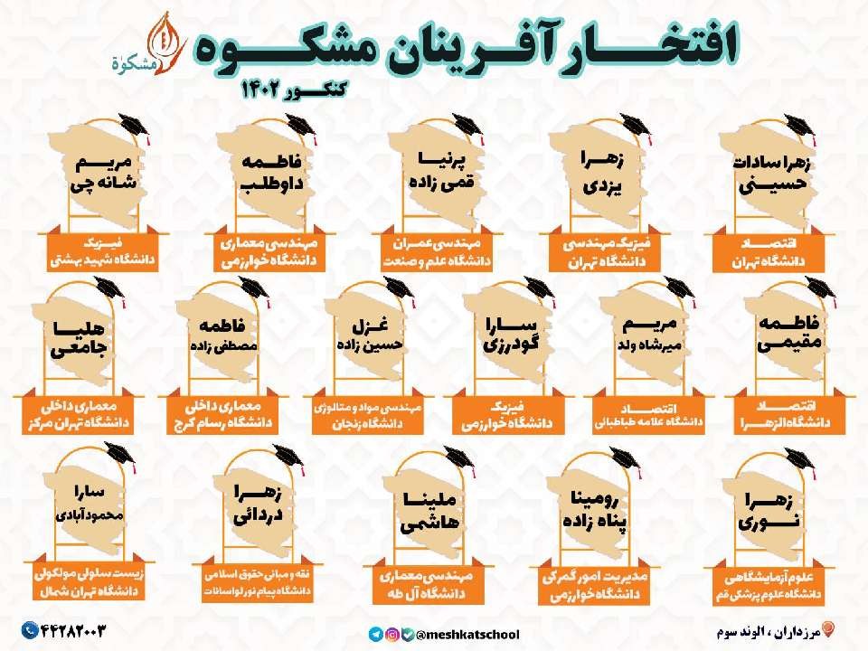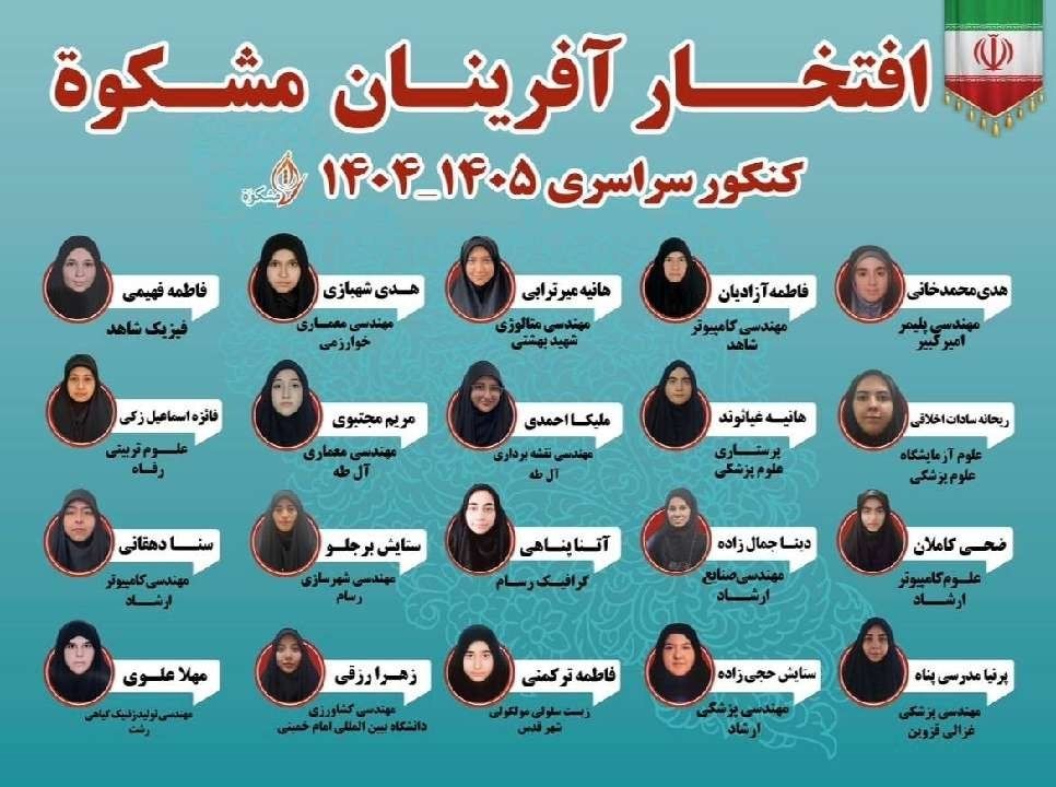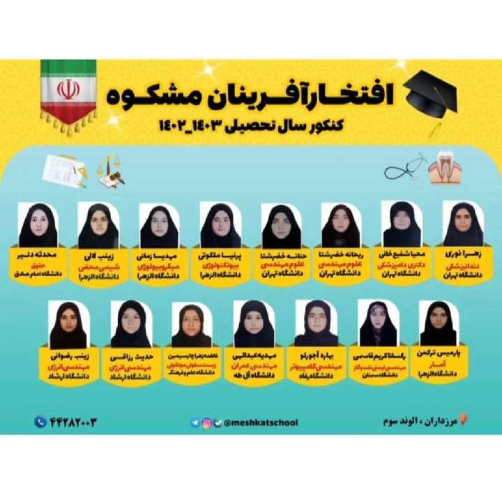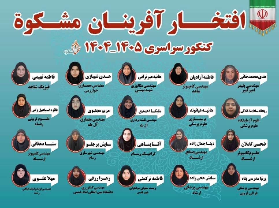 درخشش دختران عزیز مشکوتی را در کنکور سراسری سالهای اخیر خدمت خانواده بزرگ مشکوه تبریک عرض می نماییم.