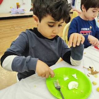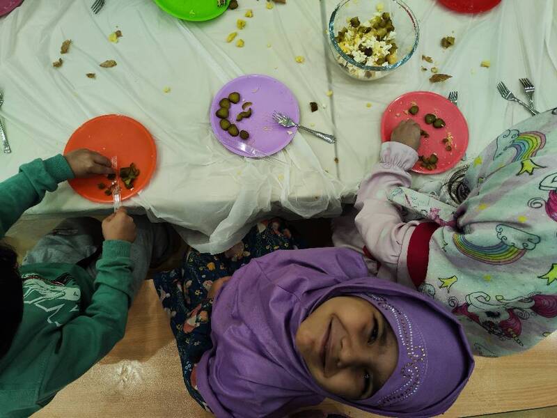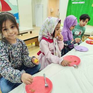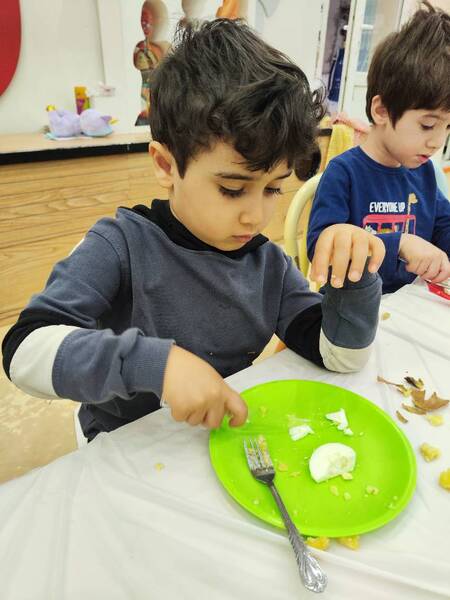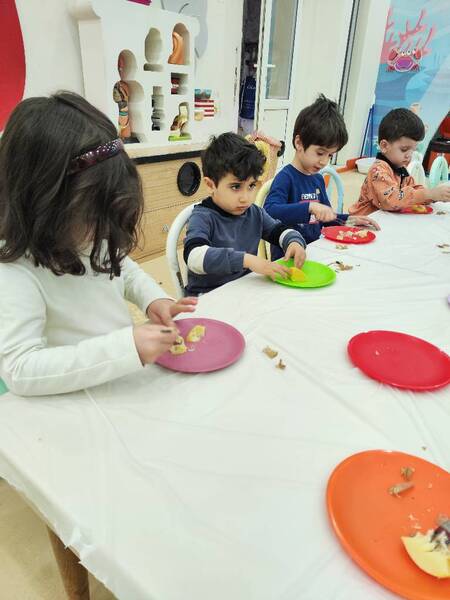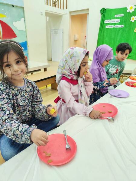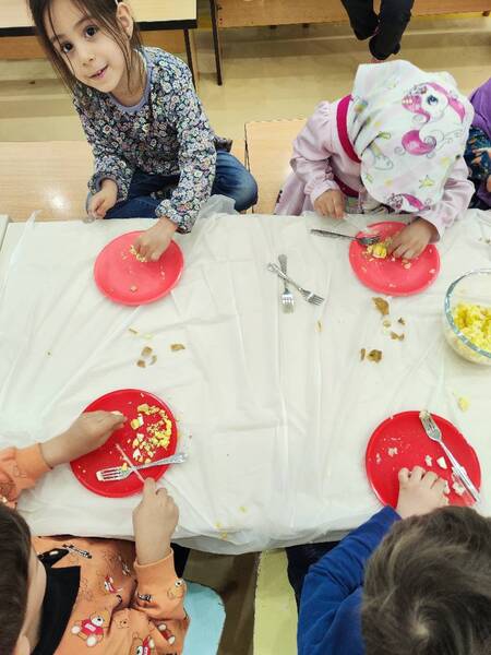 اول به بچهها سیبزمینی پخته شده دادیم و پوستش رو گرفتن و با چنگال لهش کردن 🥔