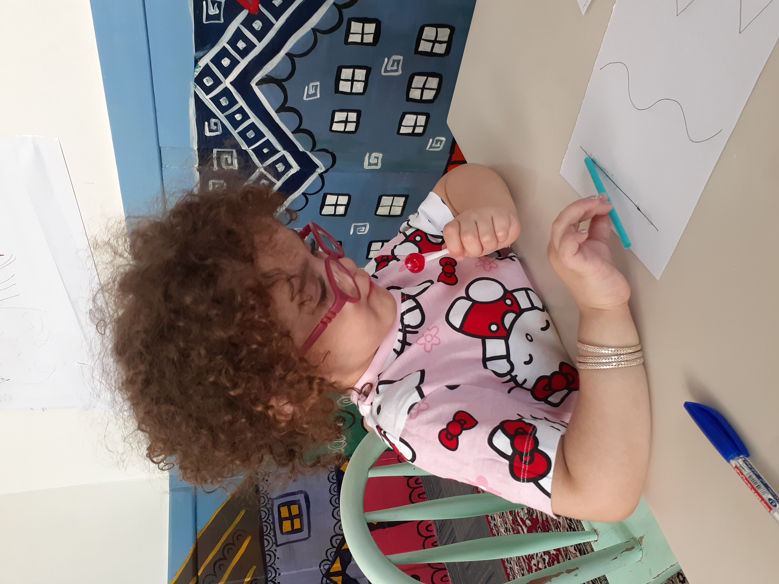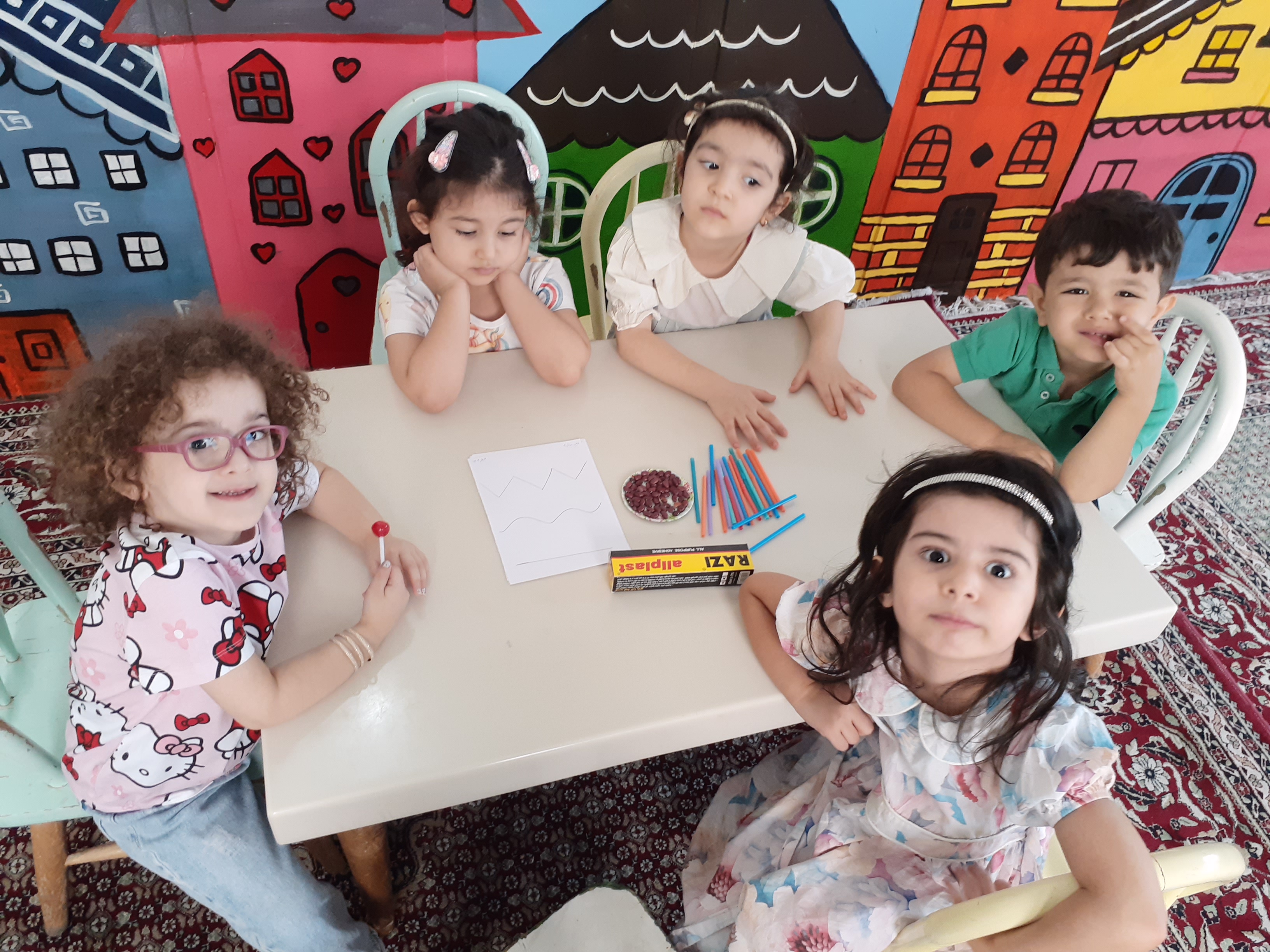 بعد میان وعده ها ،نوبت رسید به کلاژ خط (صاف،خمیده،شکسته) که با تعریف کردن داستانی کوتاه ،بچه ها رو با انواع خط آشنا کردیم.