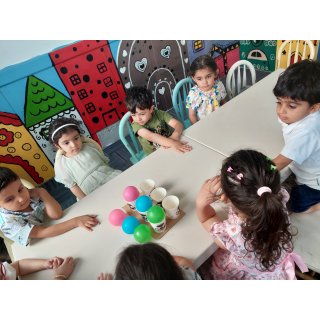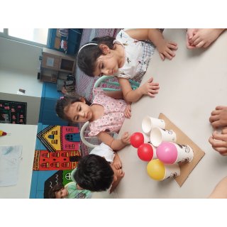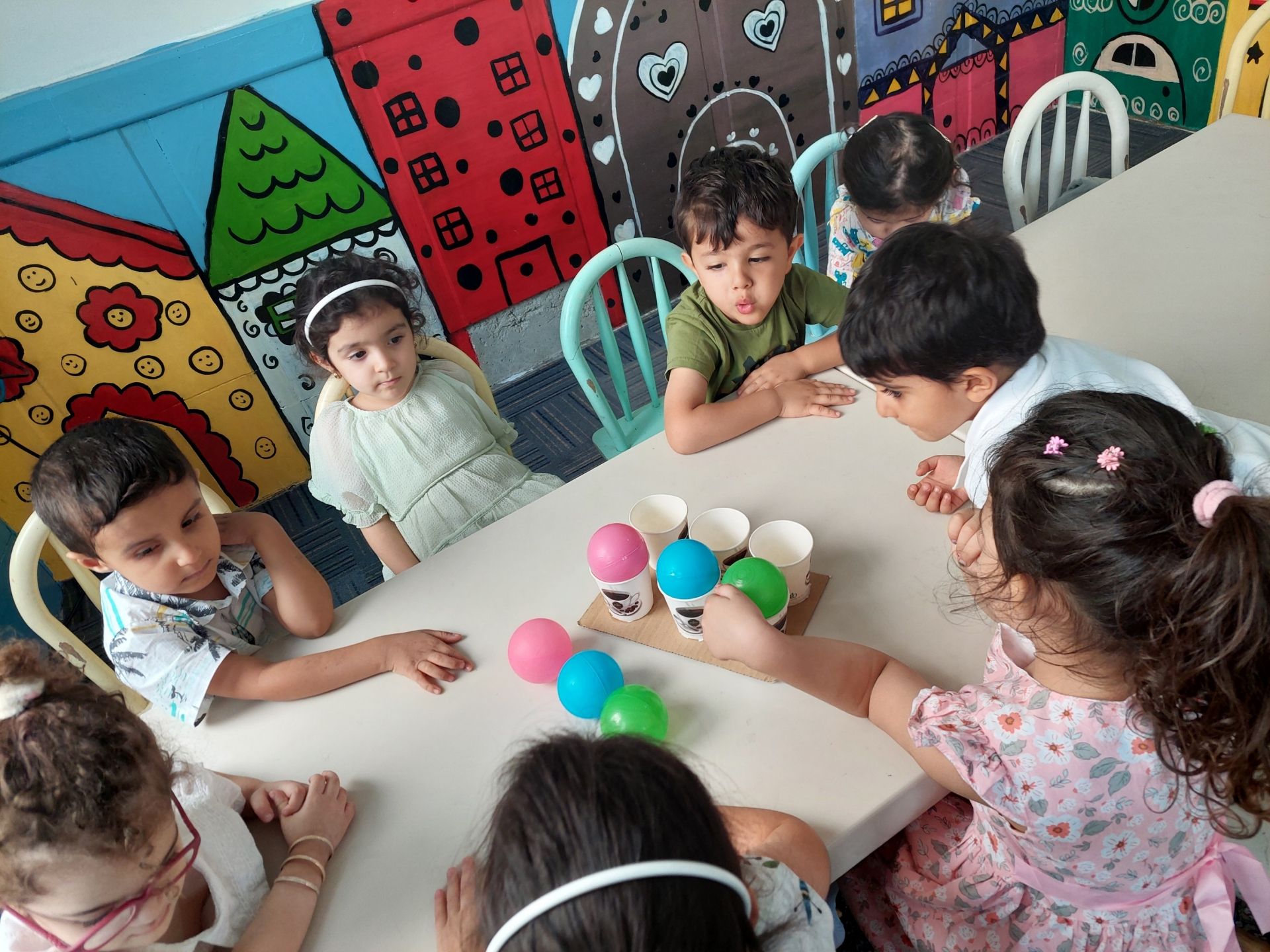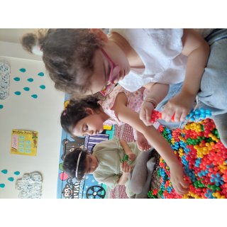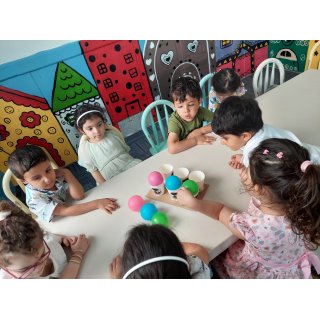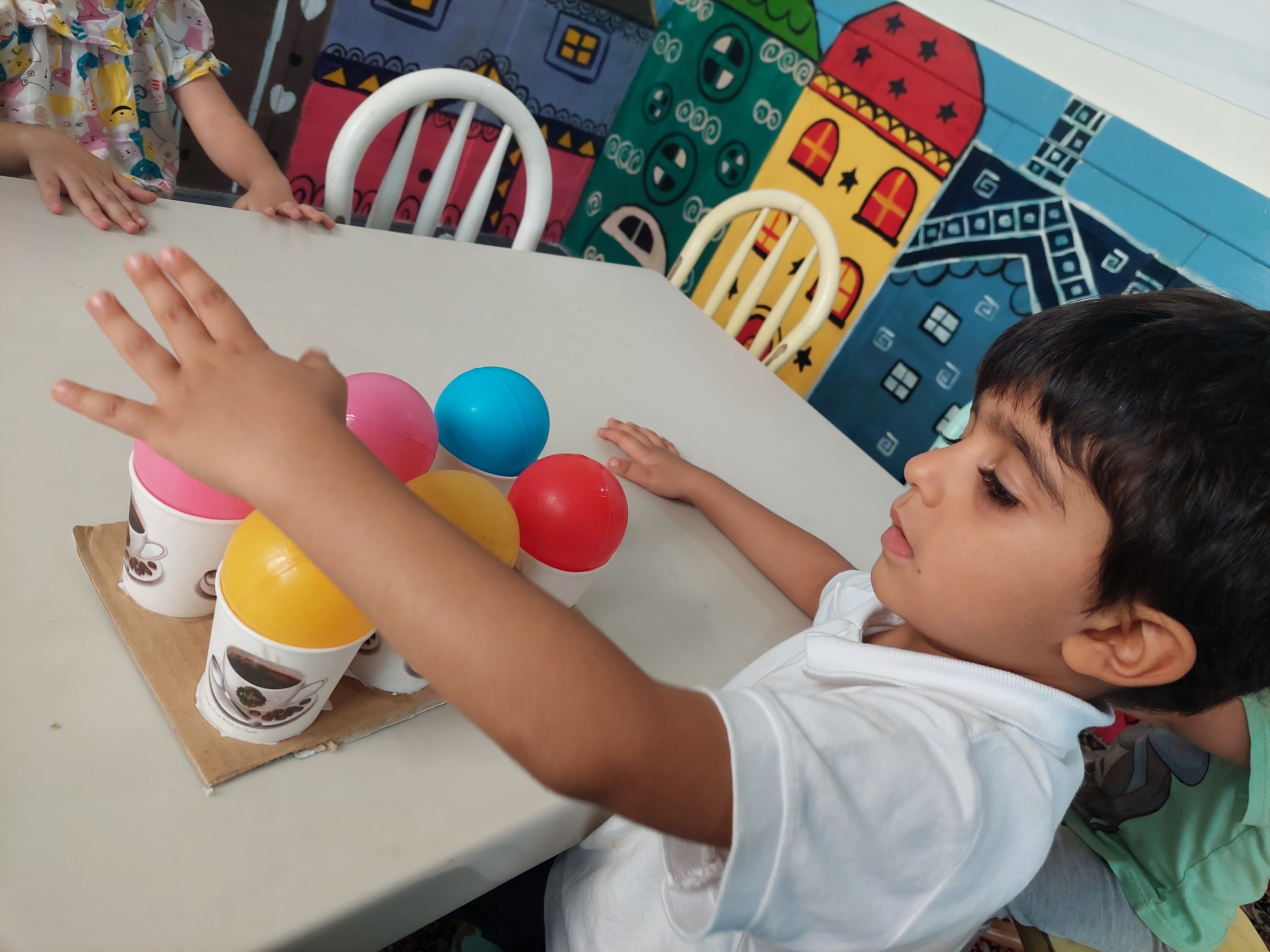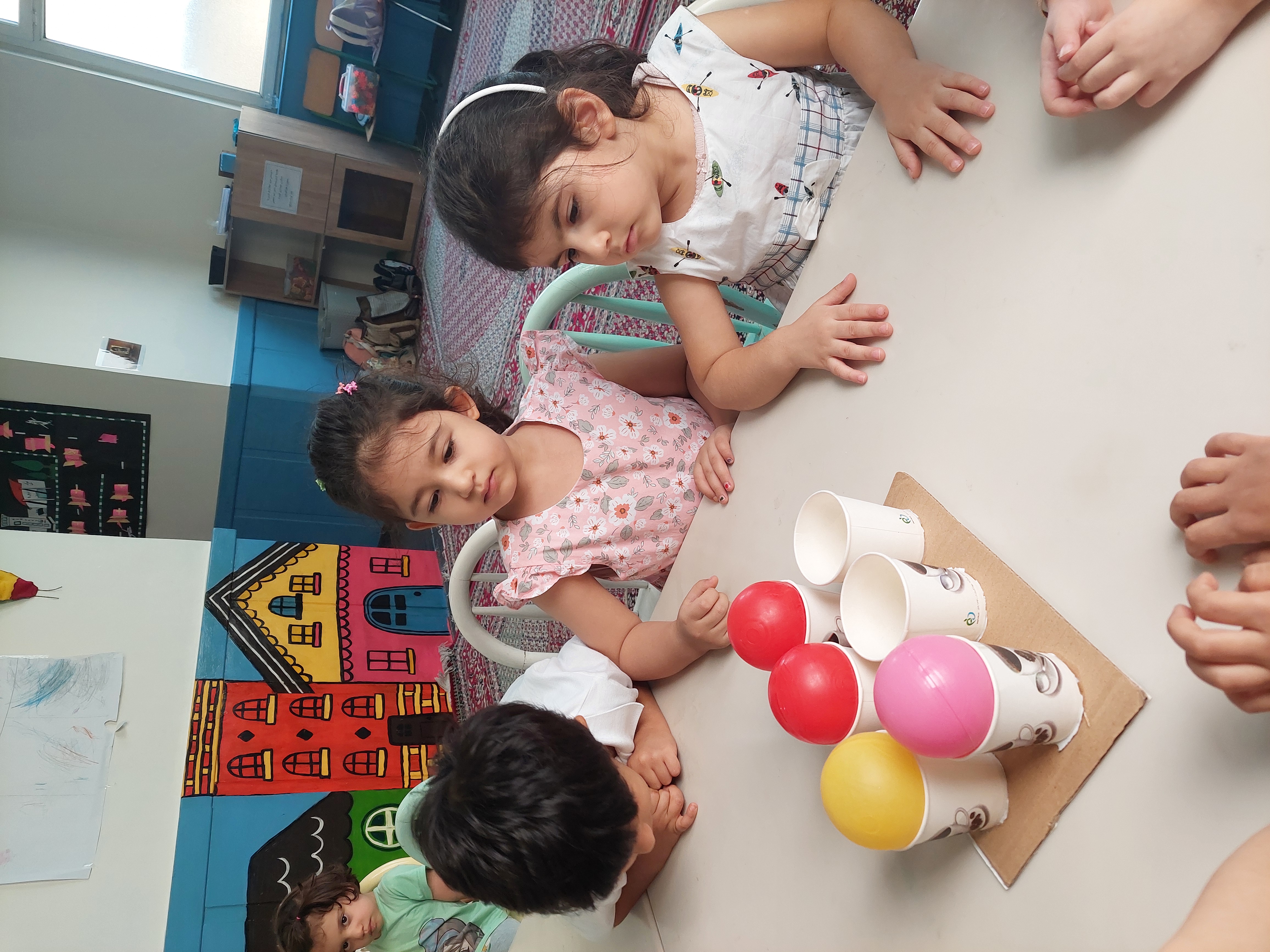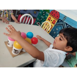 بعد رفتیم سراغ فعالیت لیگ دقتمون، از لاله ها خواستم توپ های رنگی رو طبق الگو روی لیوان ها قرار دهند