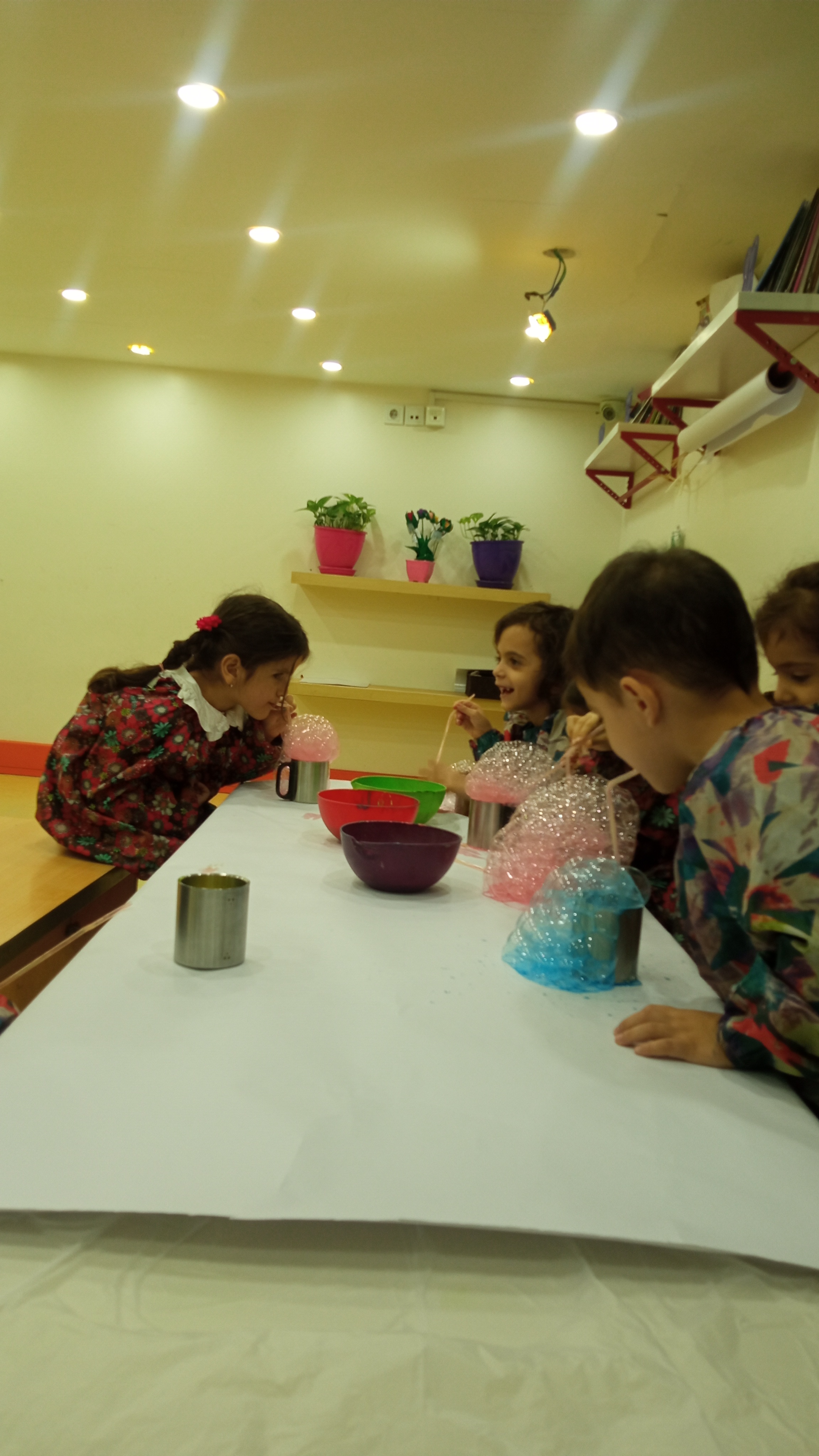 سفره و کاغذ رو پهن کردیم که کلی حباب های رنگی درست کنیم😍بعد هم رنگ هارو قاطی کردیم که بچه ها رنگ جدید بسازن و حباب هاشون جذاب تر بشن🧼