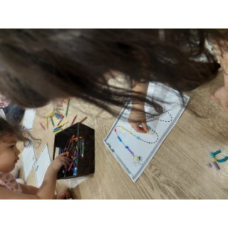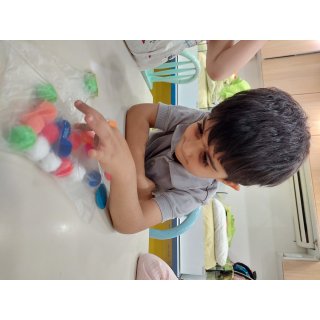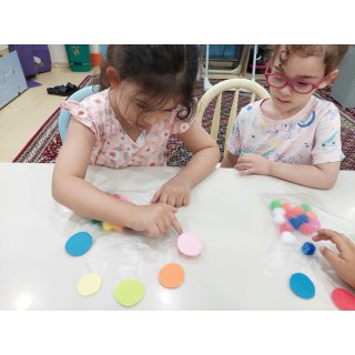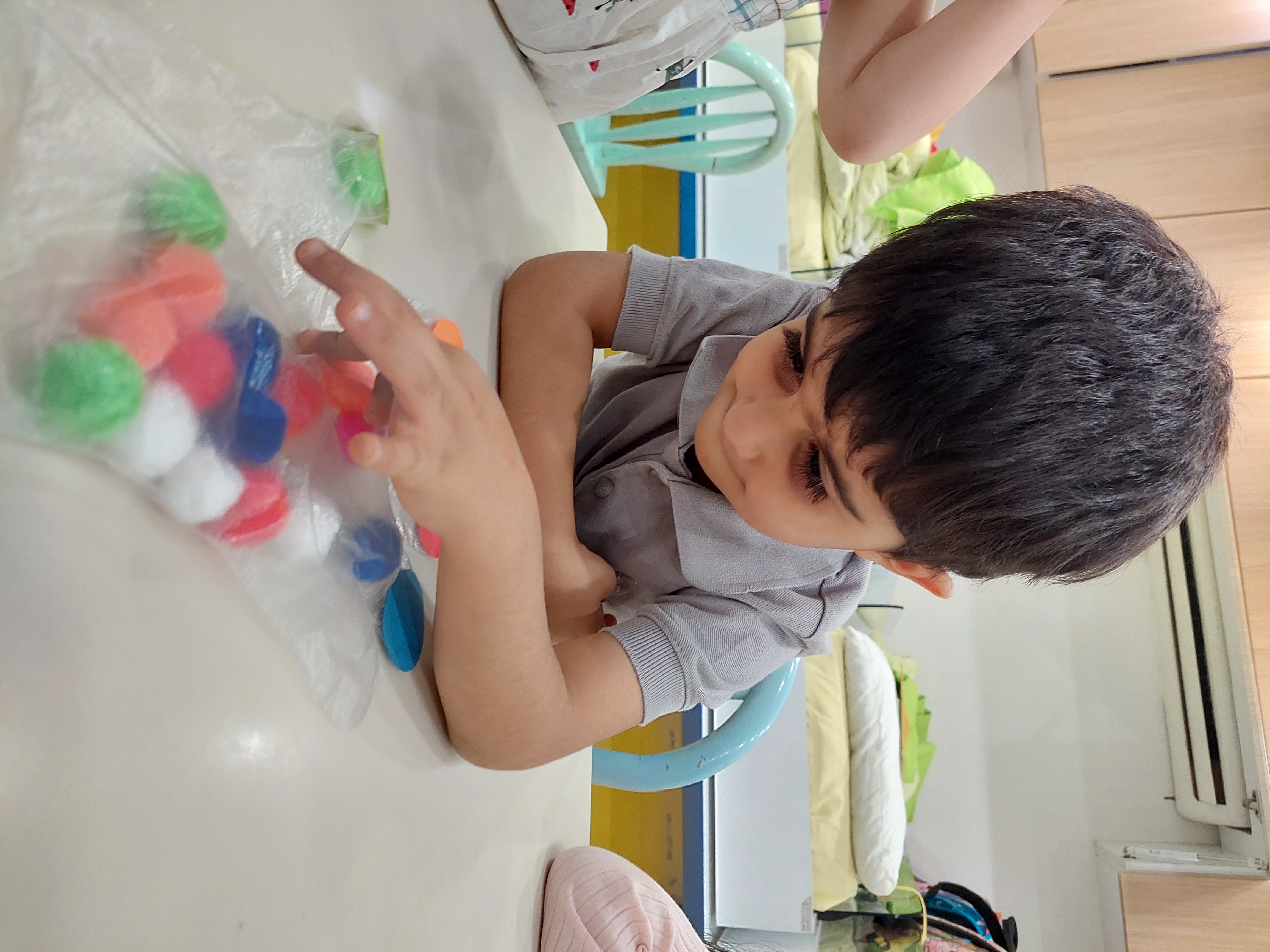 سپس رفتیم کلاس و فعالیت شناخت رنگ ها به وسیله دستکش و پوم پوم رو انجام دادیم