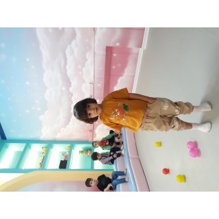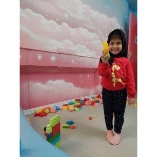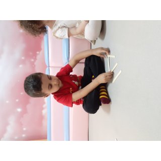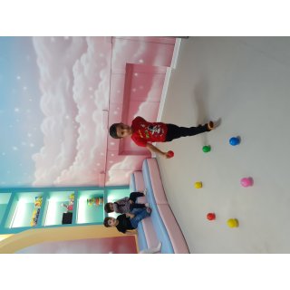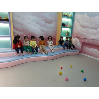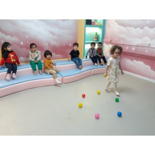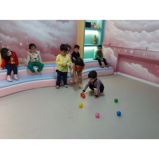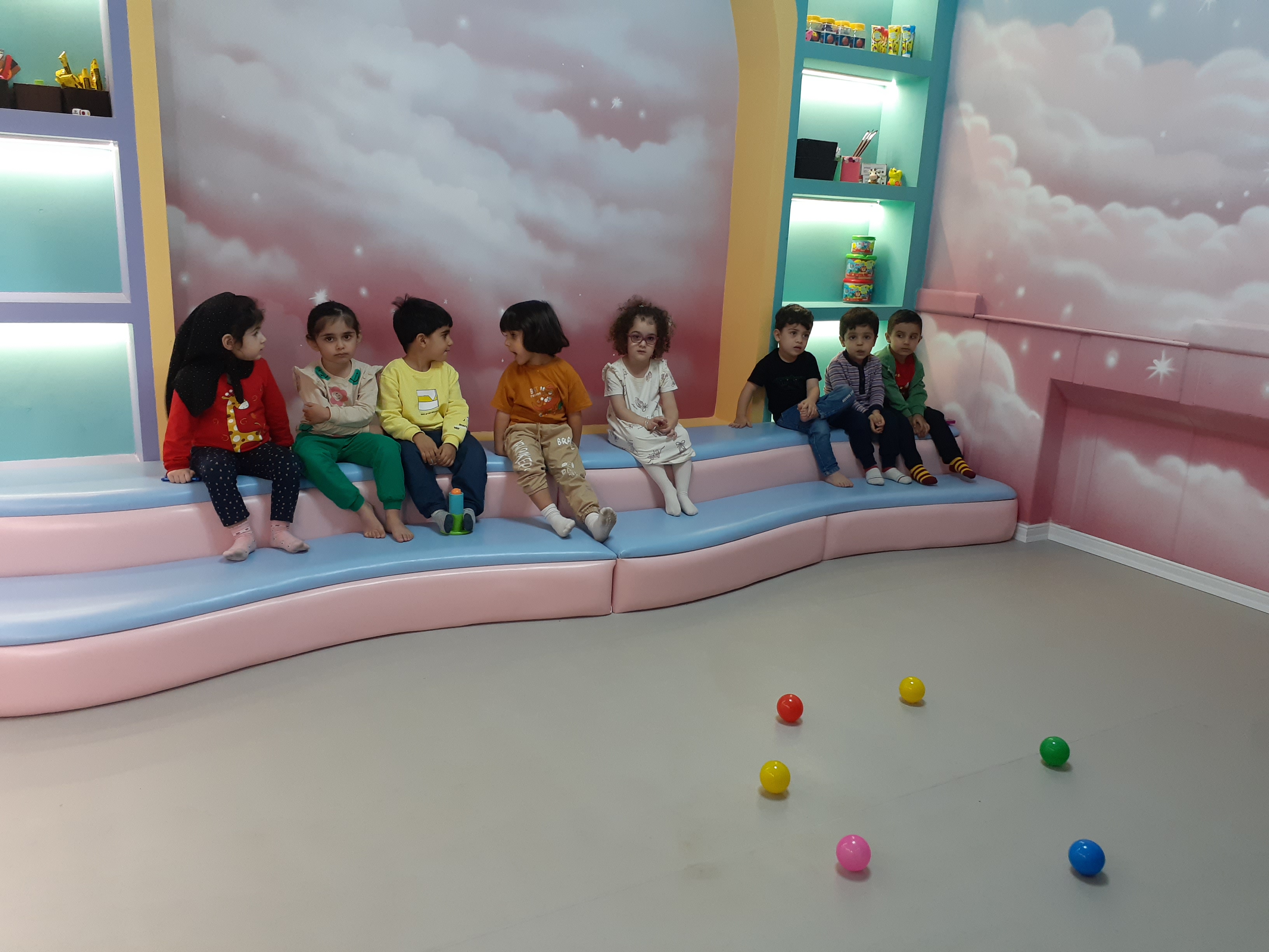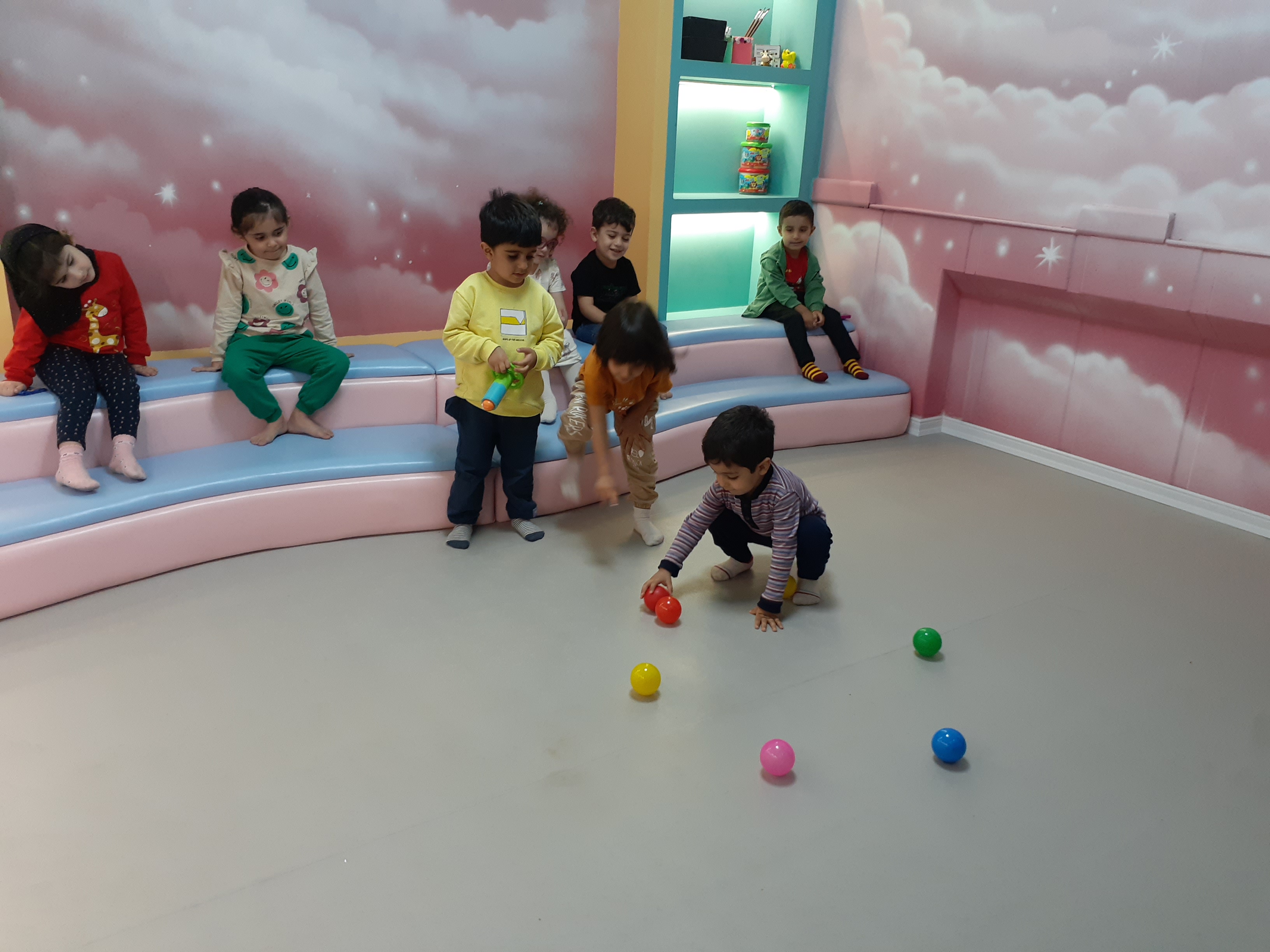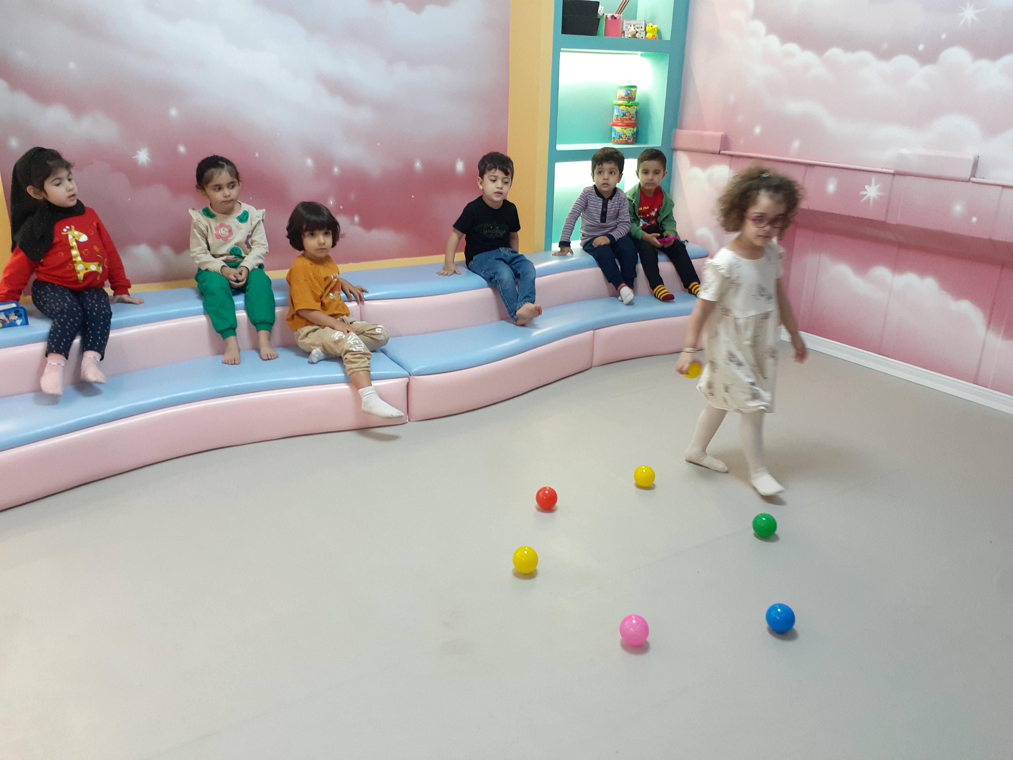 بعدش بازی شناخت رنگ ها داشتیم ،قشنگای خاله با در دست داشتن توپ ،دور دایره ی توپ های رنگی می گردند و بعد از تشویق و ایستادن توپی که دستش بود را پیش رنگ خودش می گذارند.