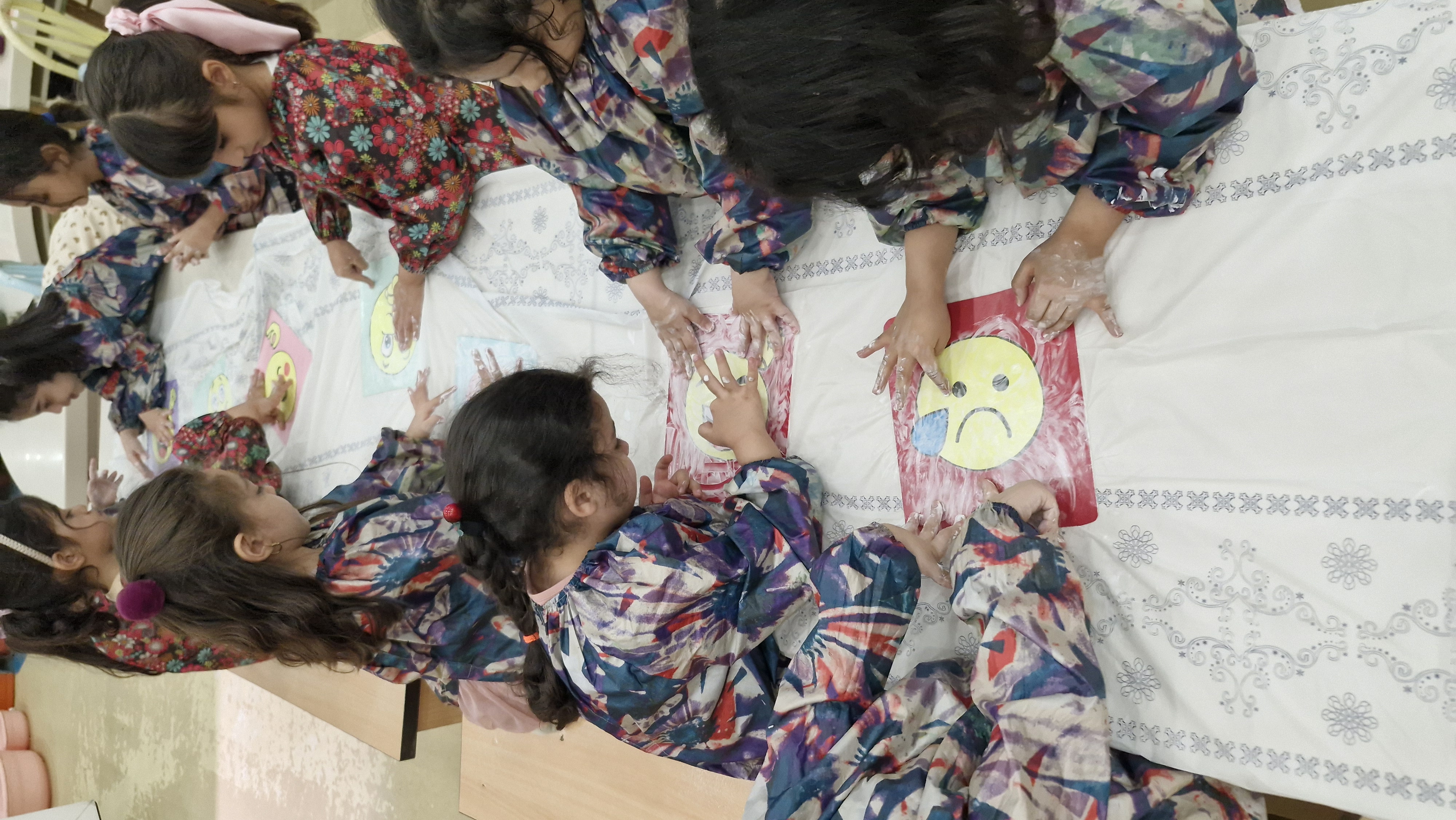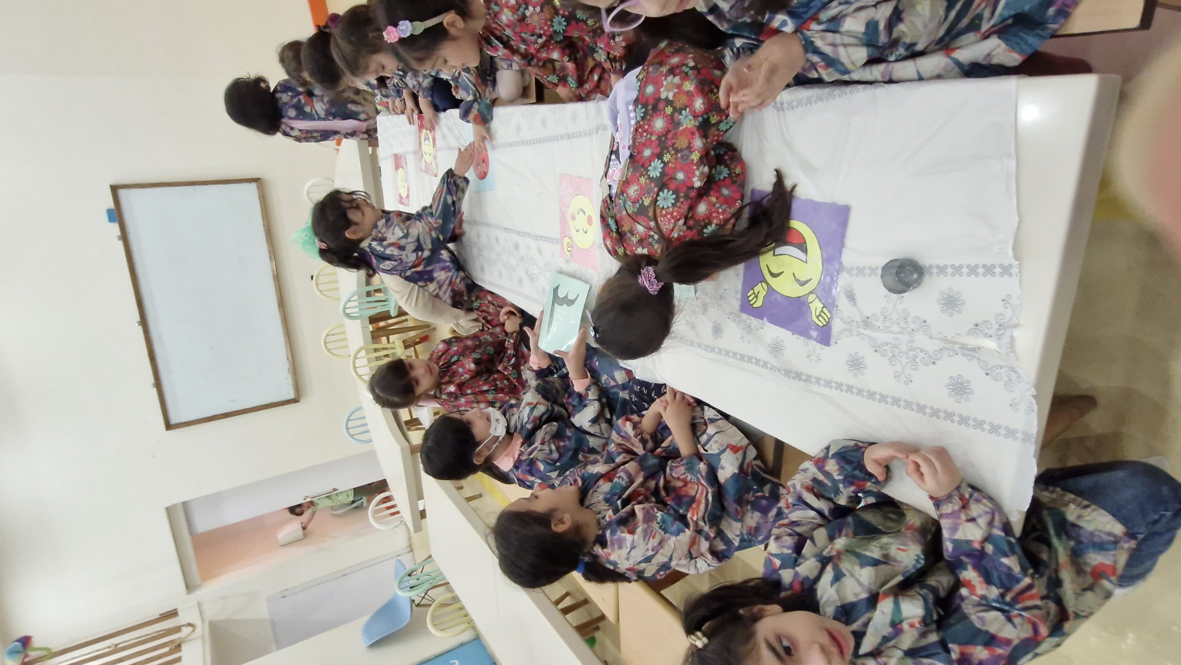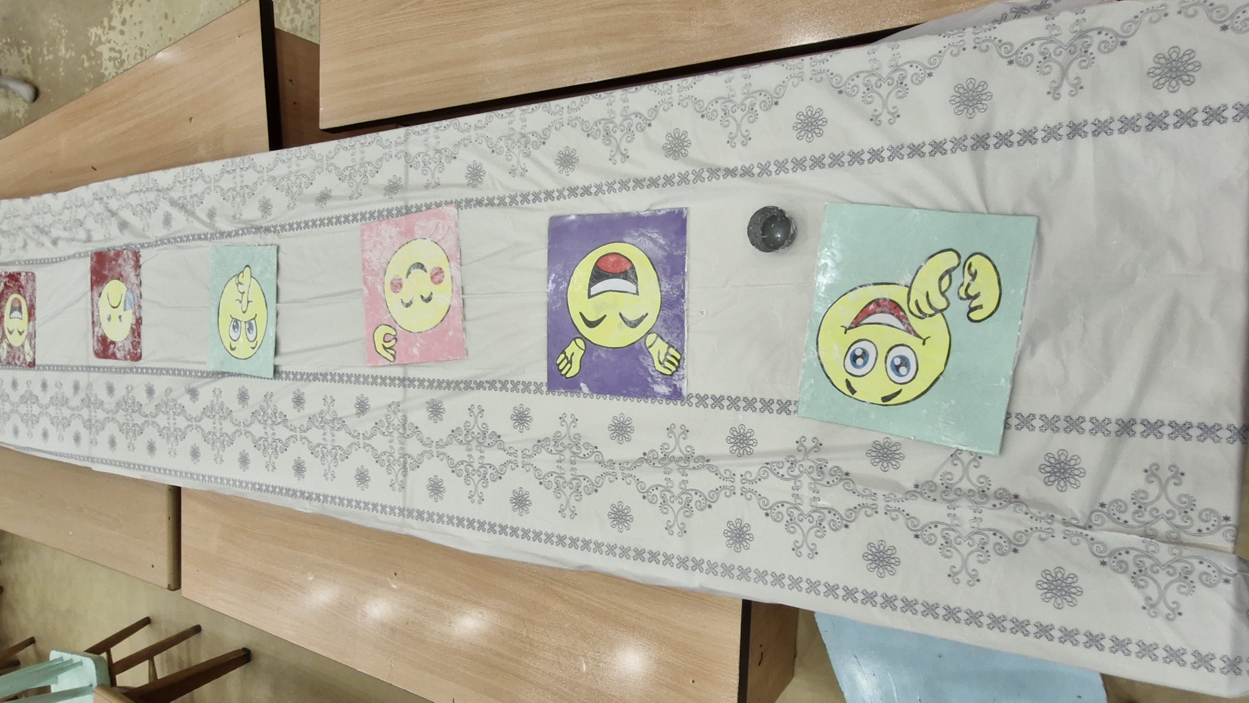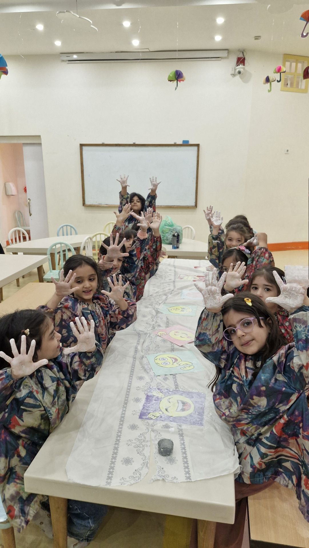 در این کلاس تصاویر اشکال احساسات مختلفی روی میز گذاشته شده بود و ما با برف شادیهایی که خاله روی تصاویر ریخته بود شکلهای مختلف درآوردیم