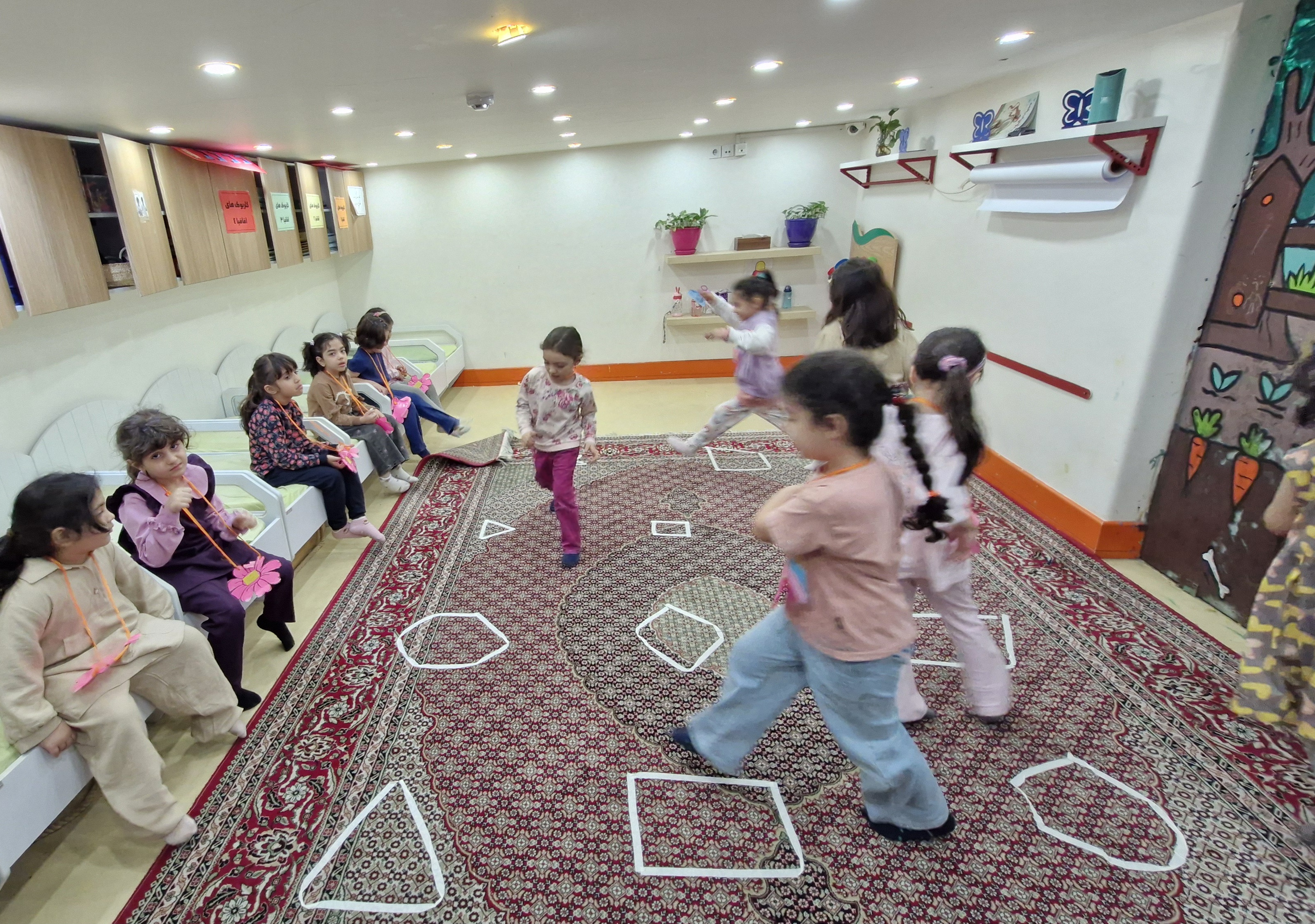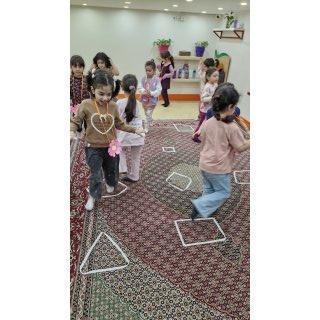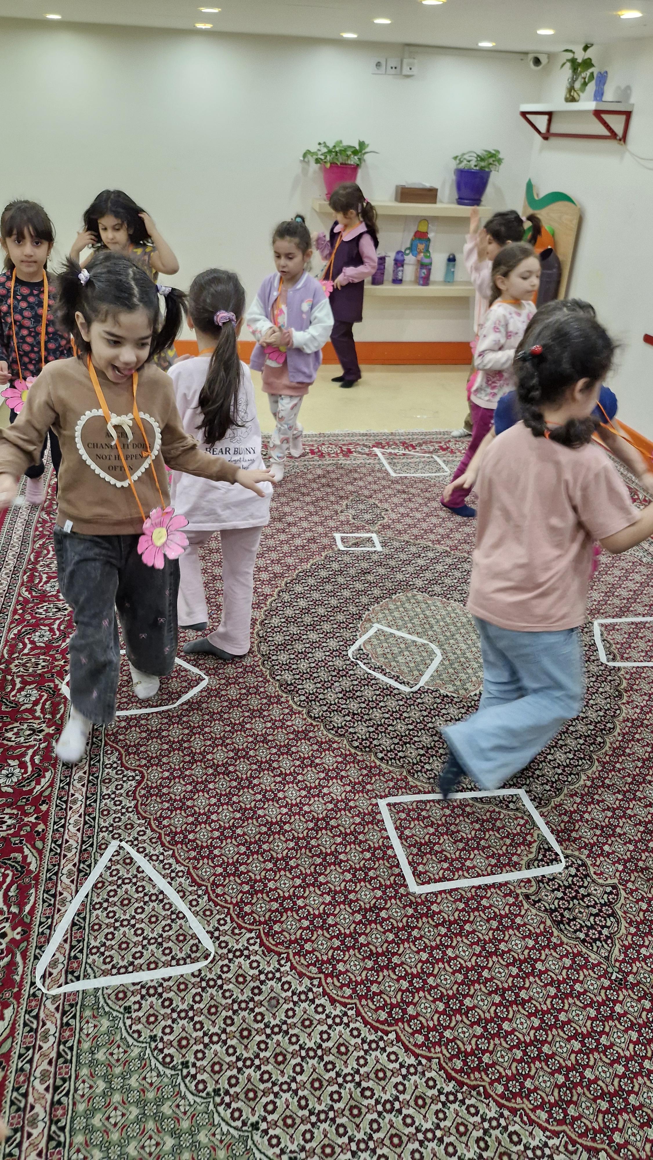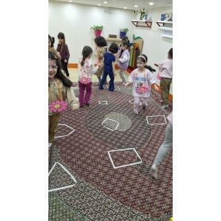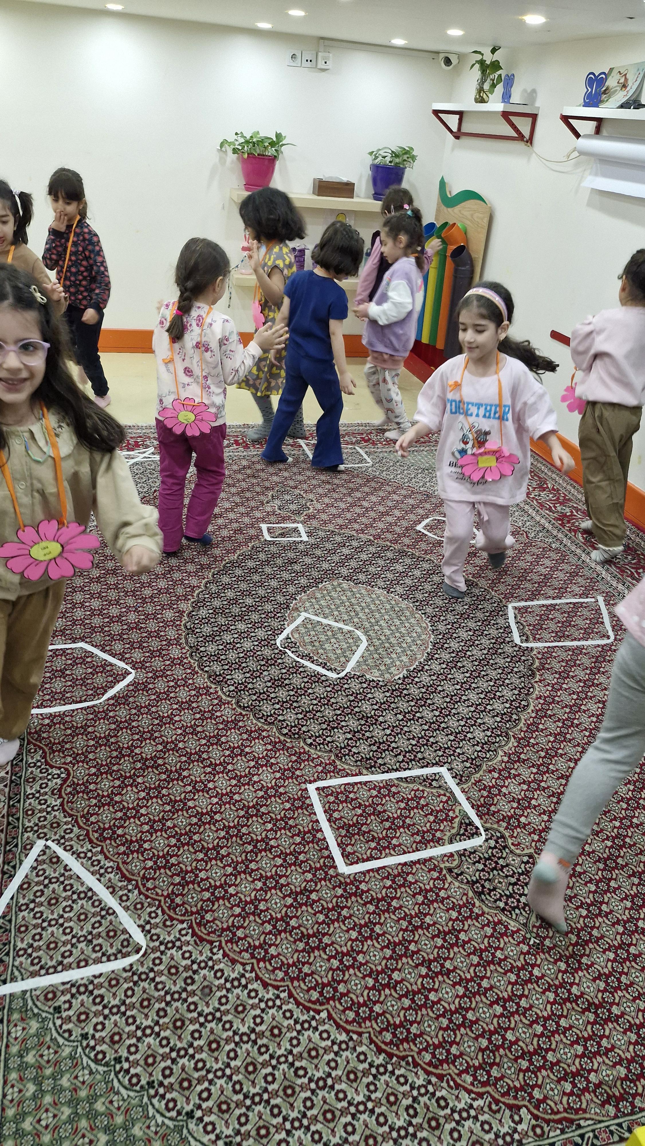 🌸کلاس اولی که داشتیم باید در کلاس میدویدیم و و با قطع شدن آهنگ داخل شکلهایی که روی زمین آماده شده بود میایستادیم و اگر کسی با تاخیر یا روی زمین یا فرش ایستاده بود و یا اگر خاله گفته بود روی یک پا بچهها بایستند و اشتباه بود فرد مینشست و بازی ادامه پیدا میکرد تا ۱ تا دو نفر هنوز ایستاده بودند