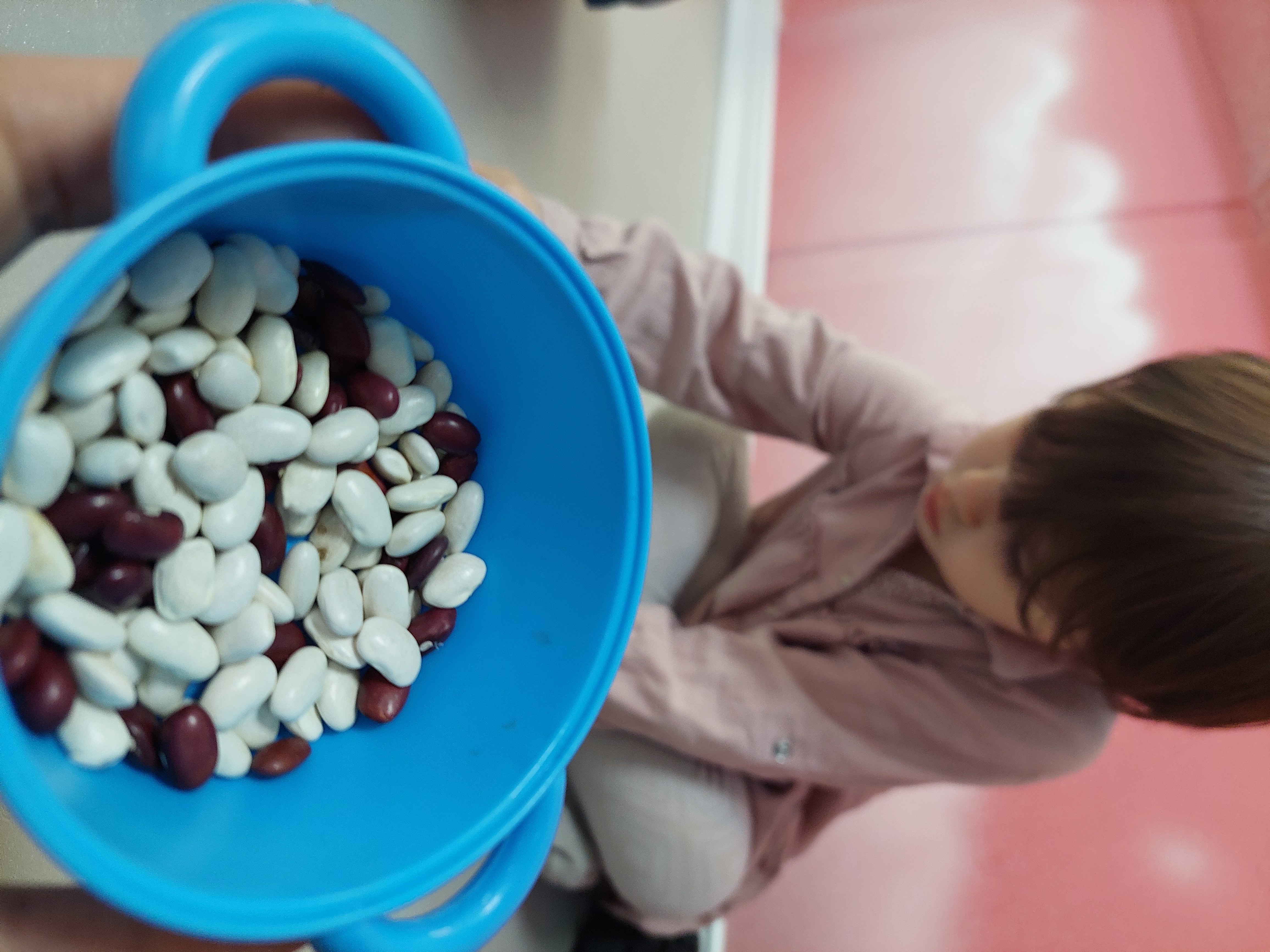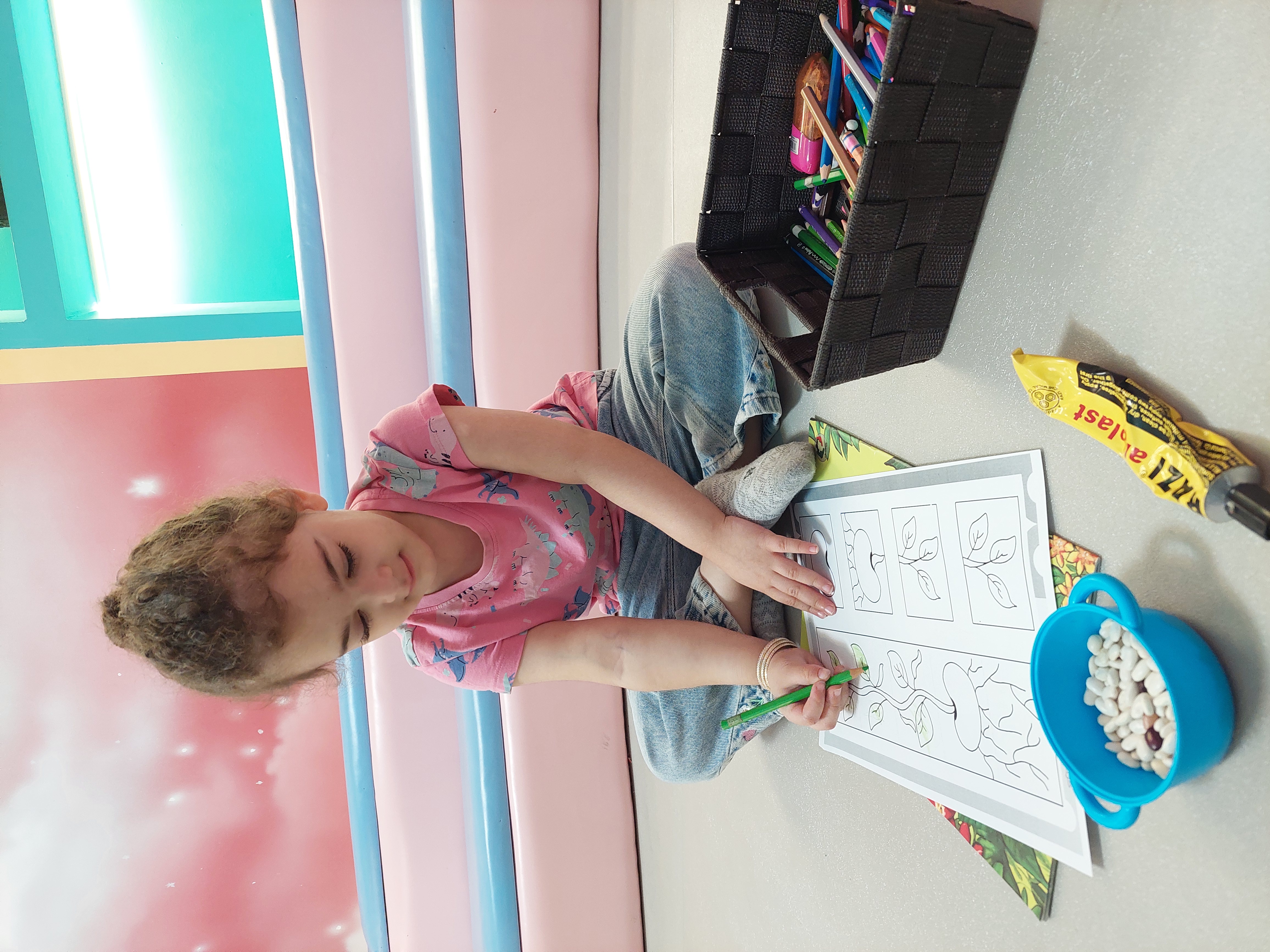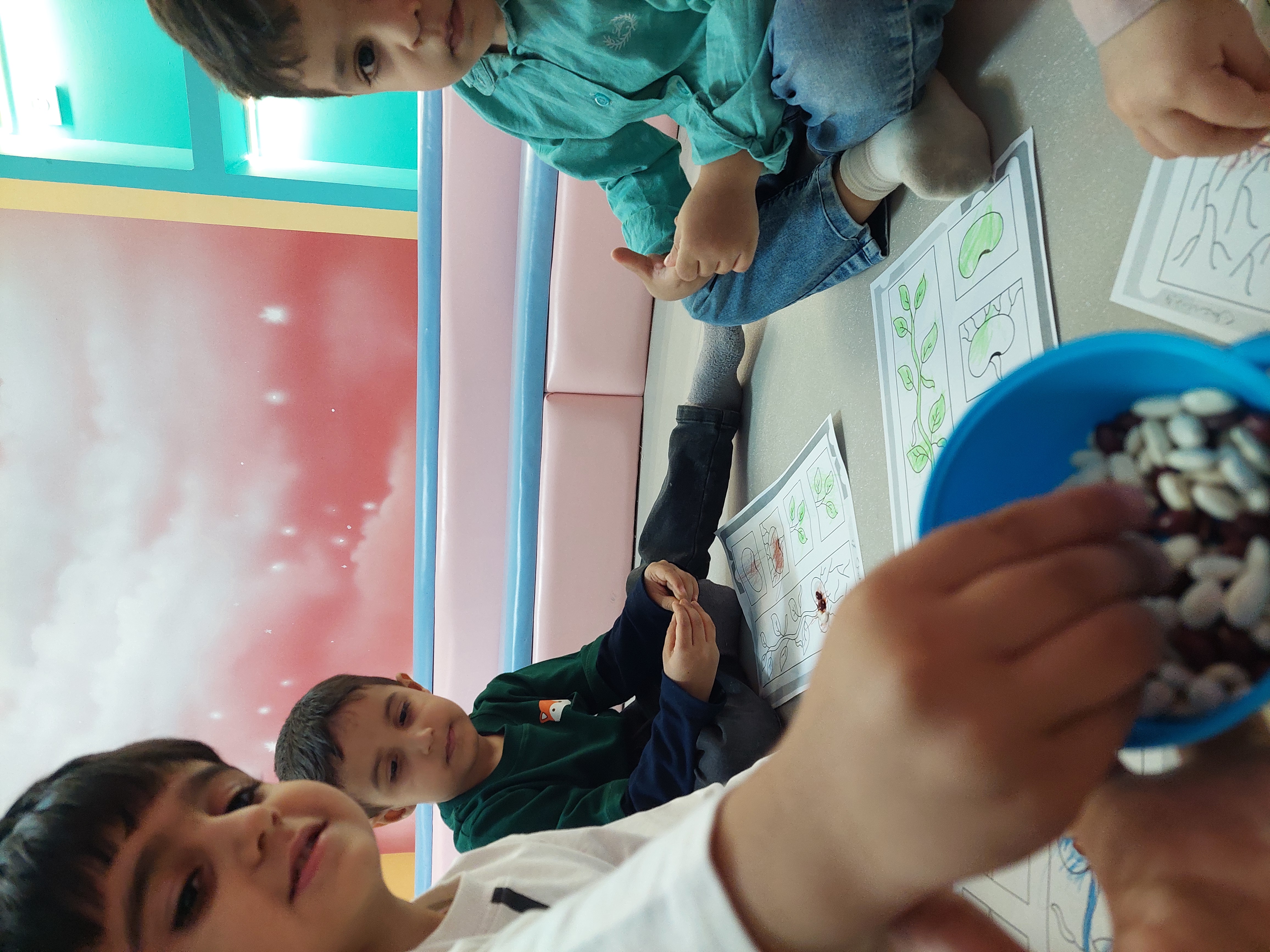 بعد رفتیم سراغ فعالیت پژوهشمون که درمورد رشد لوبیا بود، ابتدا کاربرگ مربوطه رنگ آمیزی شد سپس دانه های لوبیا را به صورت کلاژ بر روی لوبیاهای کاربرگ چسباندیم🌱