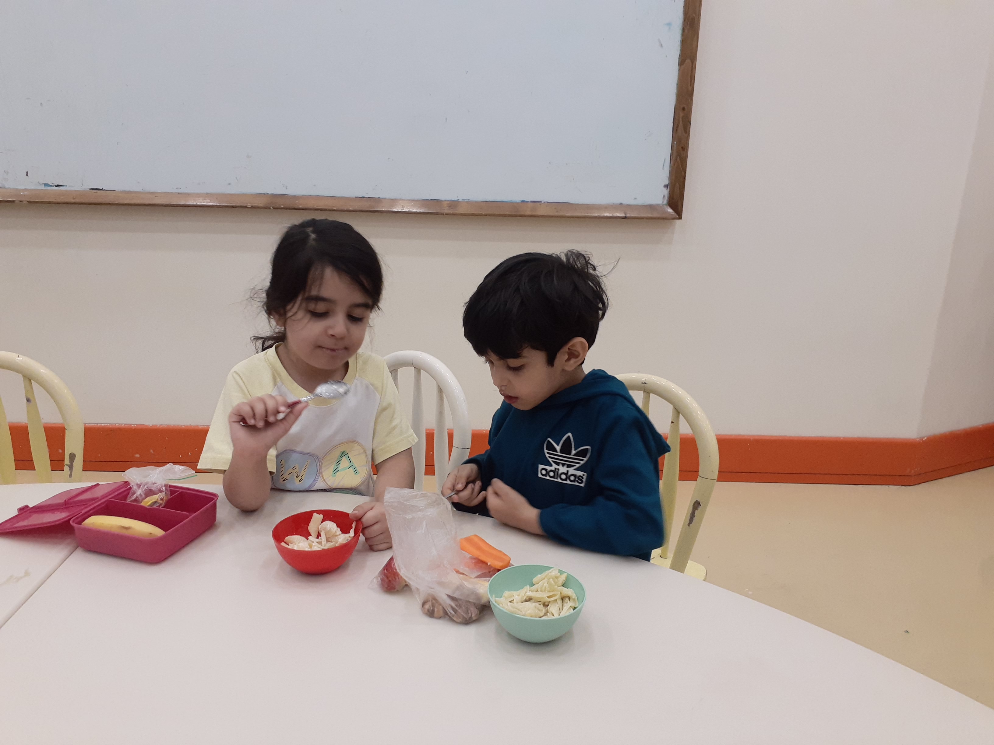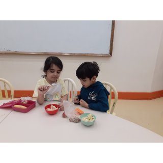 نوبت رسید به میان وعده : بعد از شستن دست هامون ( سالاد ماکارونی ) میل کردند و خوراکی های خوشمزه شون 😋