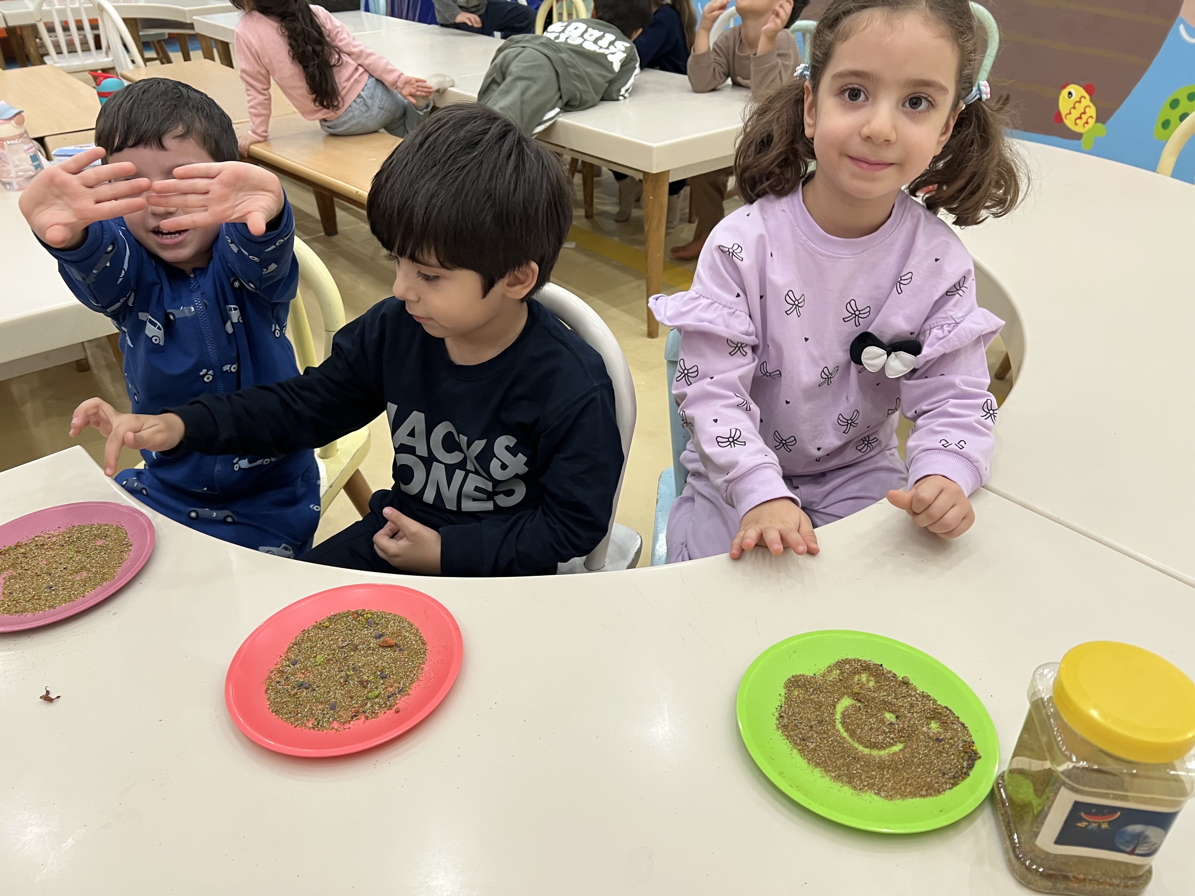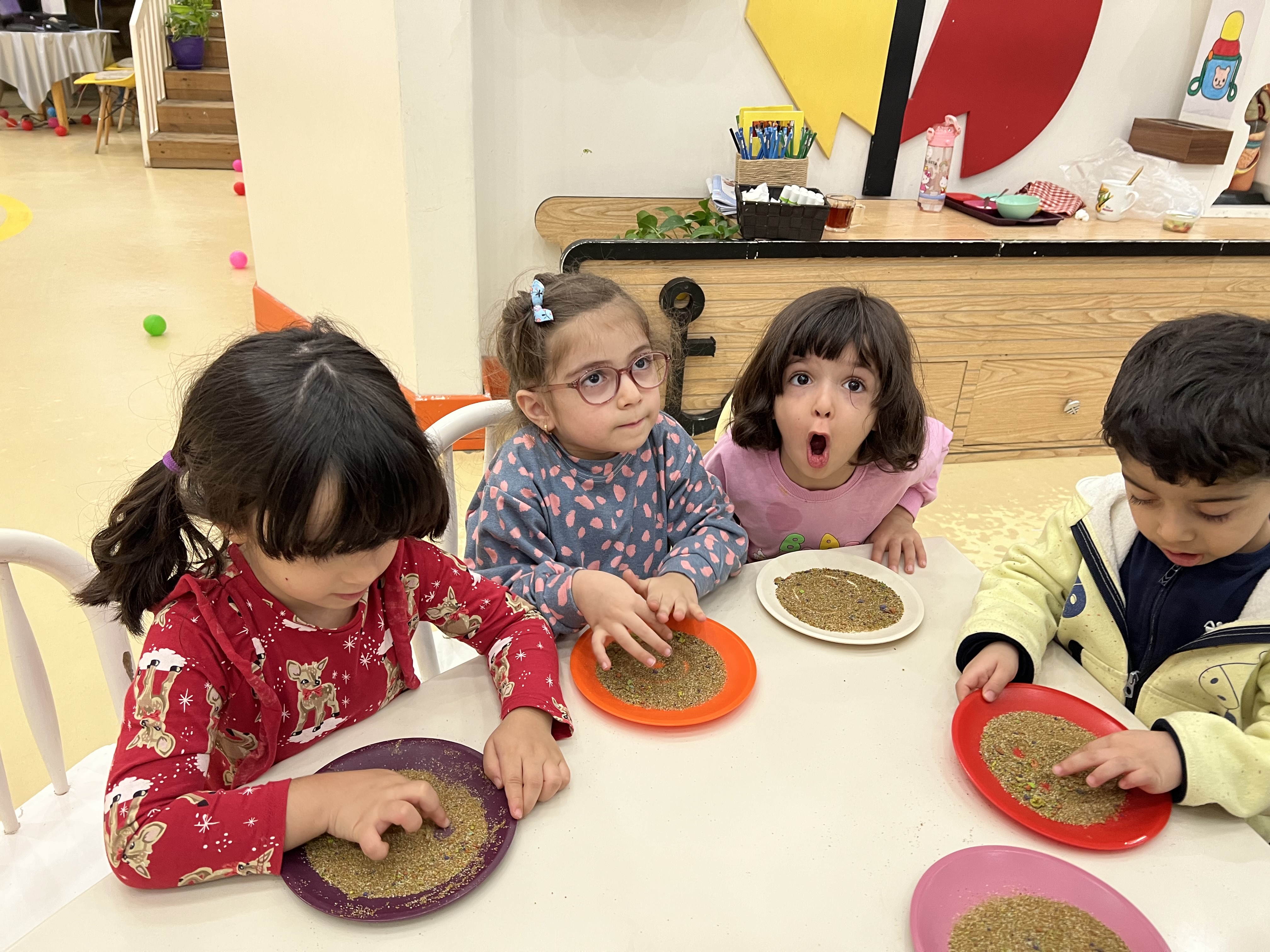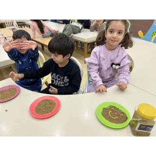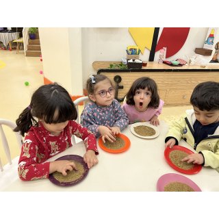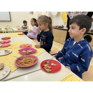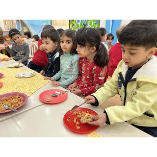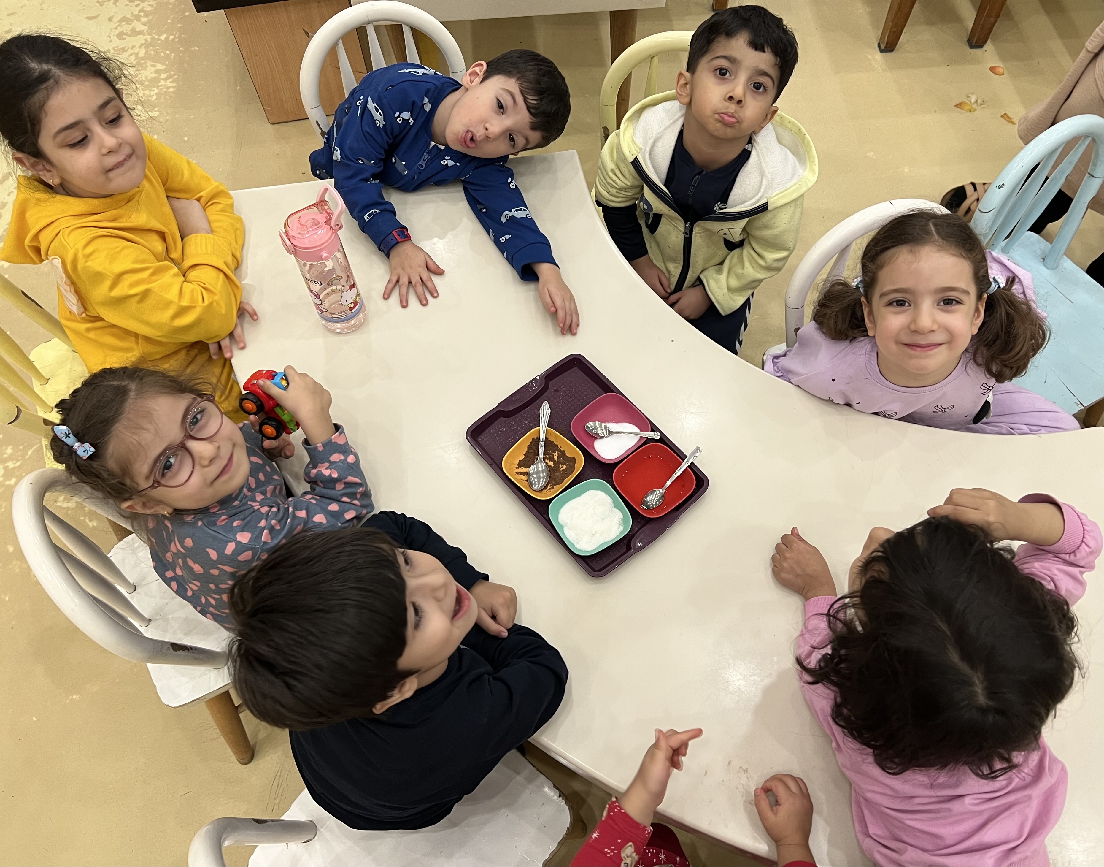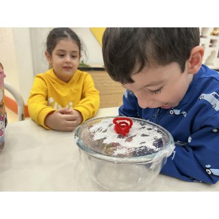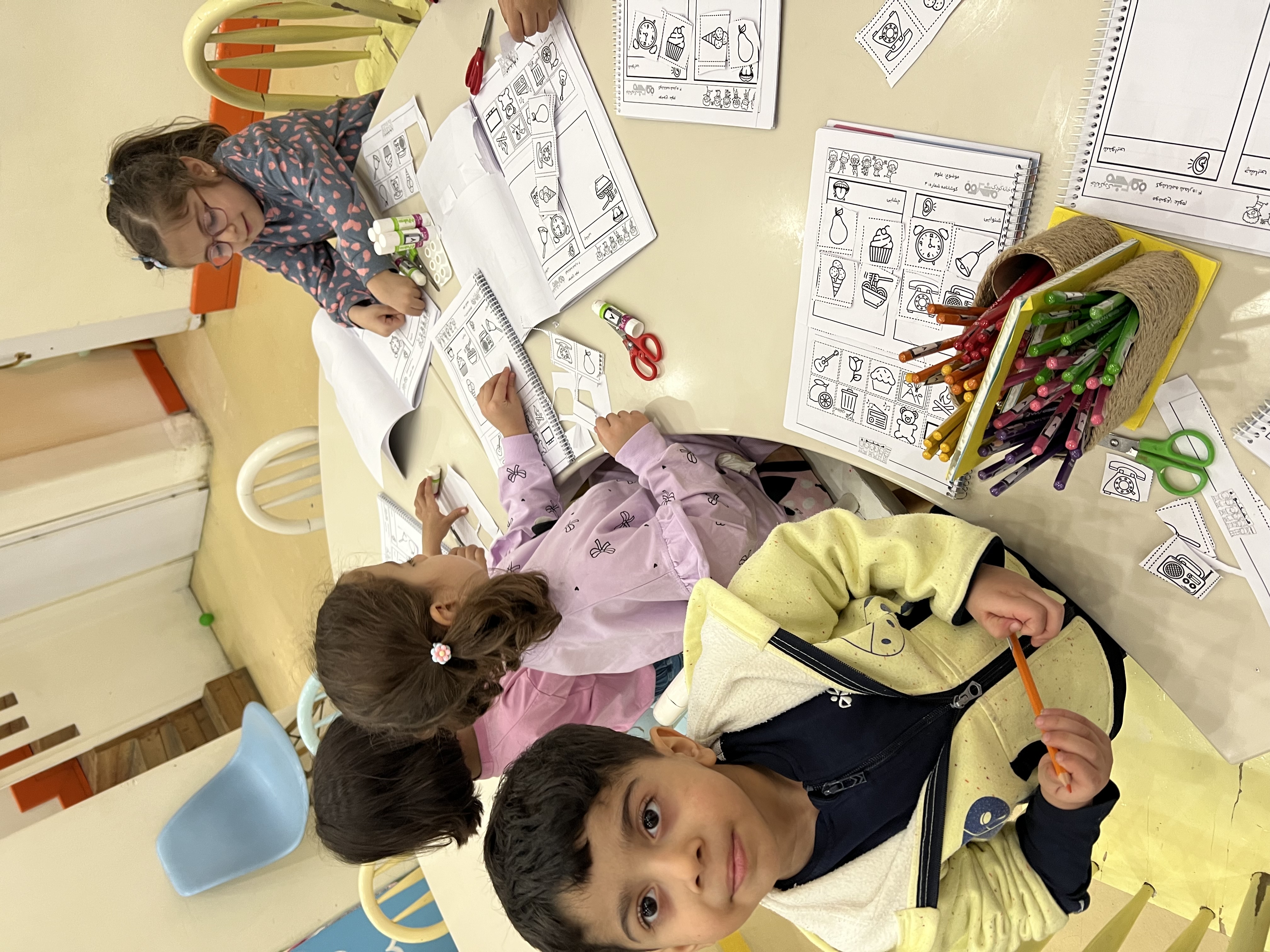 کلاس کاوشگران کوچک که با آزمایش، حس شنوایی🦻🏼 رو شناختیم و با تست یه سری خوراکی با حس چشایی👅 آشنا شدیم و کوشانامه علوم رو کار کردیم.
