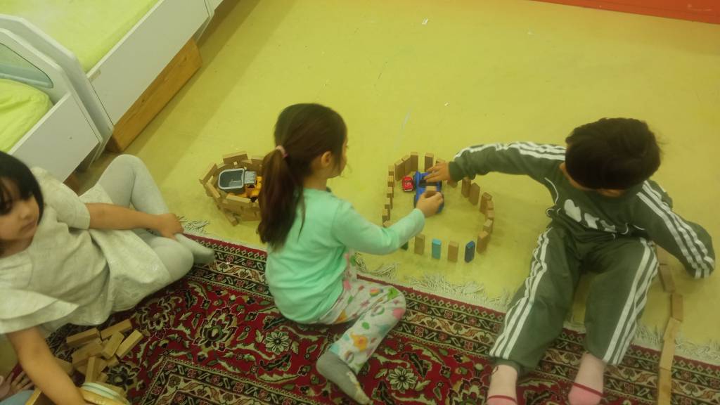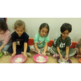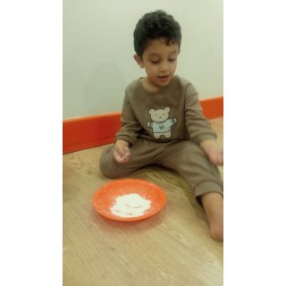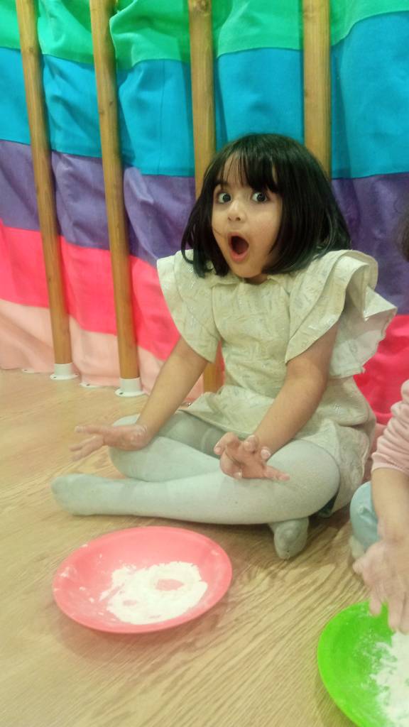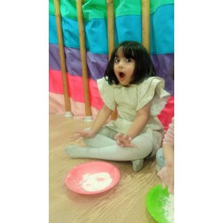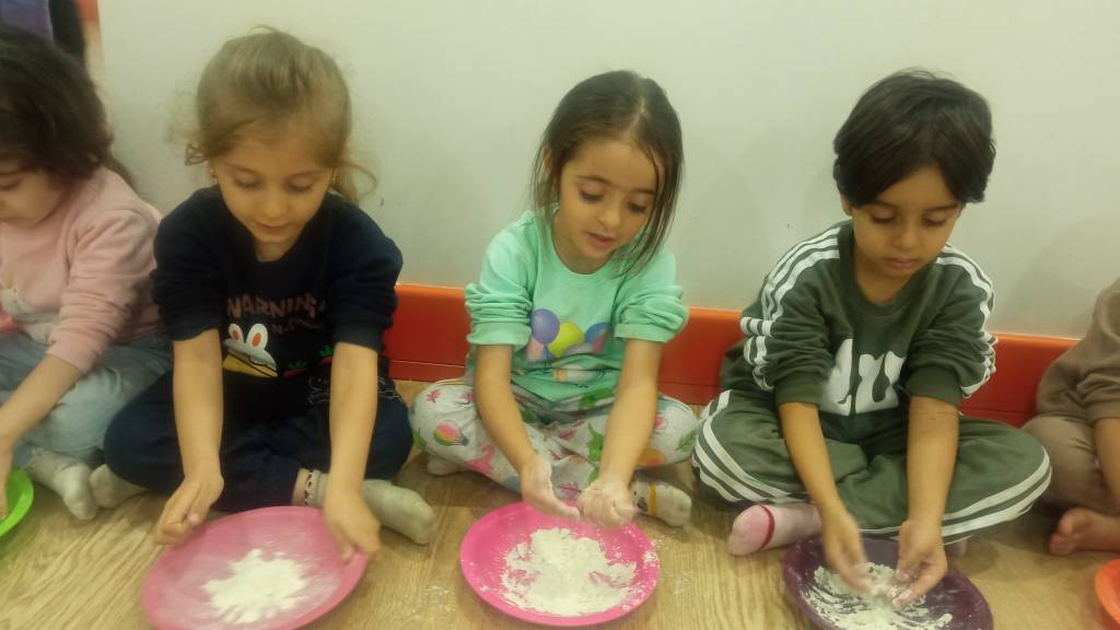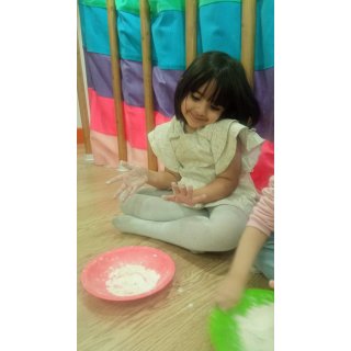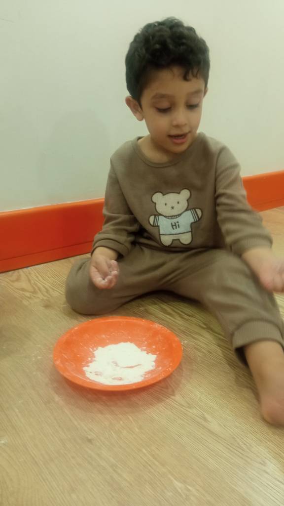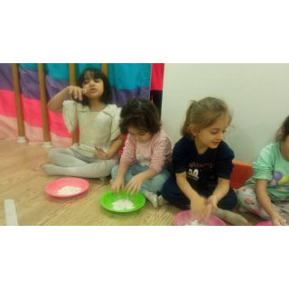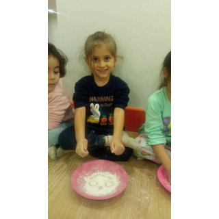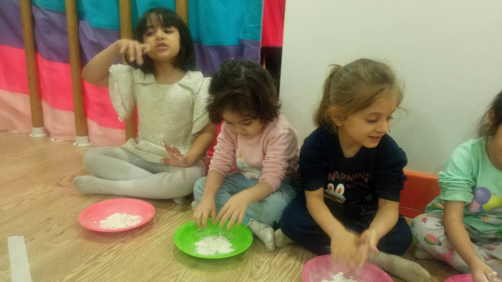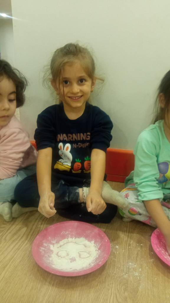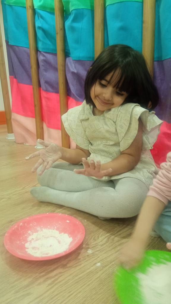 حالا که خوب انرژی گرفتیم وقت کلاس شهرک خمیر و دست ورزی بود که ظرف آرد داشتیم و احساساتمون رو نشون دادیم و لذت بردیم😄