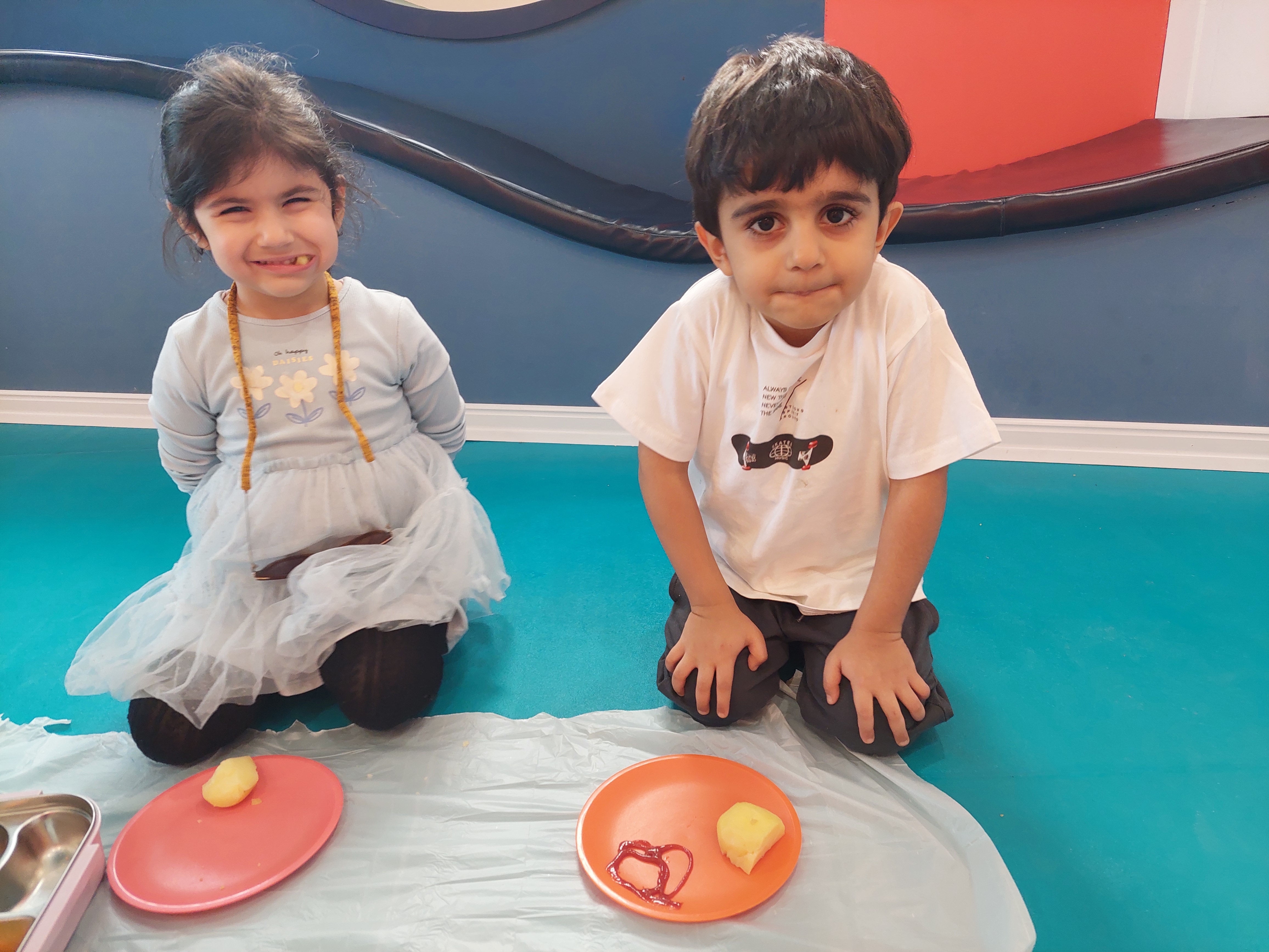 بعد نوبت رسید به میان وعده بچه ها که سیب زمینی با سس کچاپ بود😋🥔