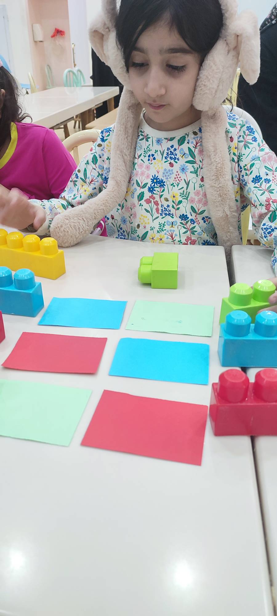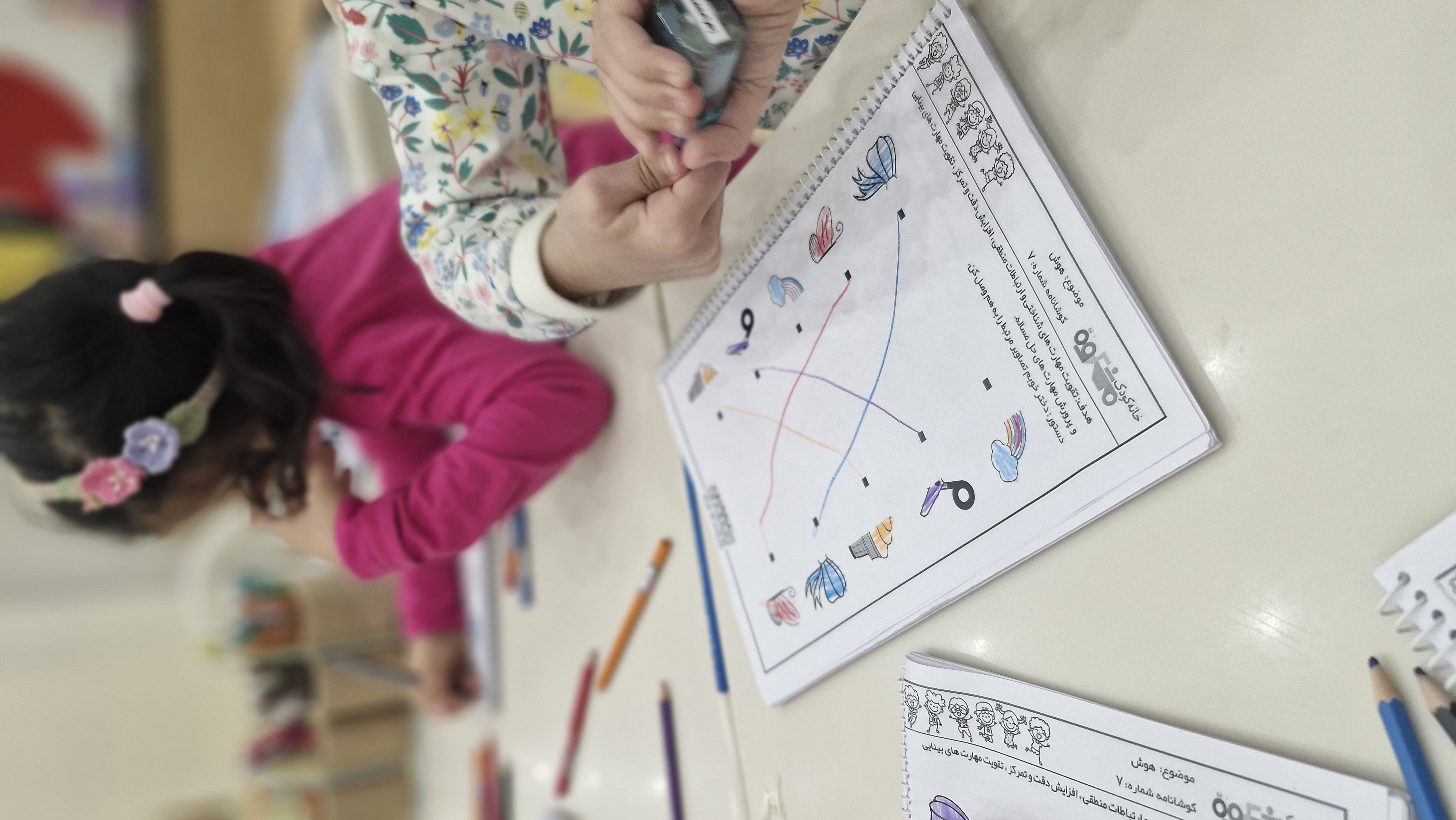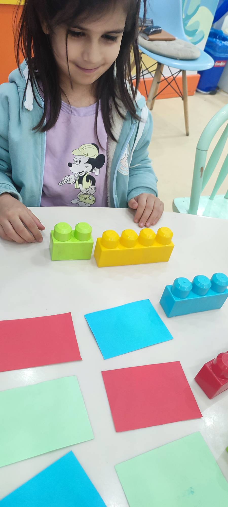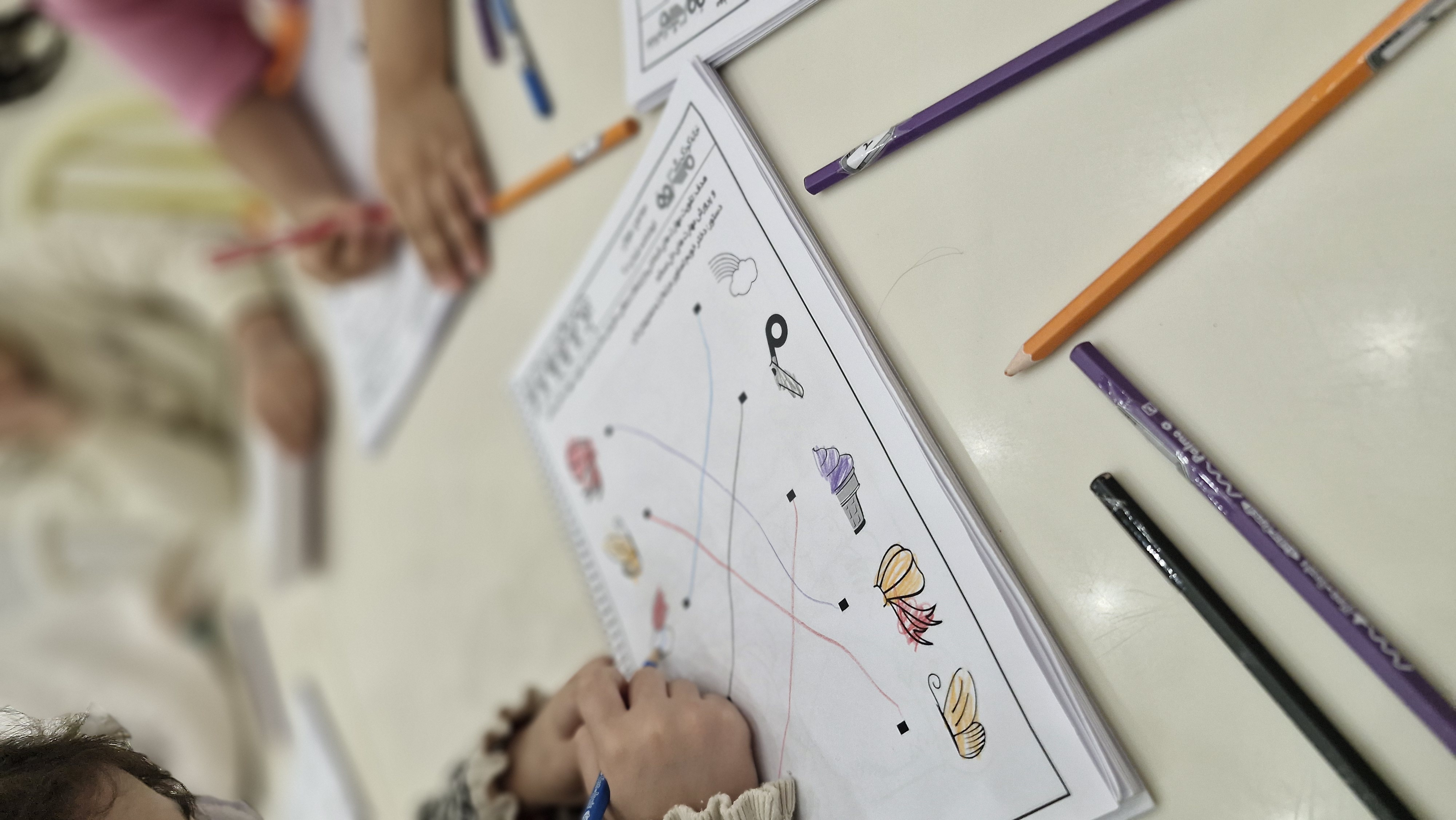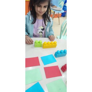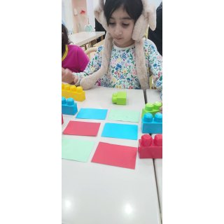 با خاله زینب کاربرگ حل کردیم( نیمه های هر شکل را به هم متصل باید میکردیم)💔 و با خاله زهرا : تعدادی کاغذ رنگی به صورت رندم و متفاوت در دو ستون چیده شده بود تعدادی لگو هم پایین این ستونها بود و باید همزمان با دو دست لگوهای رنگی را برمیداشتیم و کنار کاغذ رنگی همان رنگ می گذاشتیم 🤔