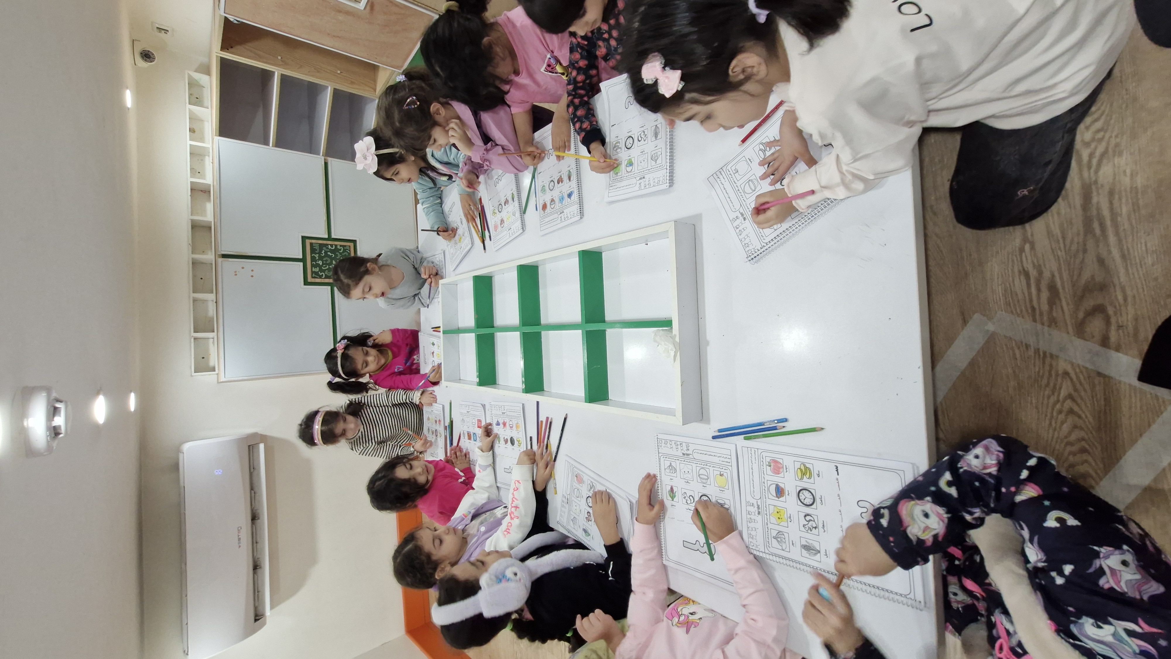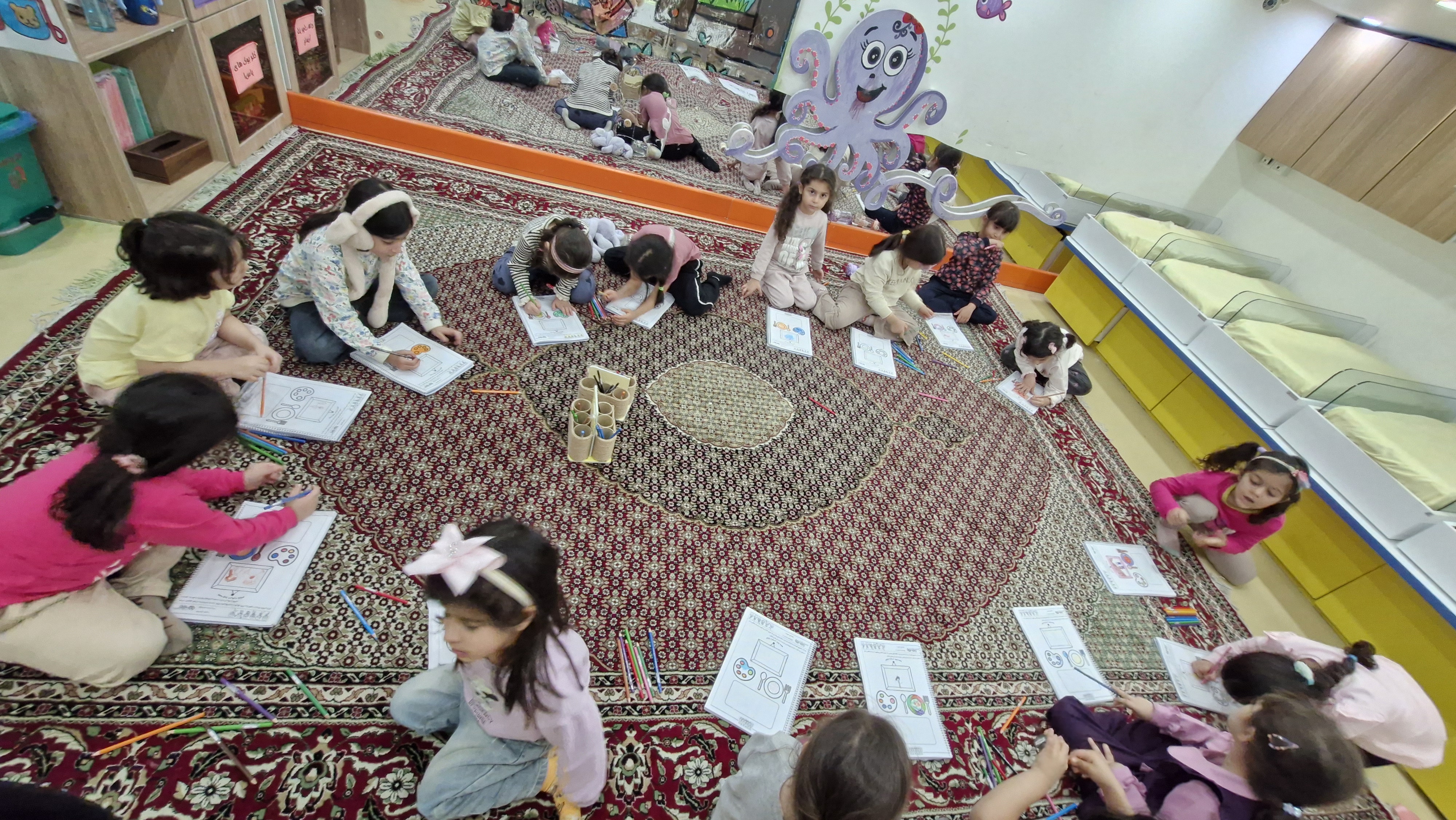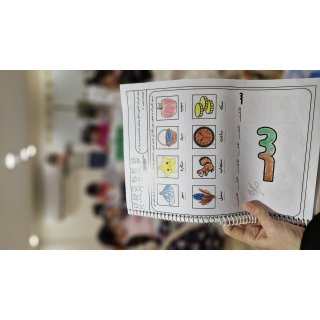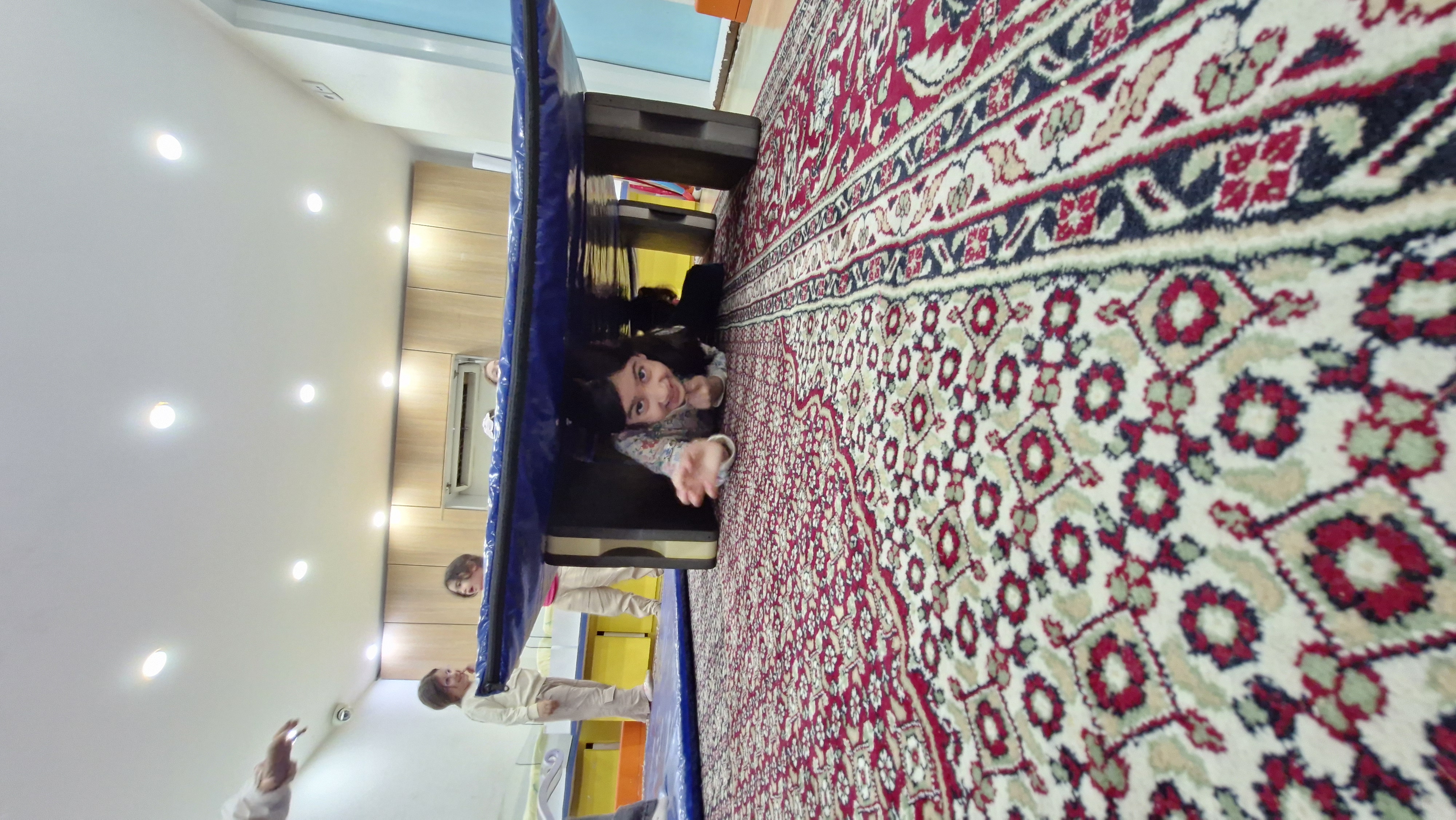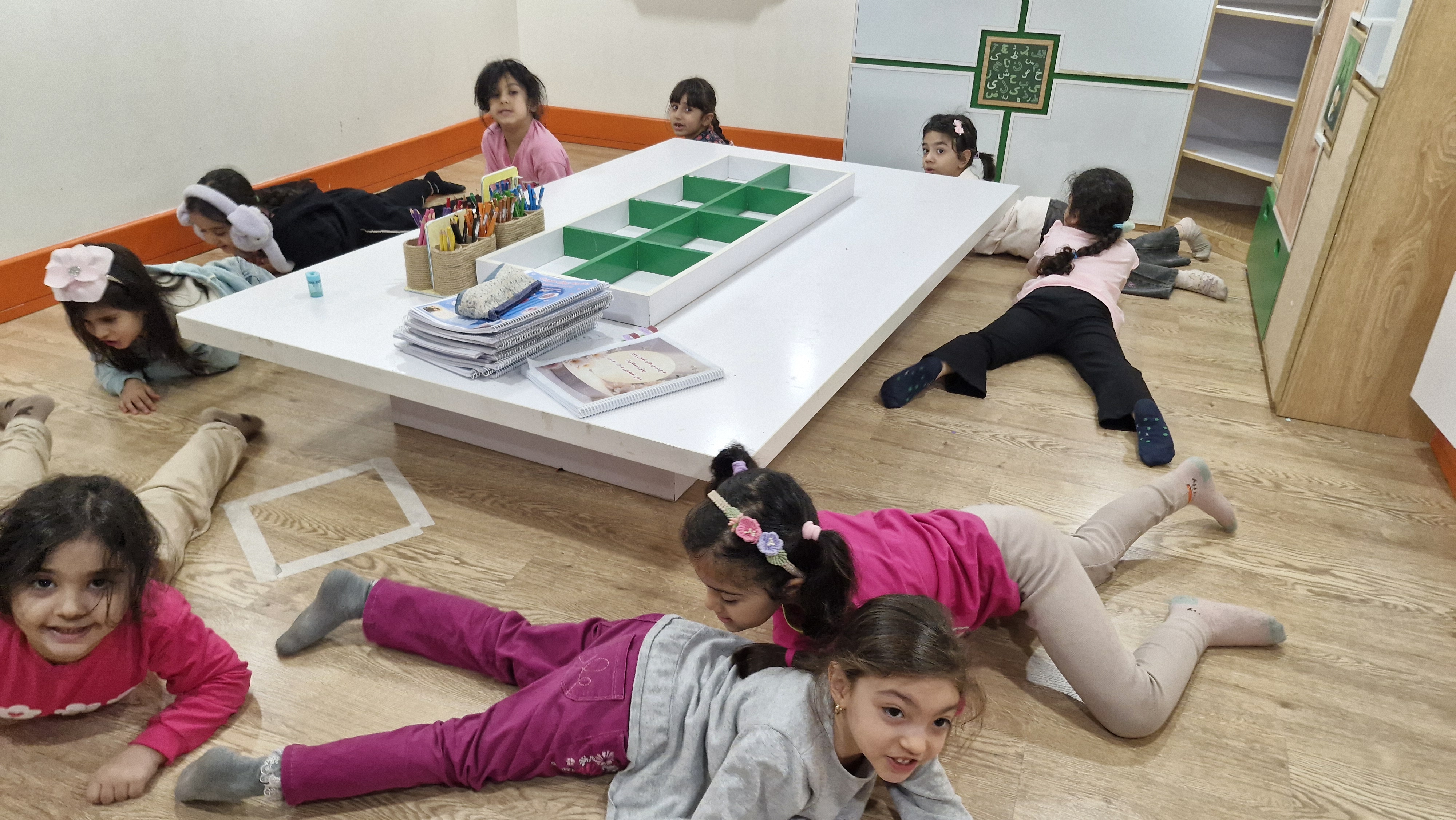 با خاله زینب کاربرگ حل کردیم( نیمه های هر شکل را به هم متصل باید میکردیم)💔 و با خاله زهرا : تعدادی کاغذ رنگی به صورت رندم و متفاوت در دو ستون چیده شده بود تعدادی لگو هم پایین این ستونها بود و باید همزمان با دو دست لگوهای رنگی را برمیداشتیم و کنار کاغذ رنگی همان رنگ می گذاشتیم 🤔