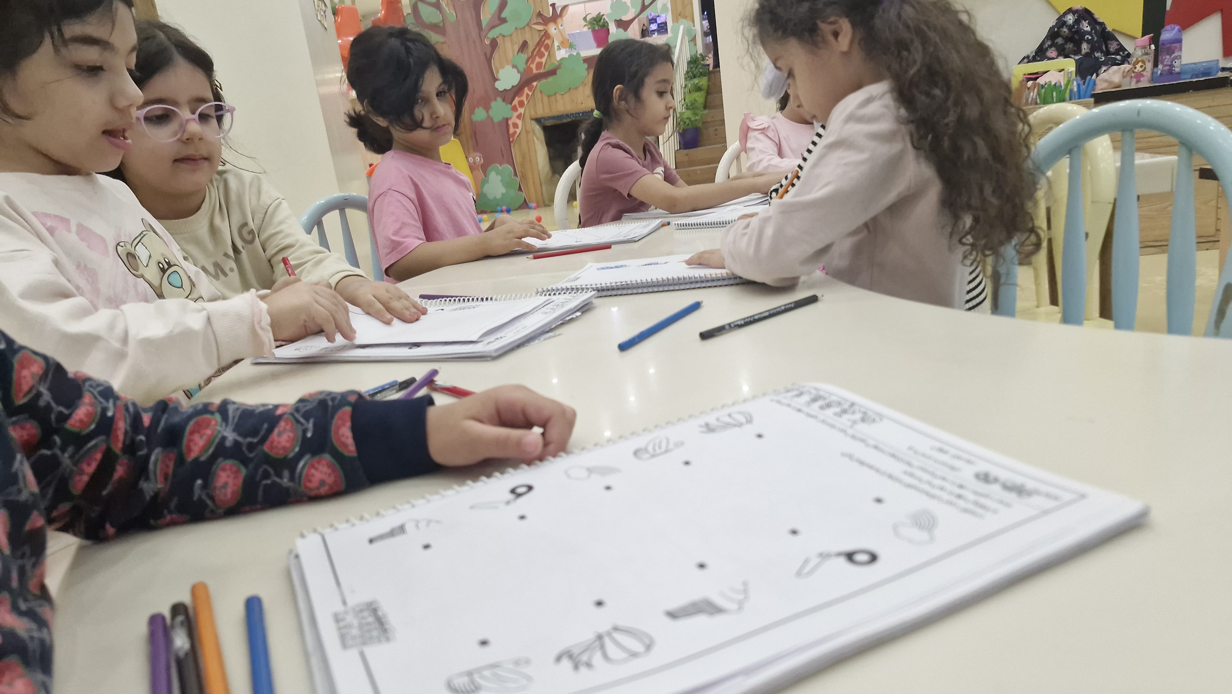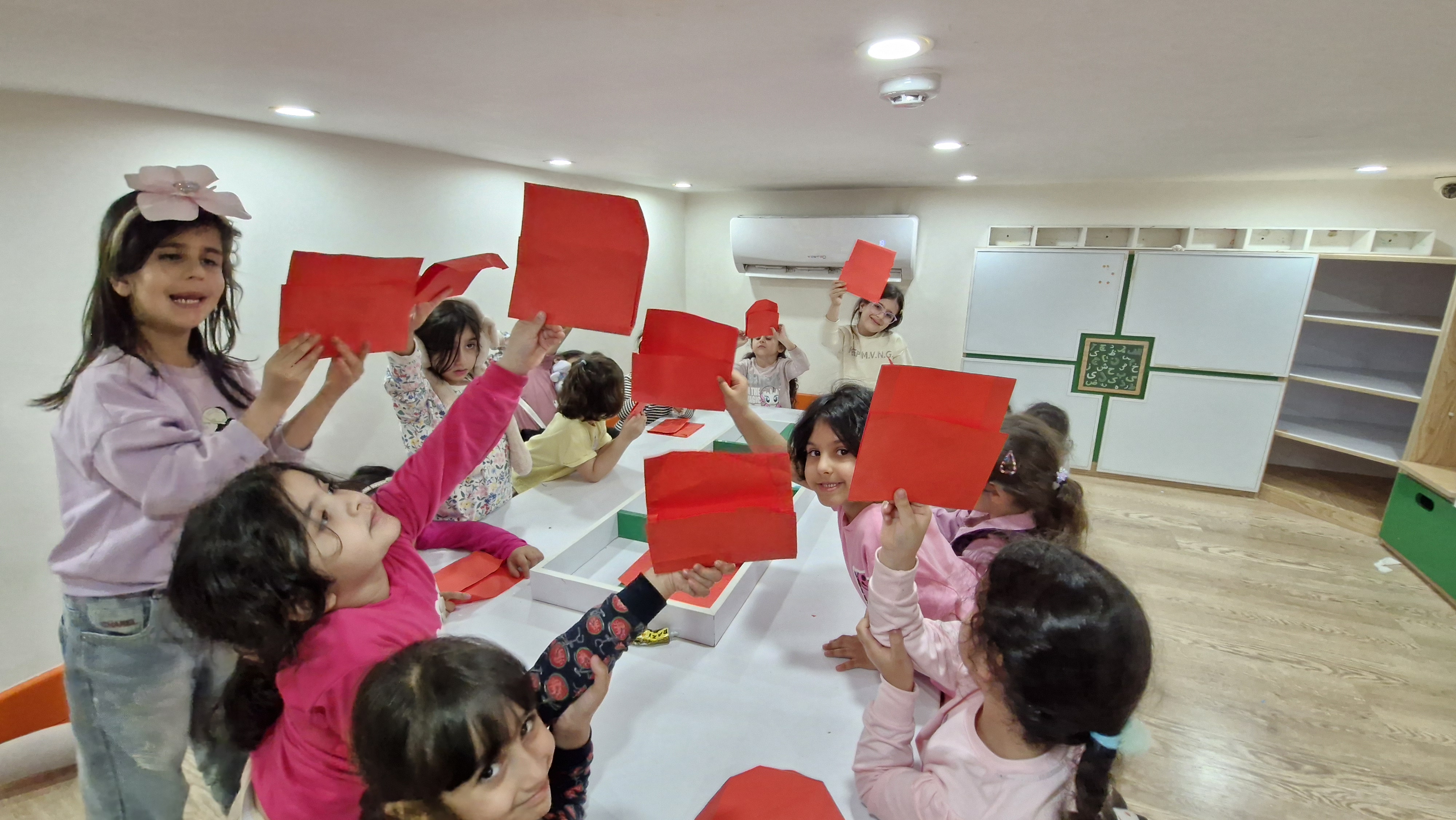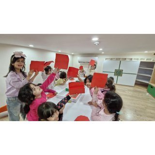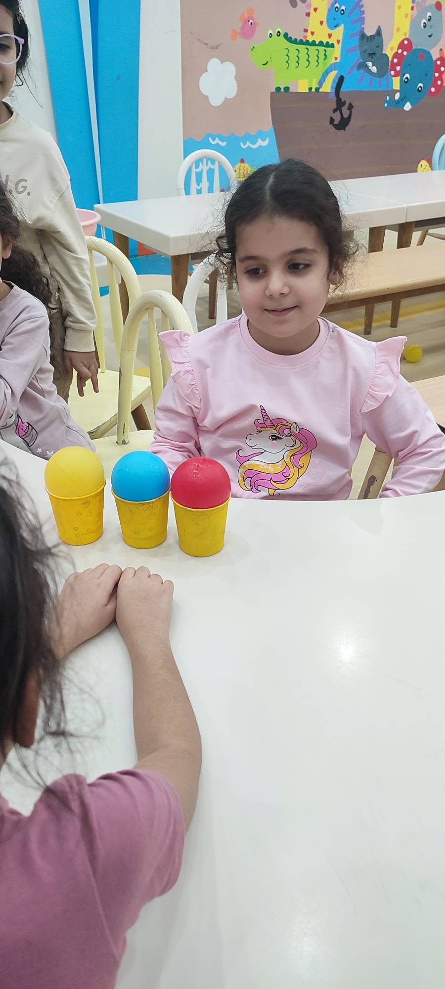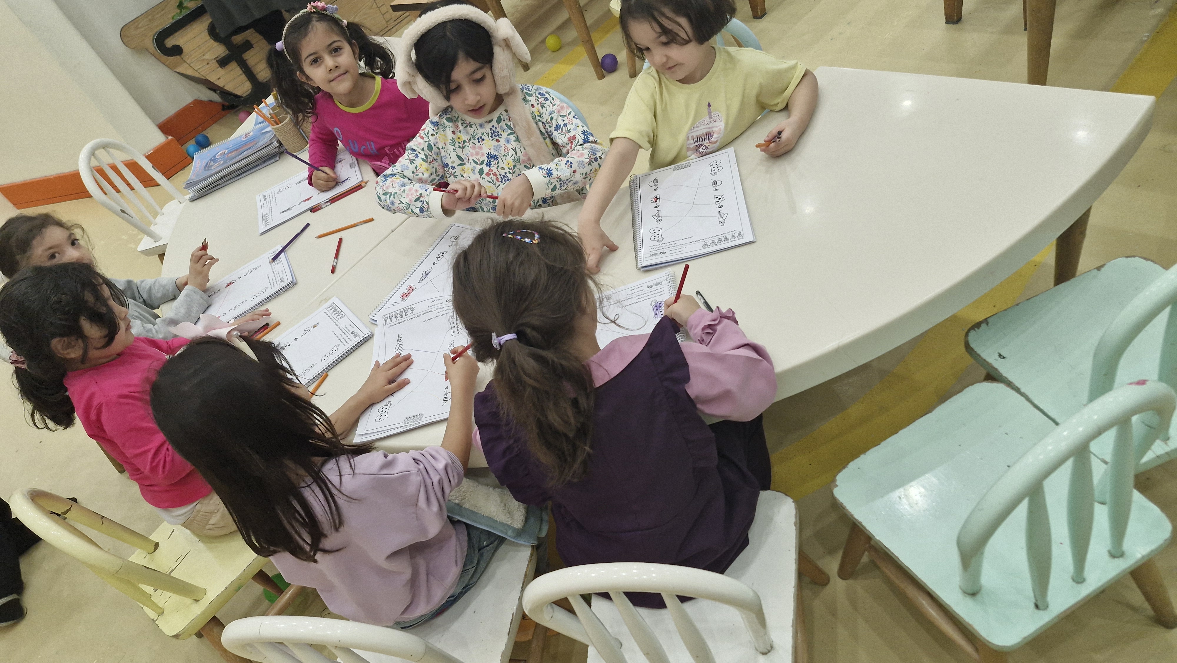 با خاله زینب کاربرگ حل کردیم( نیمه های هر شکل را به هم متصل باید میکردیم)💔 و با خاله زهرا : تعدادی کاغذ رنگی به صورت رندم و متفاوت در دو ستون چیده شده بود تعدادی لگو هم پایین این ستونها بود و باید همزمان با دو دست لگوهای رنگی را برمیداشتیم و کنار کاغذ رنگی همان رنگ می گذاشتیم 🤔