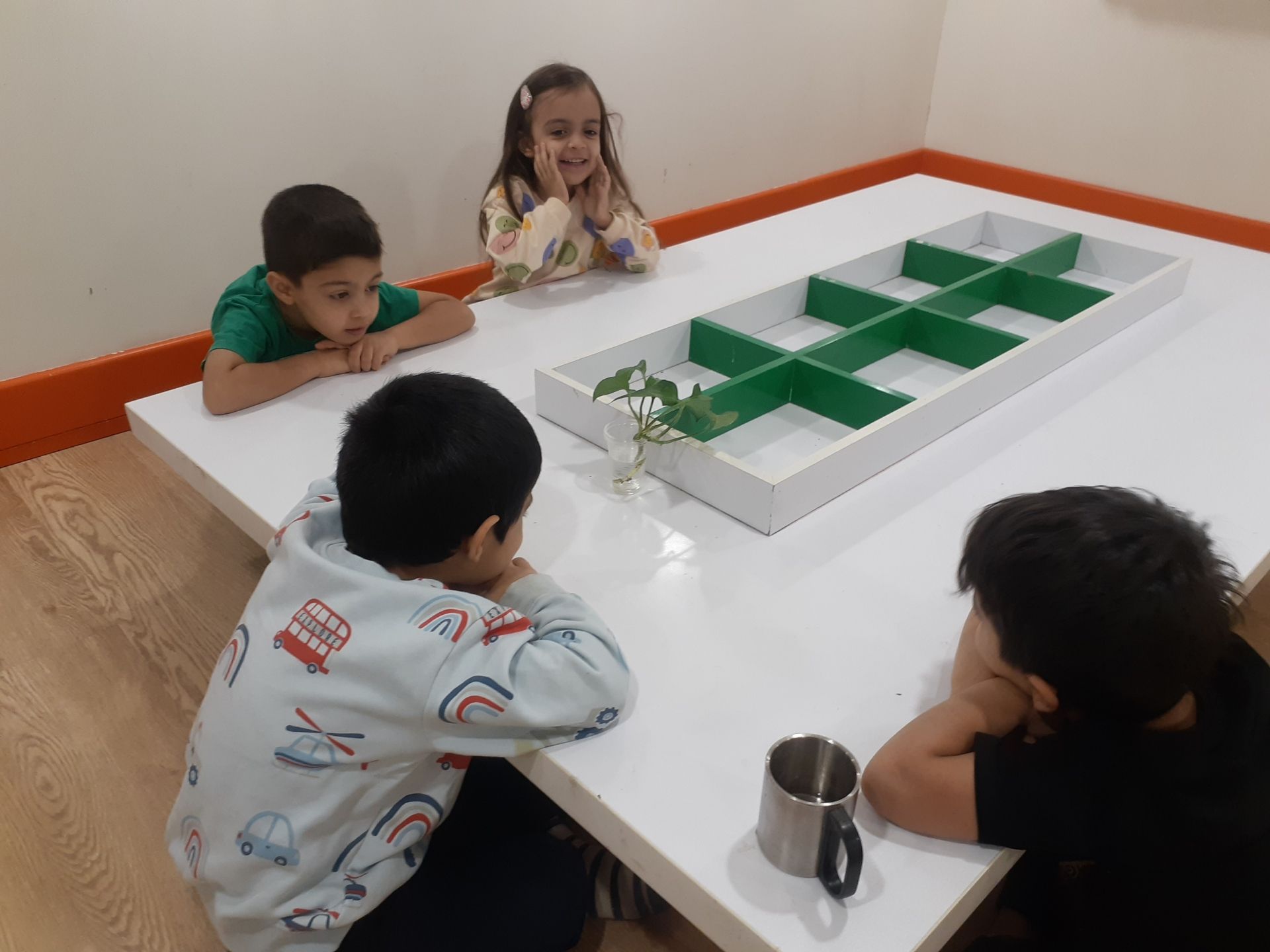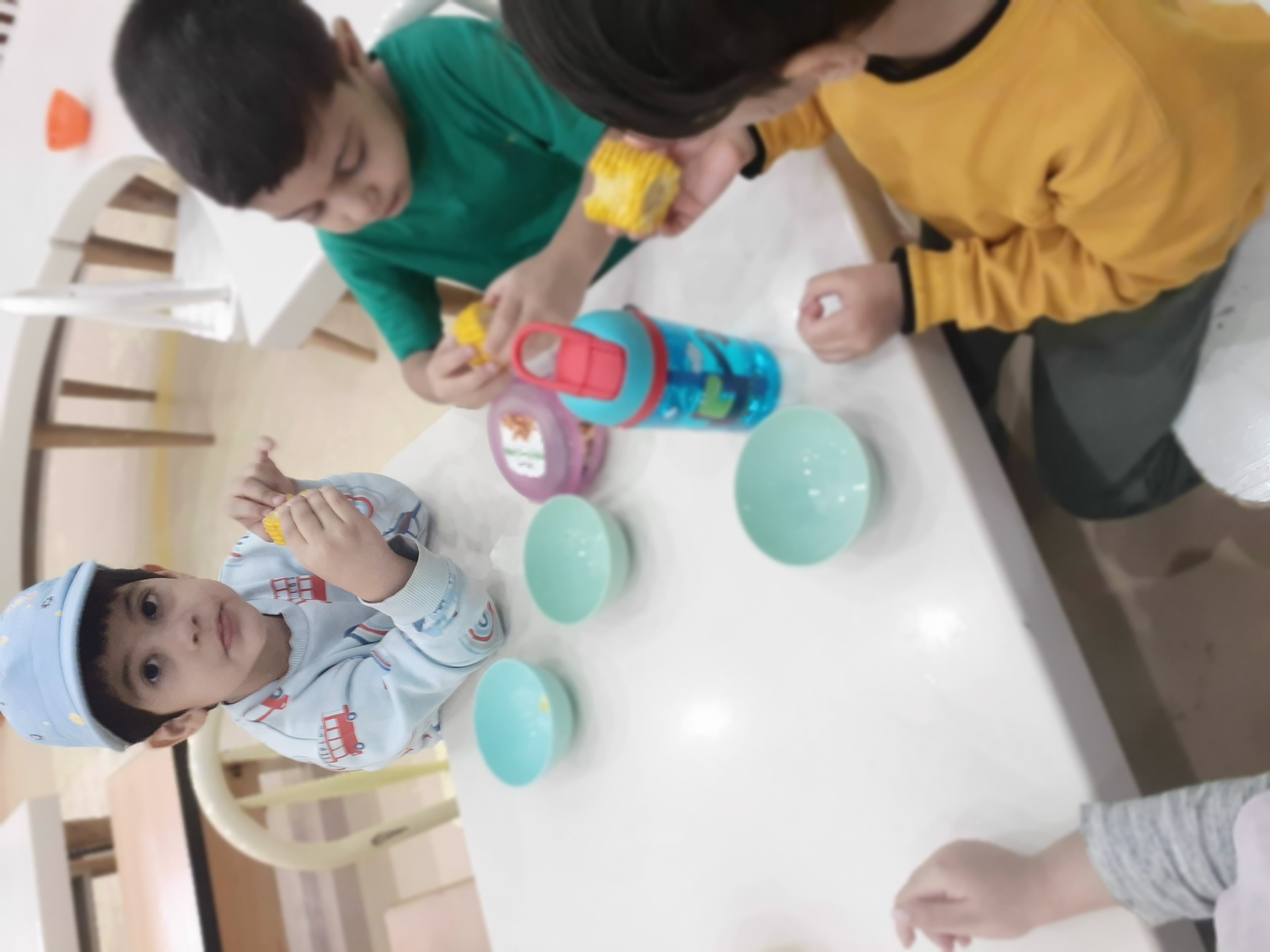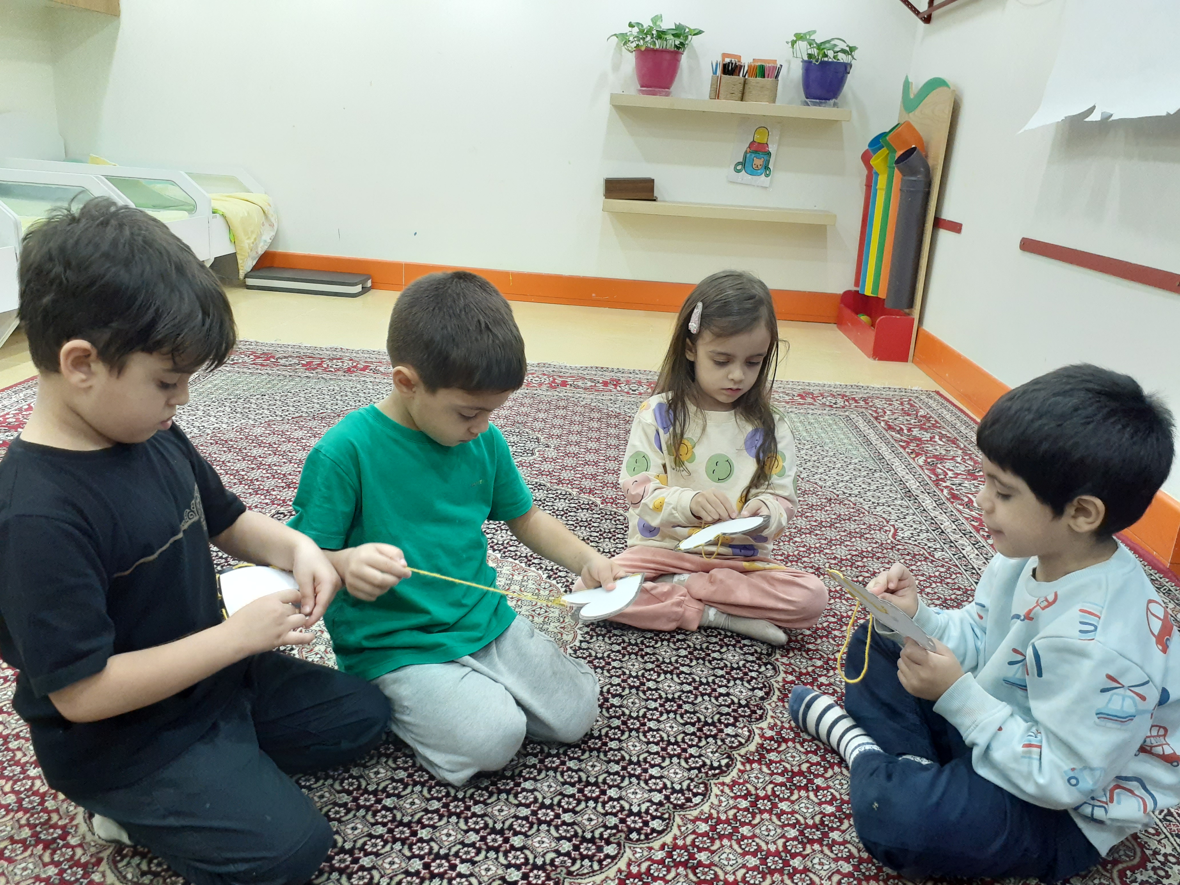 بعد از اینکه با هم صحبت کردیم ،حضور غیاب رو به همراه بچه ها انجام دادیم و صحبت درمورد آب و هوا ،فصل ،ماه ،... داشتیم.برای اینکه بچه های گلم صبور بودن رو متوجه بشن پتووس رو داخل آب گذاشتیم تا زمانش ریشه بده.