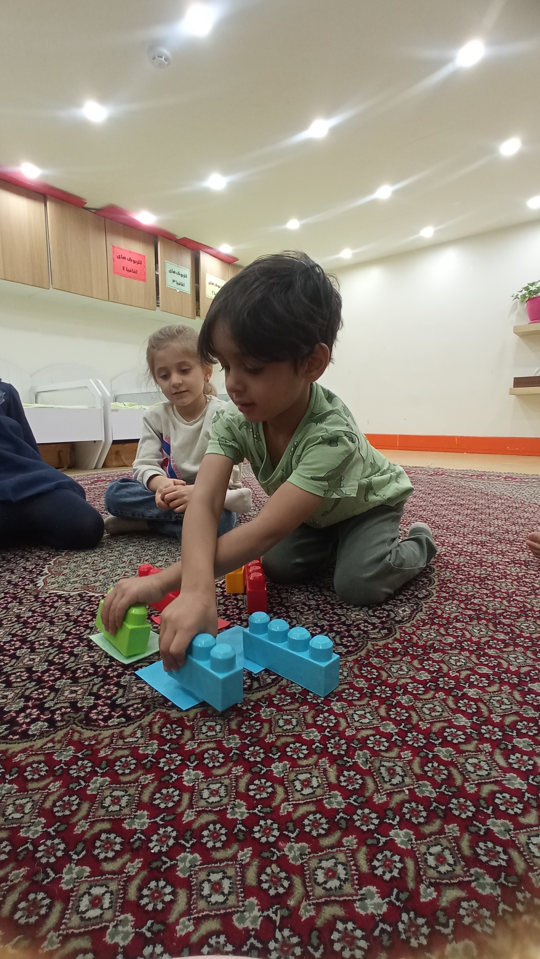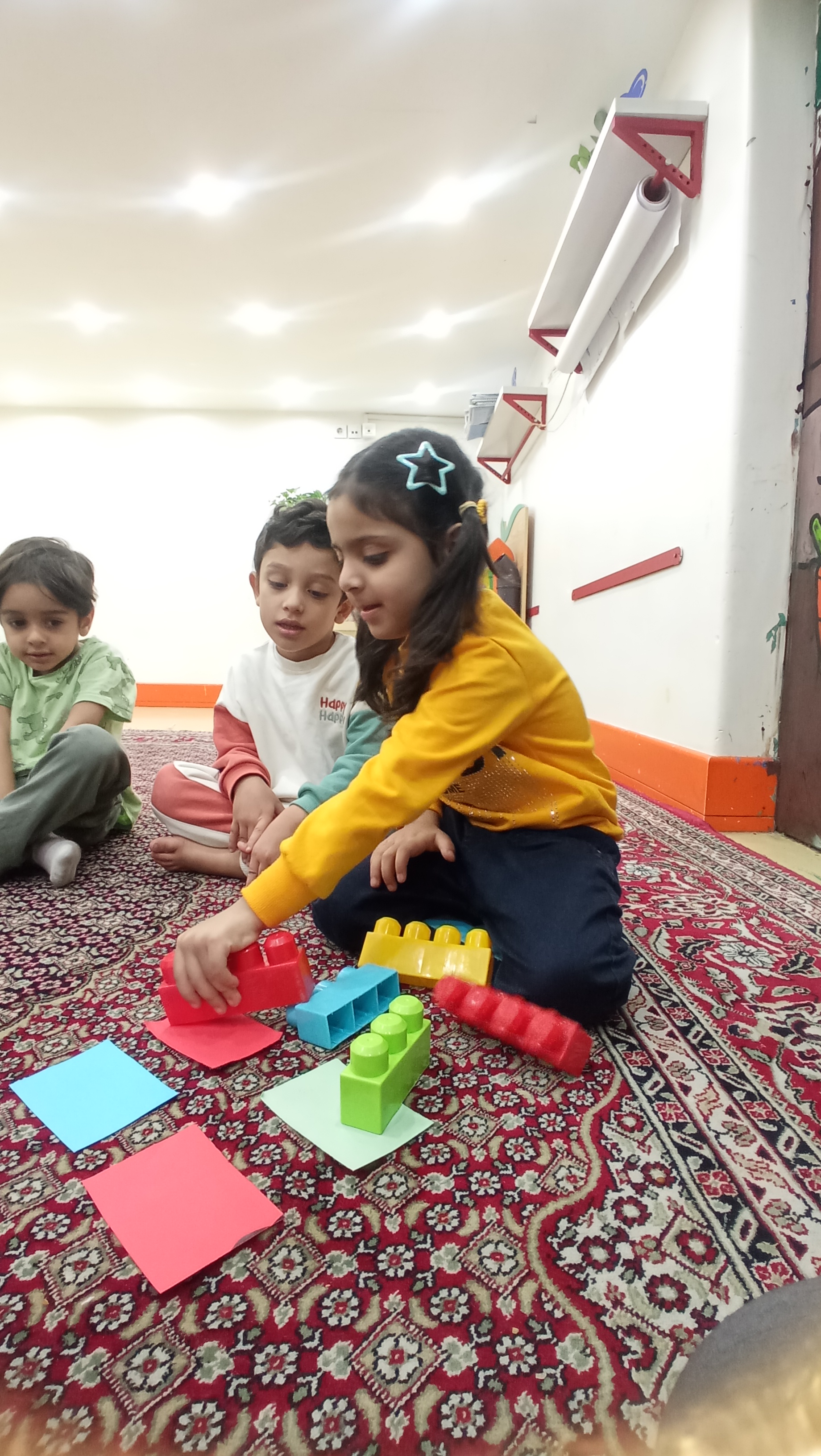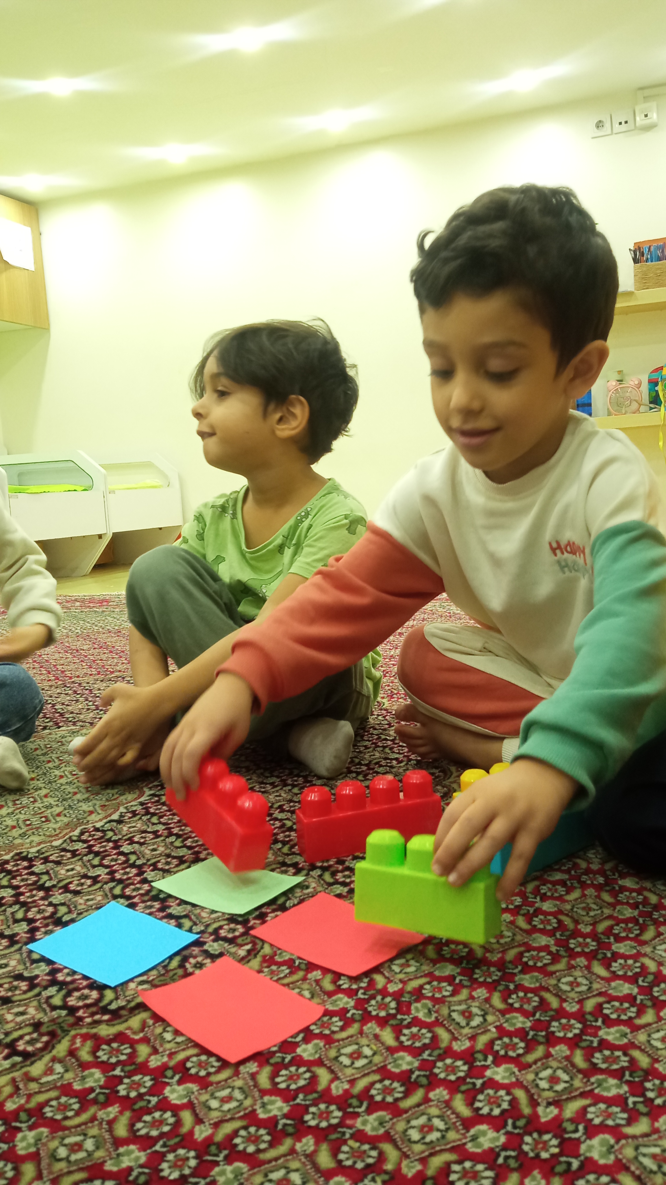 اول با استفاده از لگو و کاغذ رنگی یک بازی جهت تقویت هردو نیمکره مغز؛ هماهنگی چشم و دست و همچنین افزایش توجه تمرکز انجام دادیم.