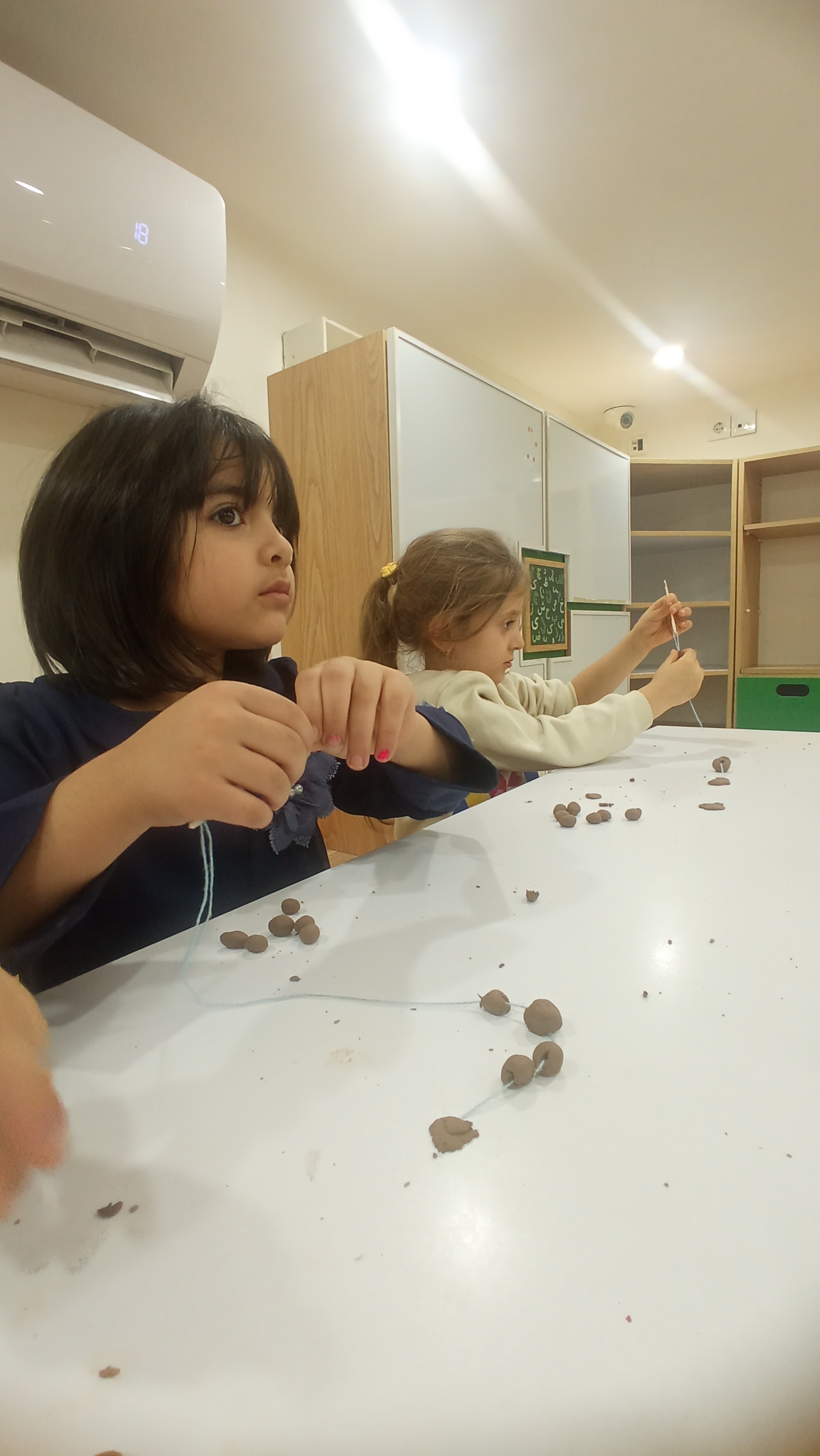 حالا که خوب انرژی گرفتیم وقت کلاس شهرک خمیر و دست ورزی بود که با گل رس و سوزن و نخ تسبیح درست کردیم😍