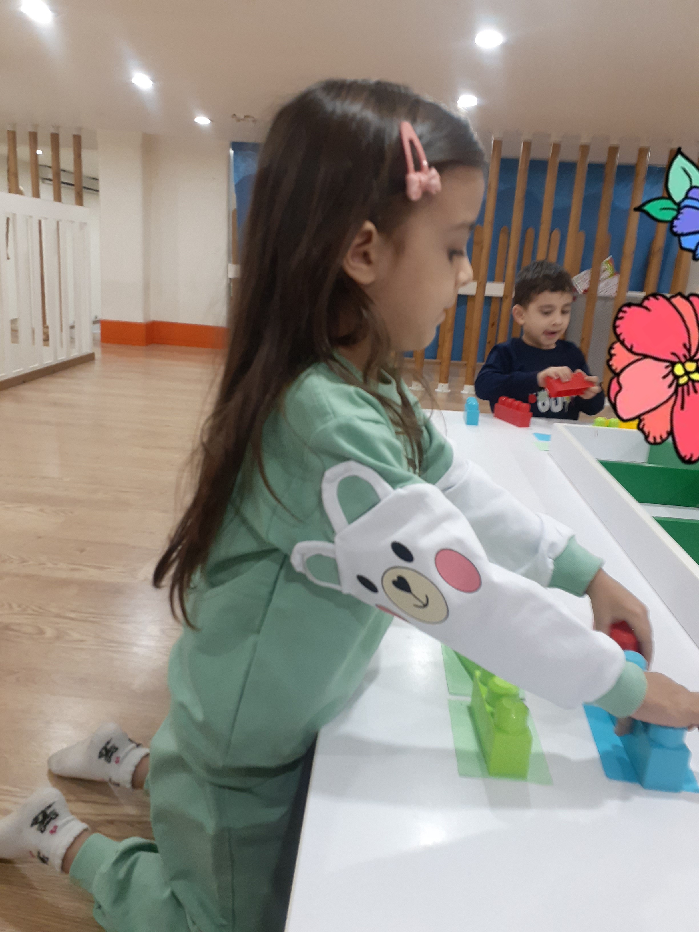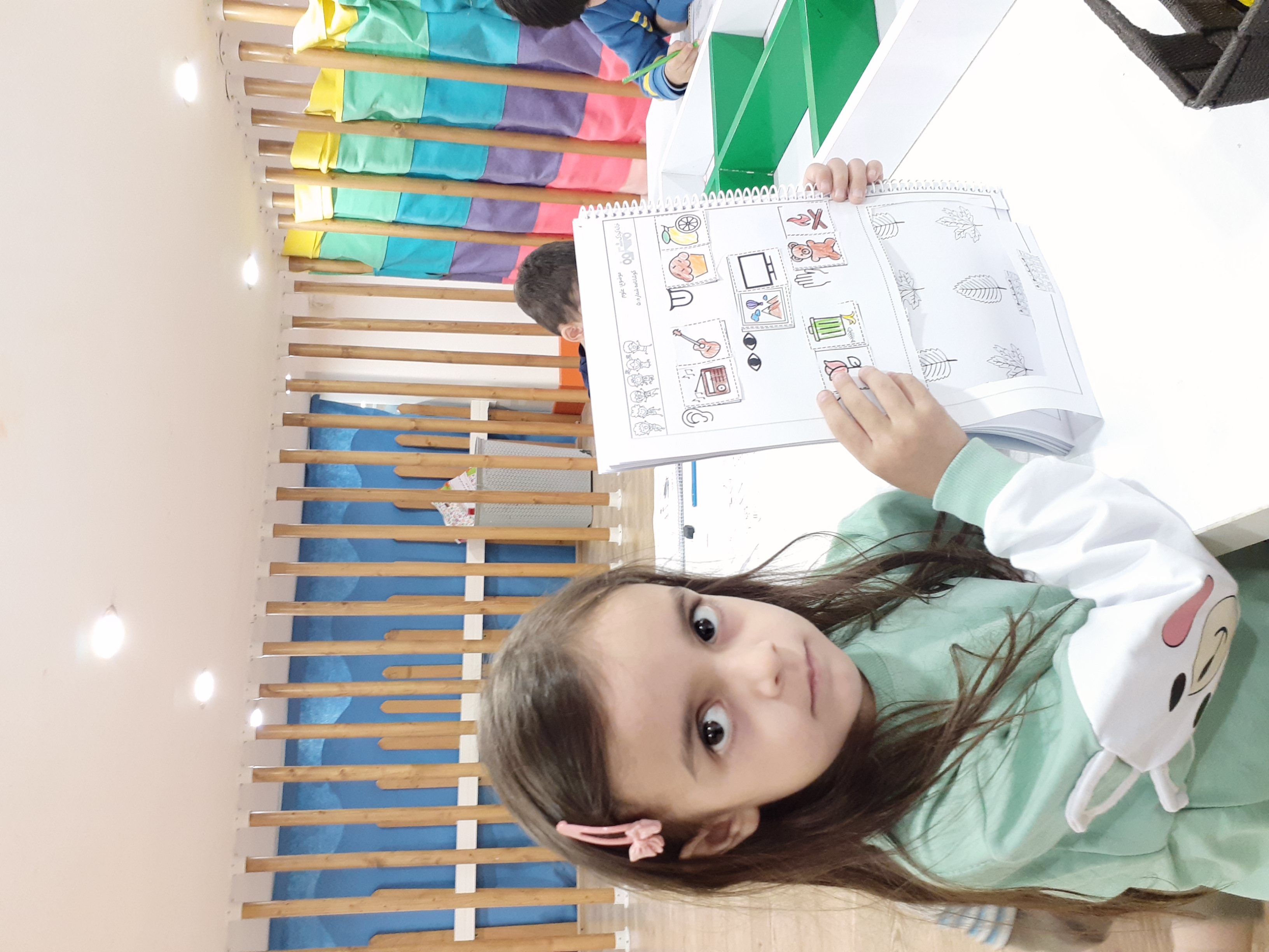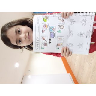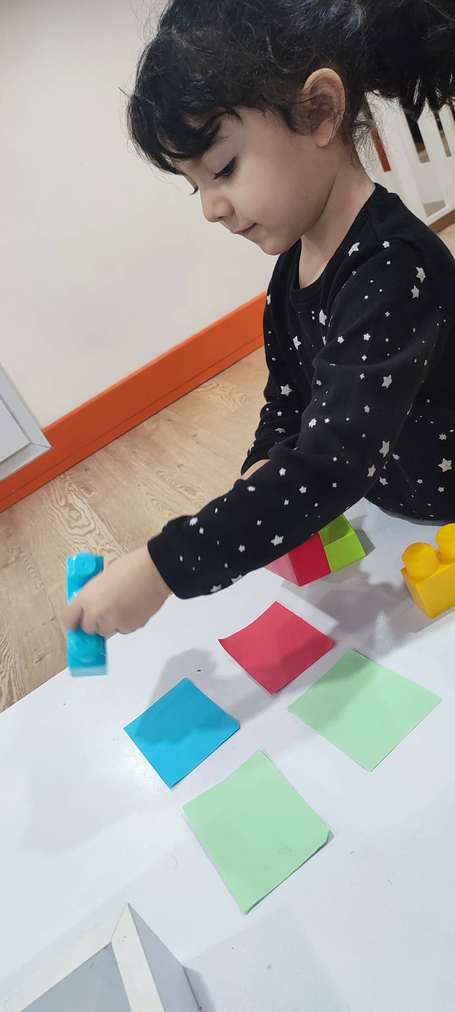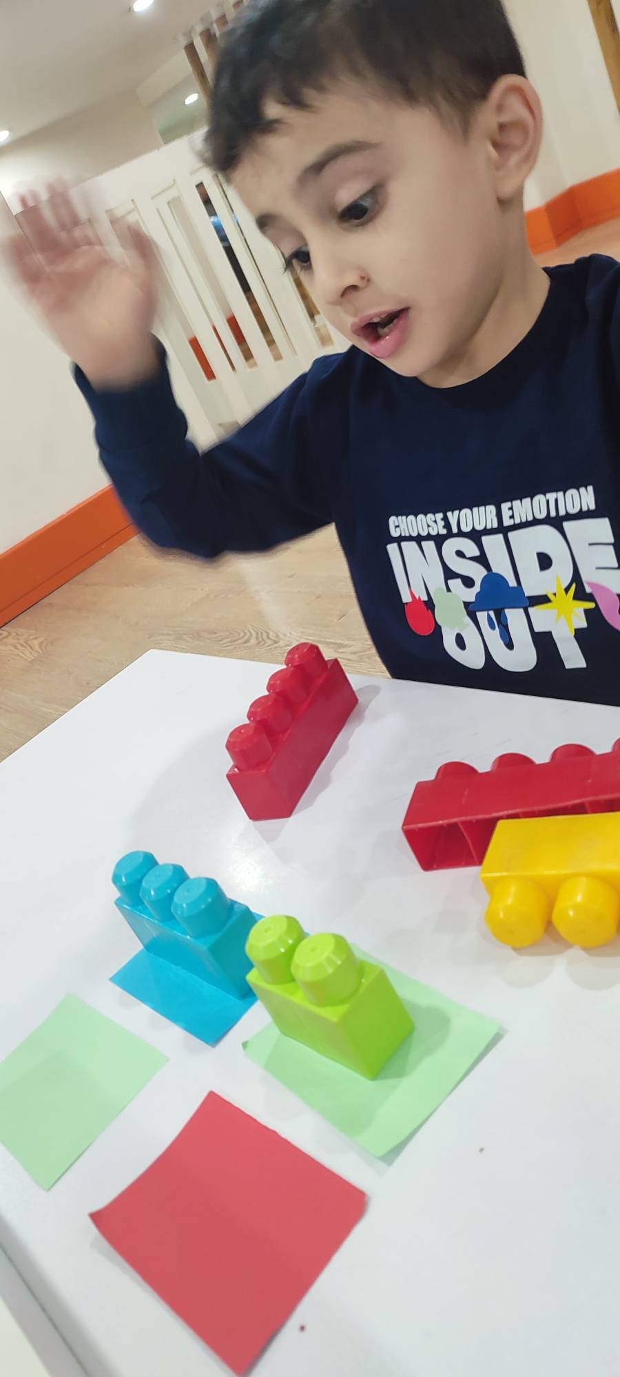 بعدش به کلاس برگشتیم ، بازی حافظه با خانم مجیدی داشتیم ، با استفاده از لگو و کاغذ رنگی یک بازی جهت تقویت هردو نیمکره مغز؛ هماهنگی چشم و دست و همچنین افزایش توجه تمرکز انجام دادیم.