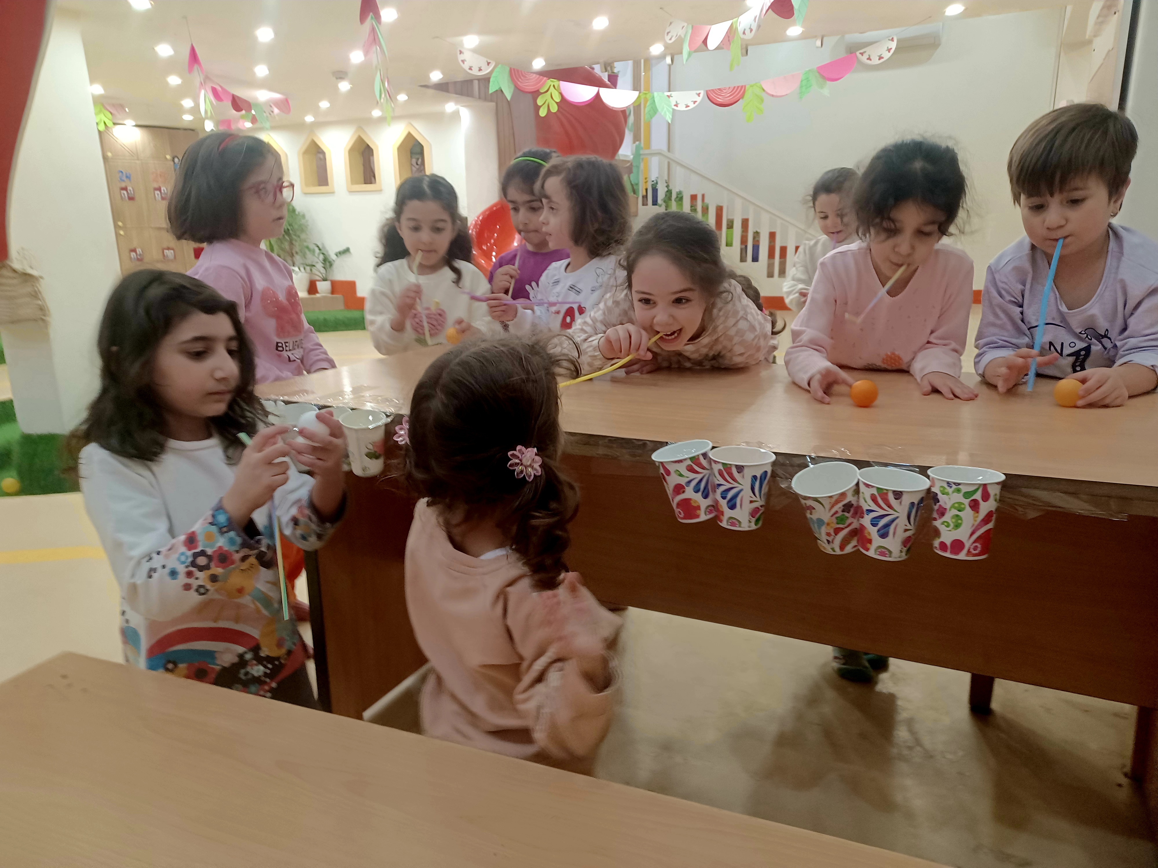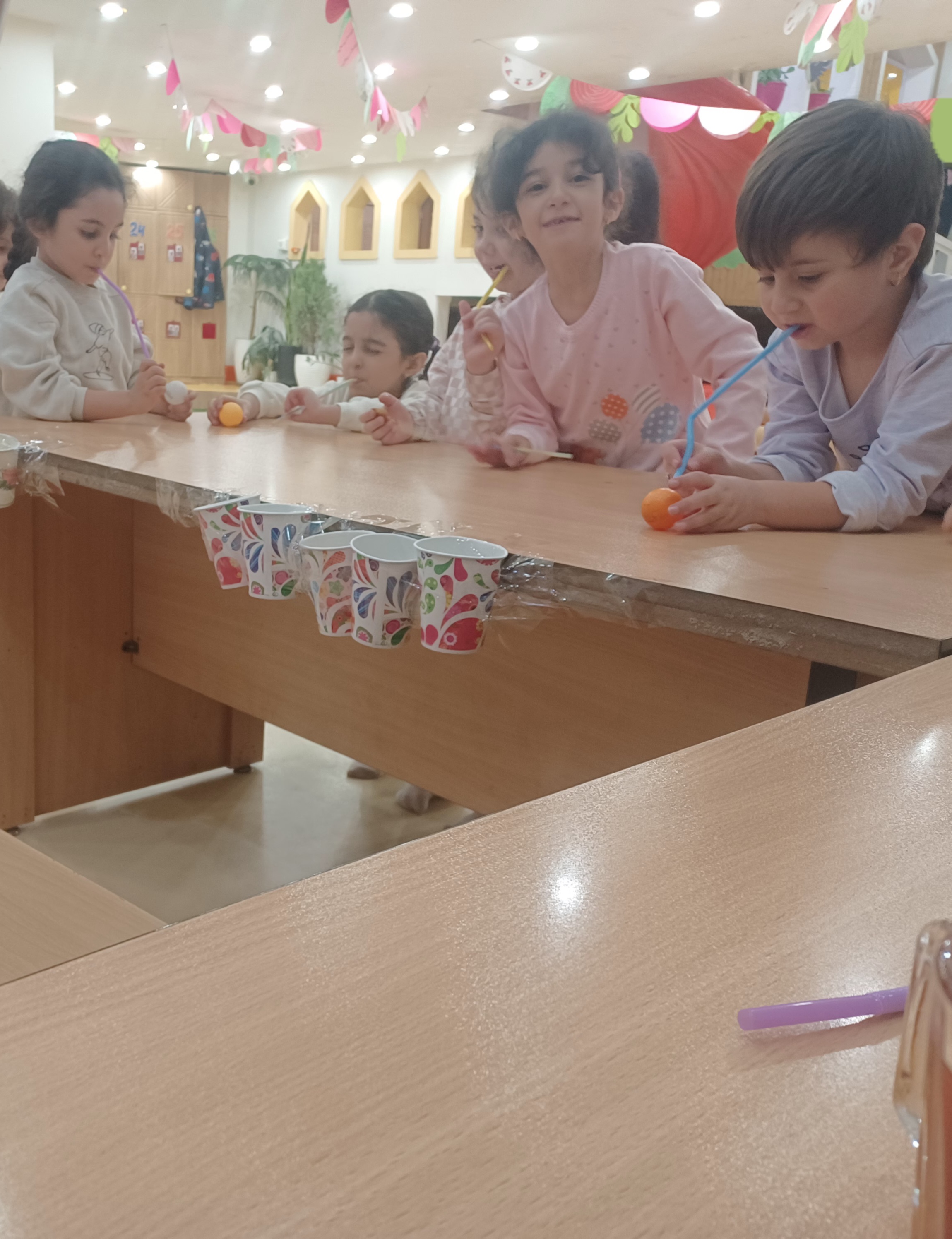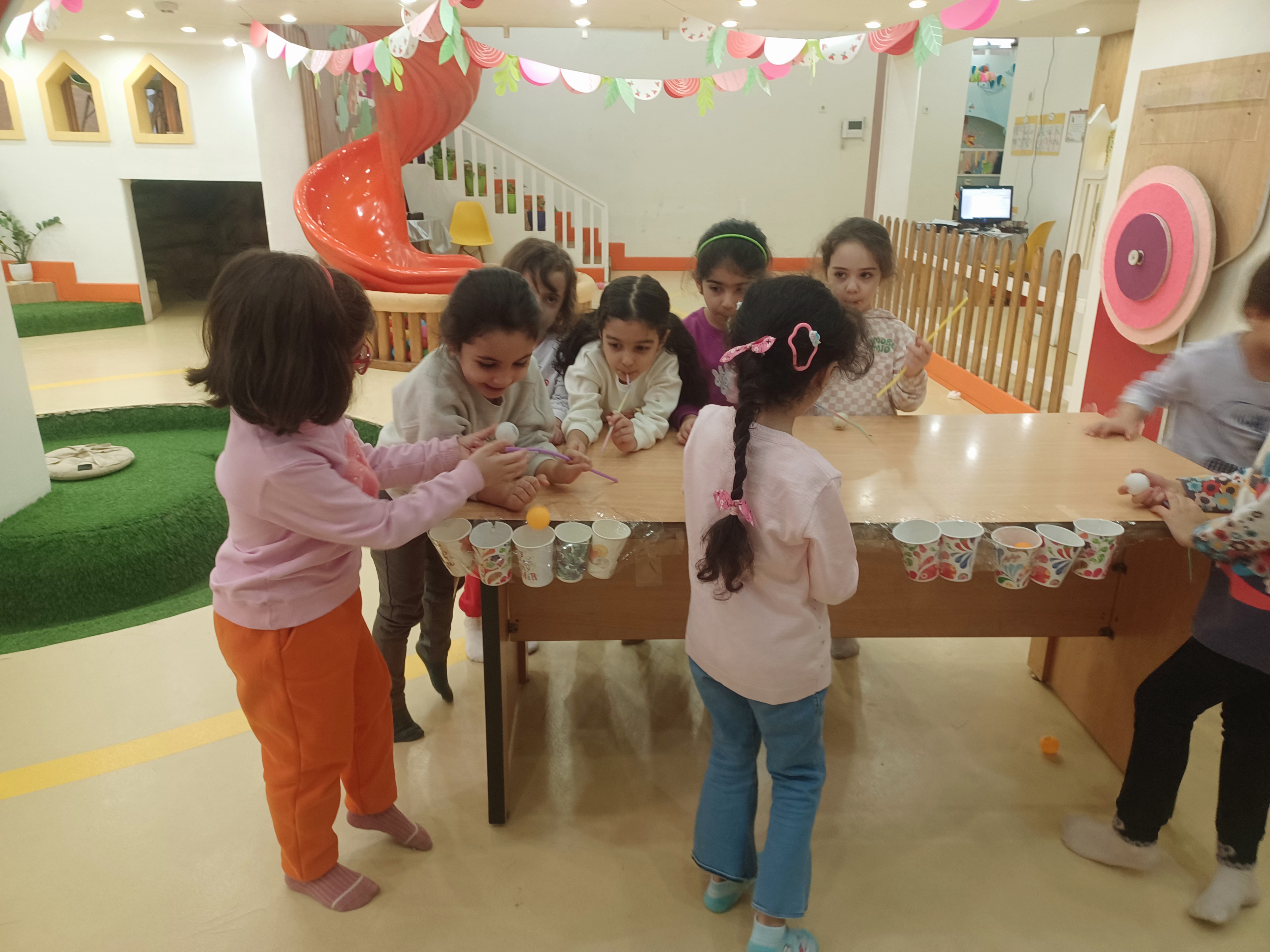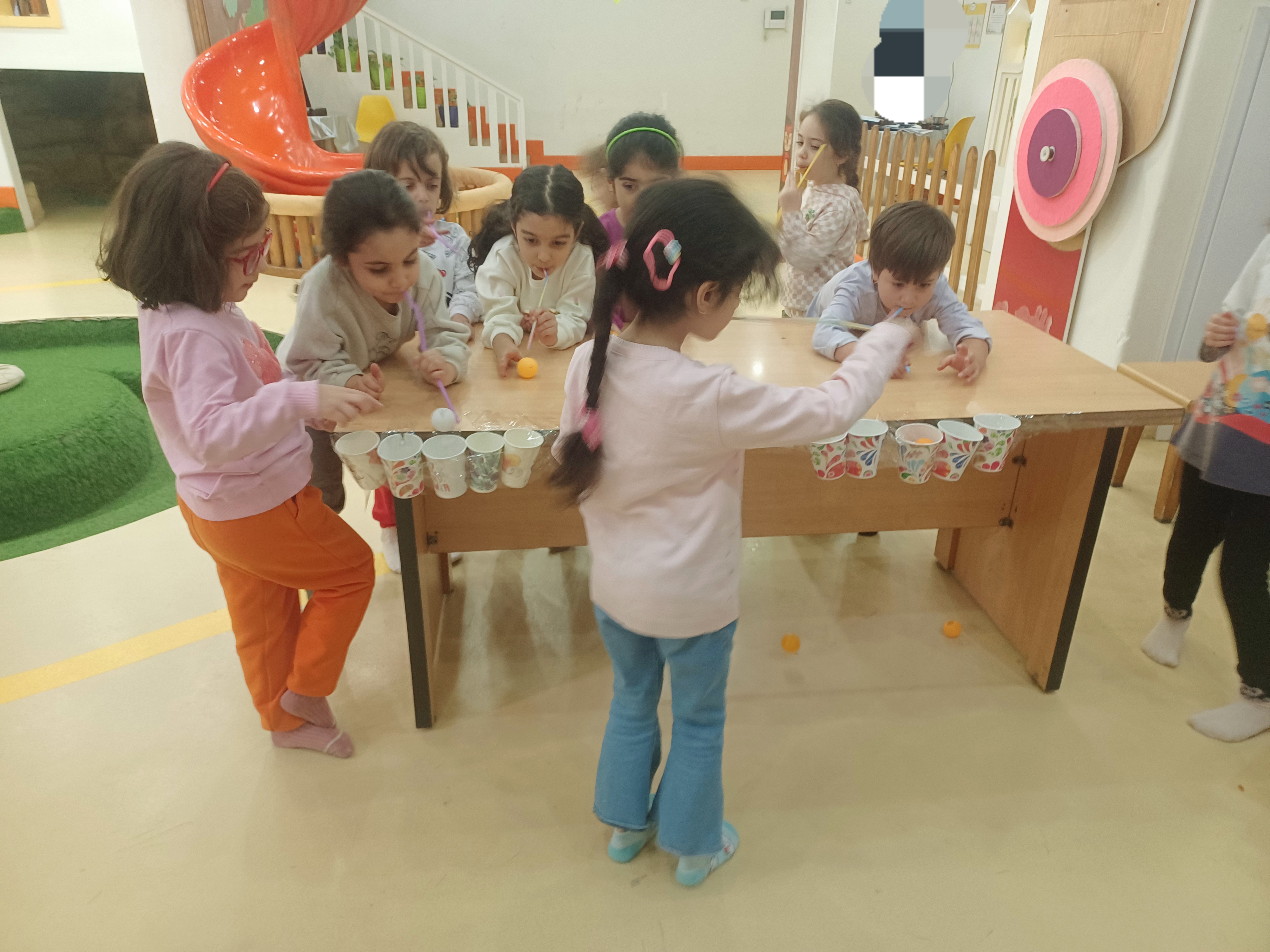 👈بازی خلاق:سُرسُر و خاله زهرا در انتهای هر میز یک لیوان میچسبونه به هرکدوممون نی میده که با فوت داخل نی ما توپ می ندازیم داخل لیوان،افزایش تمرکز،هماهنگی اعضای بدن،افزایش نشاط