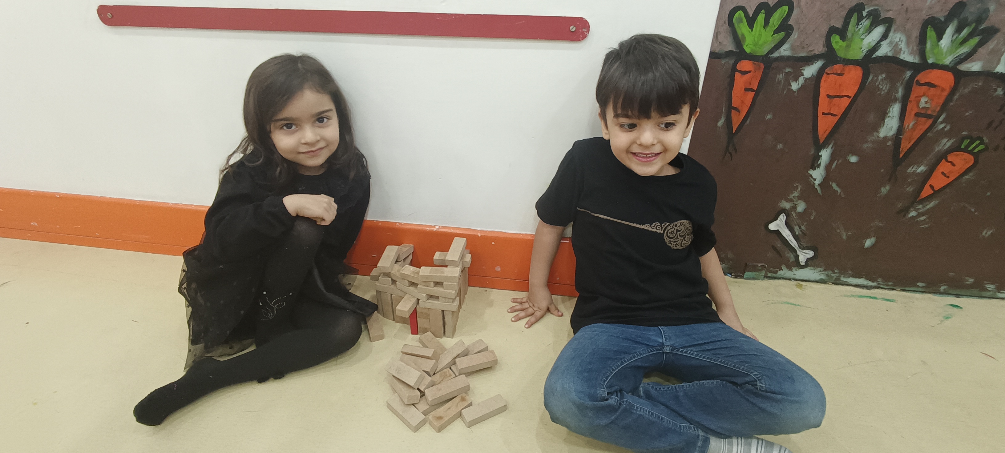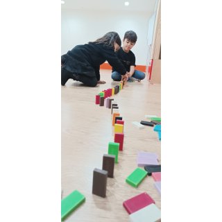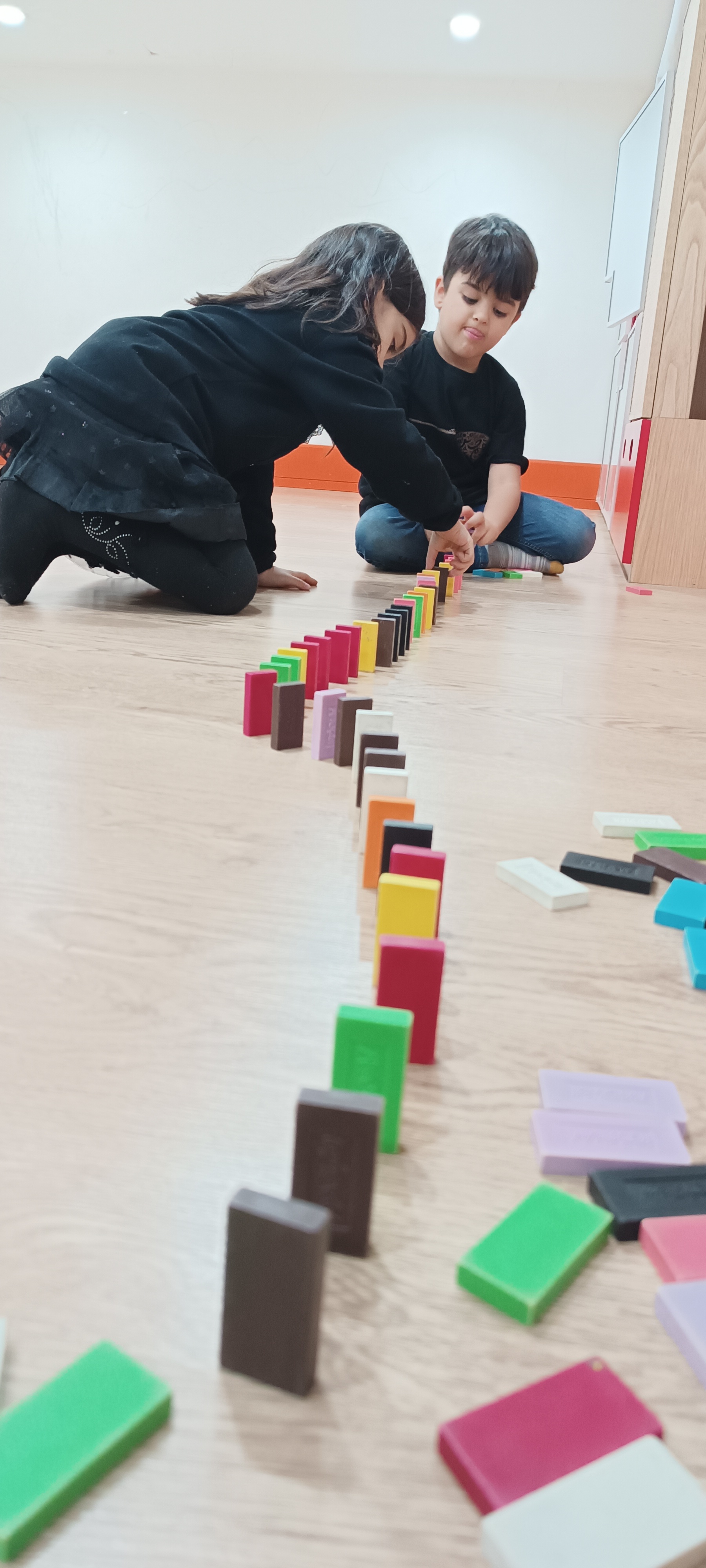 کلاس آخر ما کلاس دومینو بود که بچهها این کلاس رو بسیار دوست دارند🤩 دومینوهای خودمان را به صورت جادهای چیدیم و بعد از اینکه جاده طولانی درست کردیم با ضربه زدن همه آنها روی زمین ریخت کلی ذوق کردیم و دست زدیم.👏