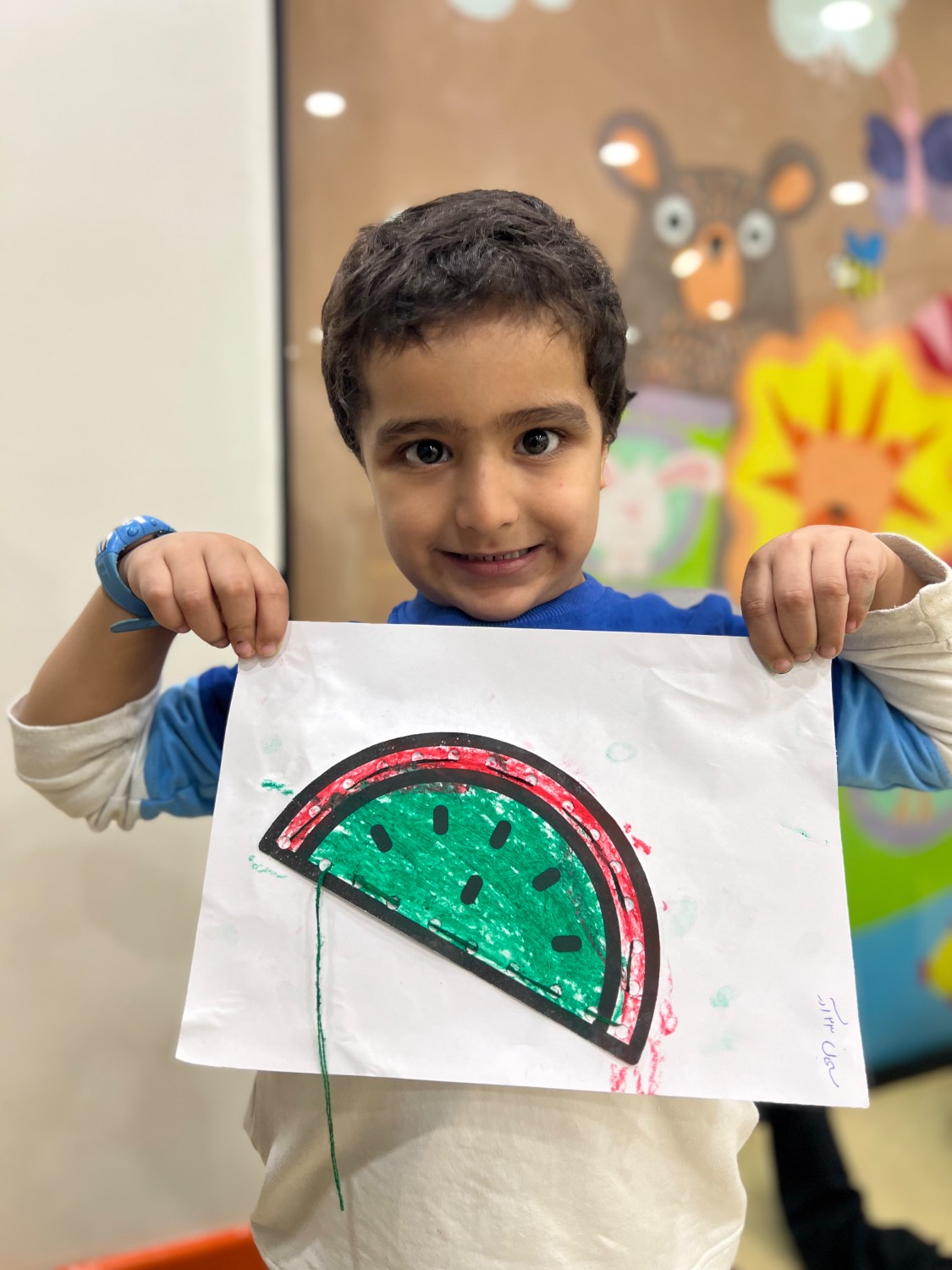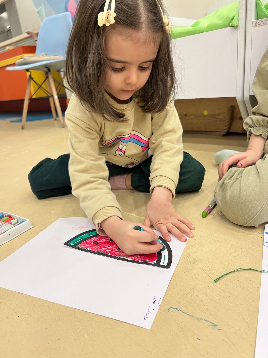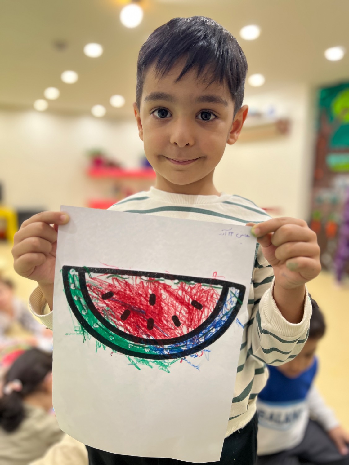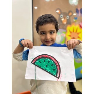 لذت نقاشی:کشیدن شکل هندوانه و انار و رنگ آمیزی آن ها.🍉