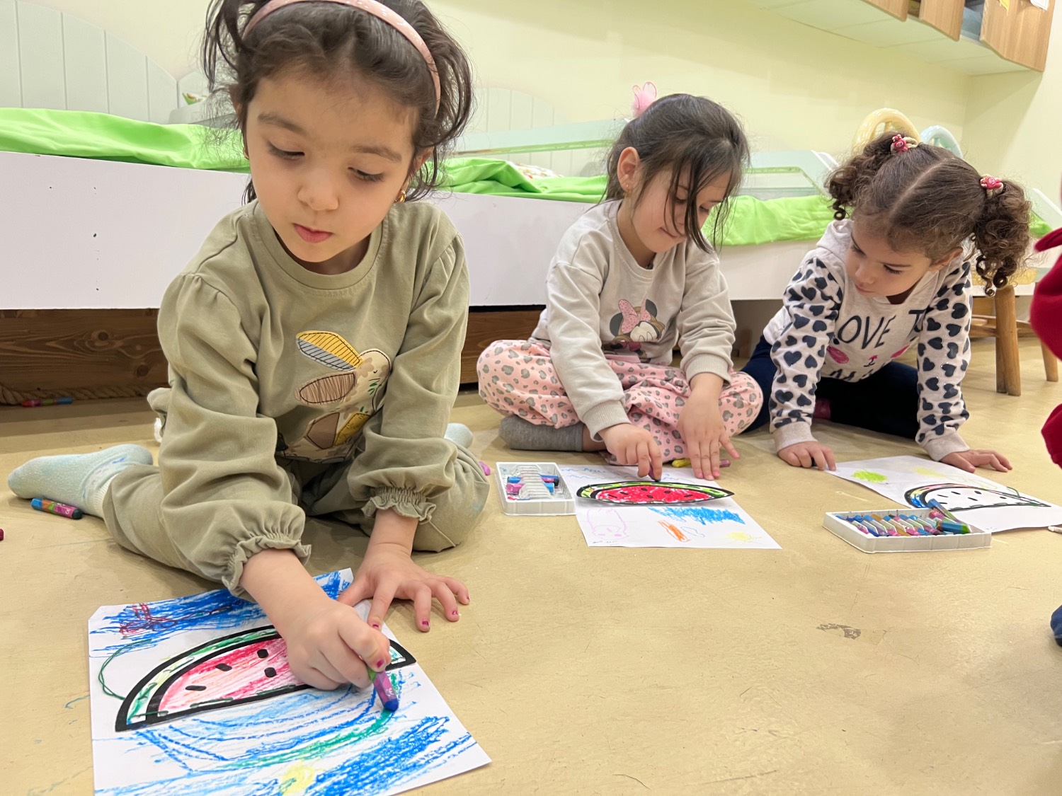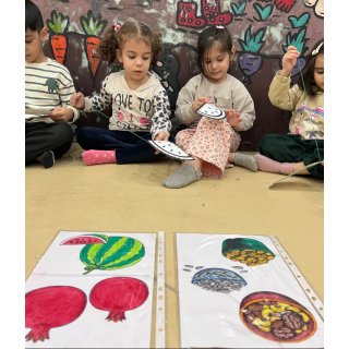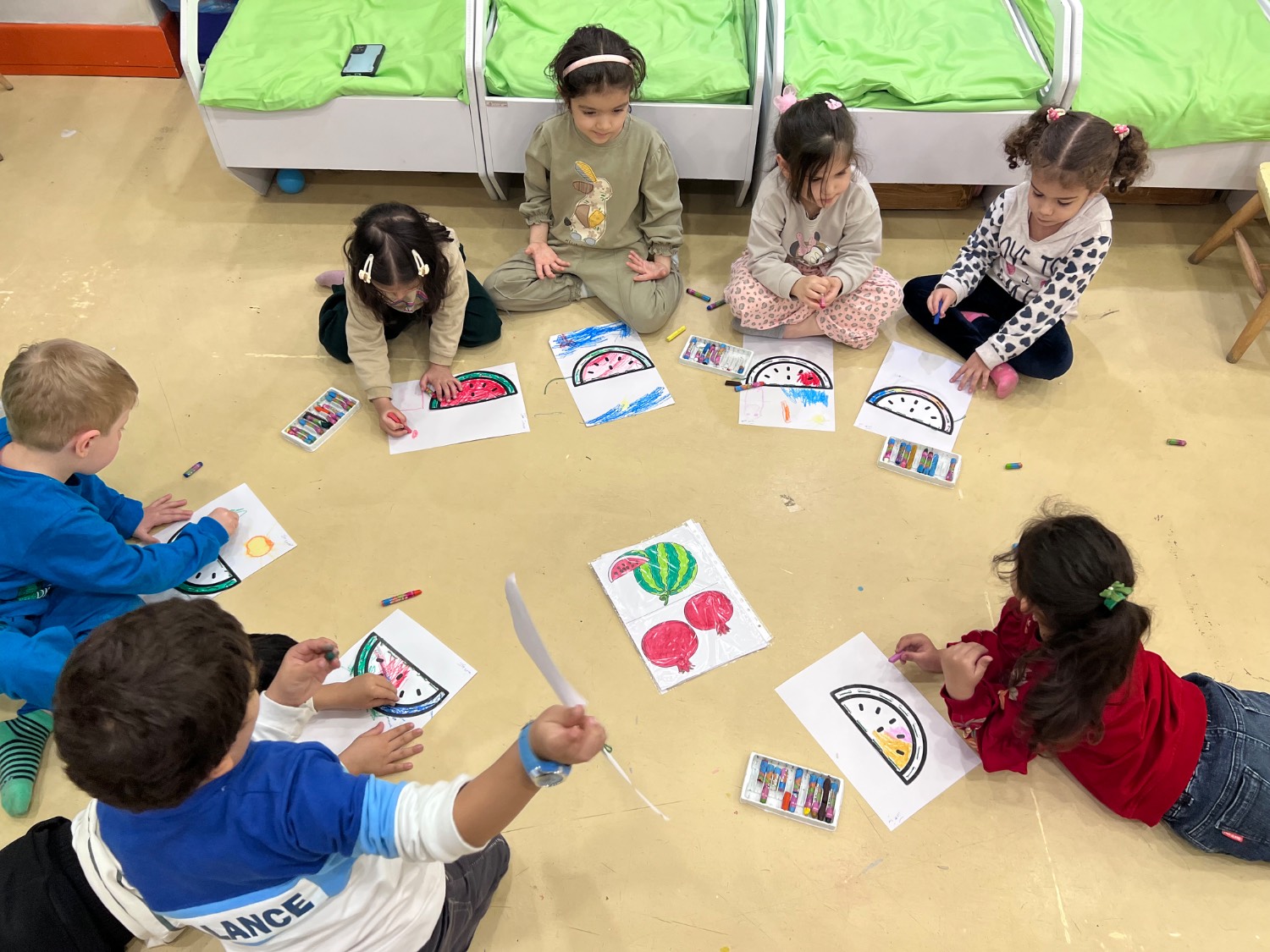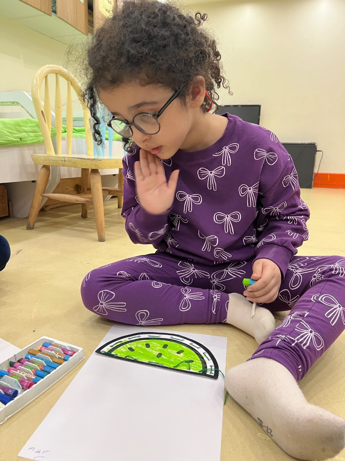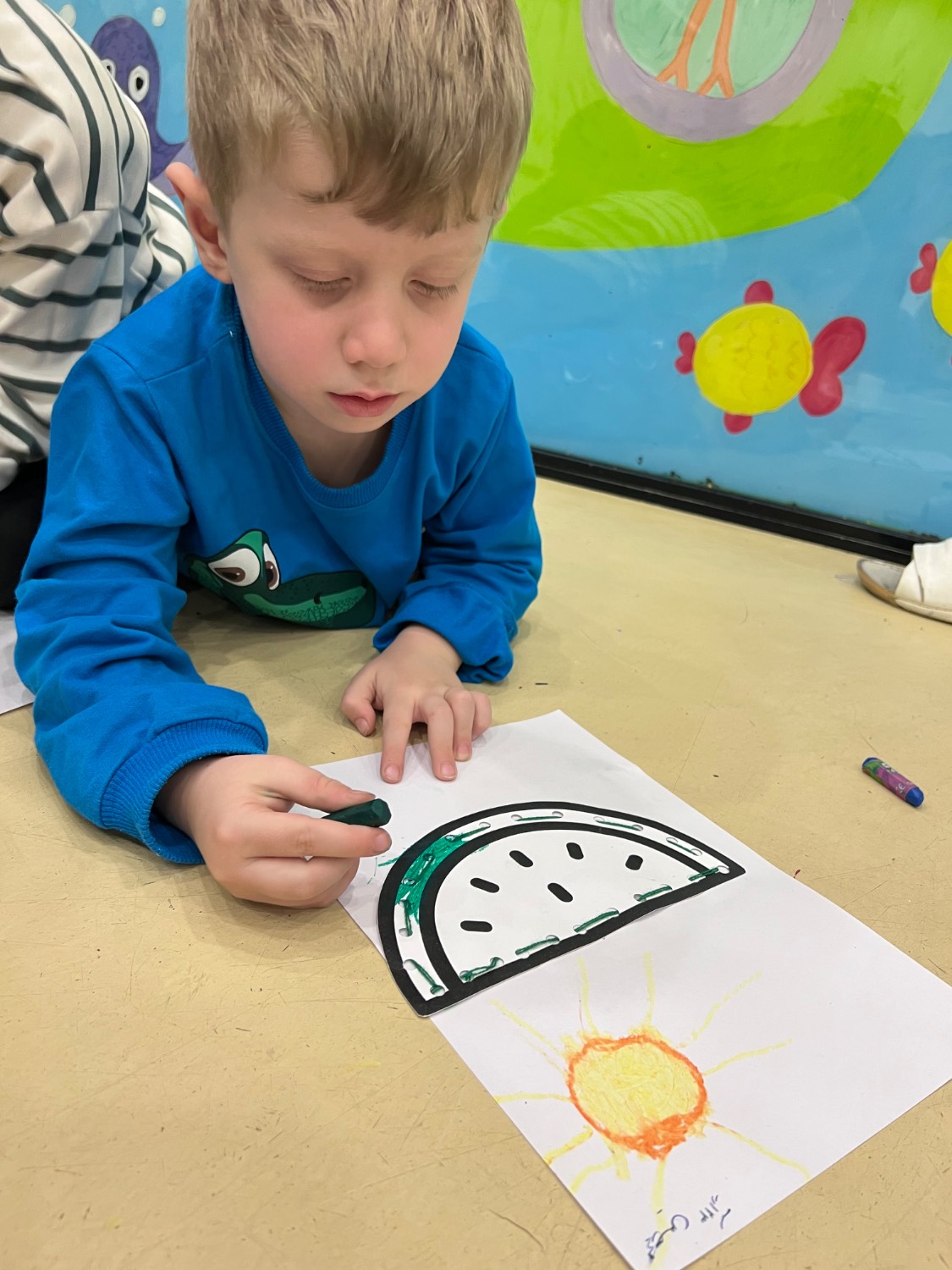 لذت نقاشی:کشیدن شکل هندوانه و انار و رنگ آمیزی آن ها.🍉