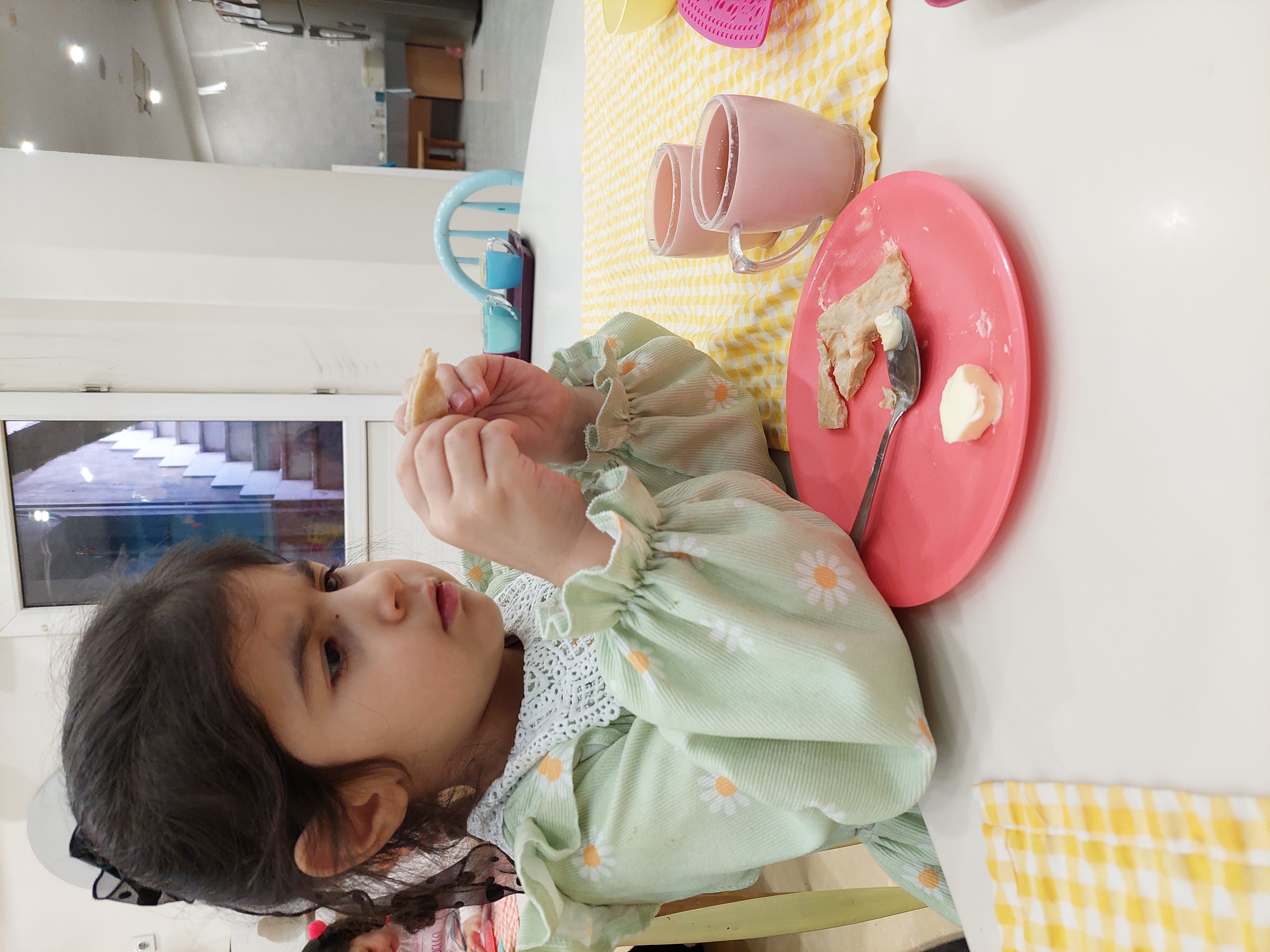 امروز هم اول از همه رفتیم صبحانه که نون و کره و مربا بود، نوشه جان کردند😋🍞🧈🥕 سپس رفتیم صبحگاه