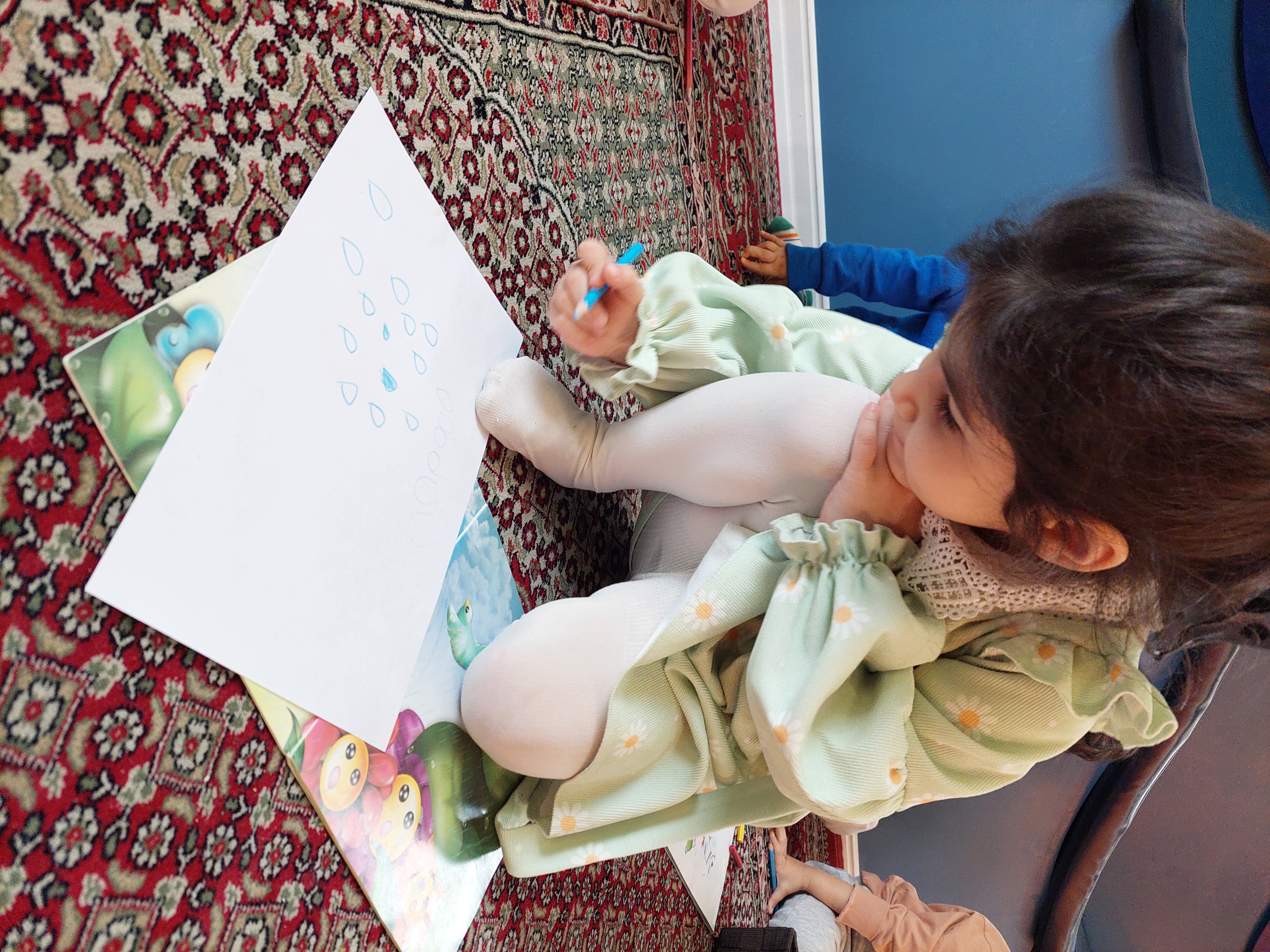 نوبت رسید به فعالیت بعدیمون که کلاس خاله نادره جان بود که ابتدا یک کتاب داستان برای لاله ها خوانده شد سپس شخصیت های داستان که شامل باران و گل بود نقاشی کردند و نمایش اجرا کردند🌻🌧