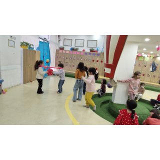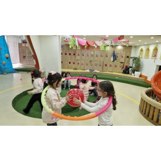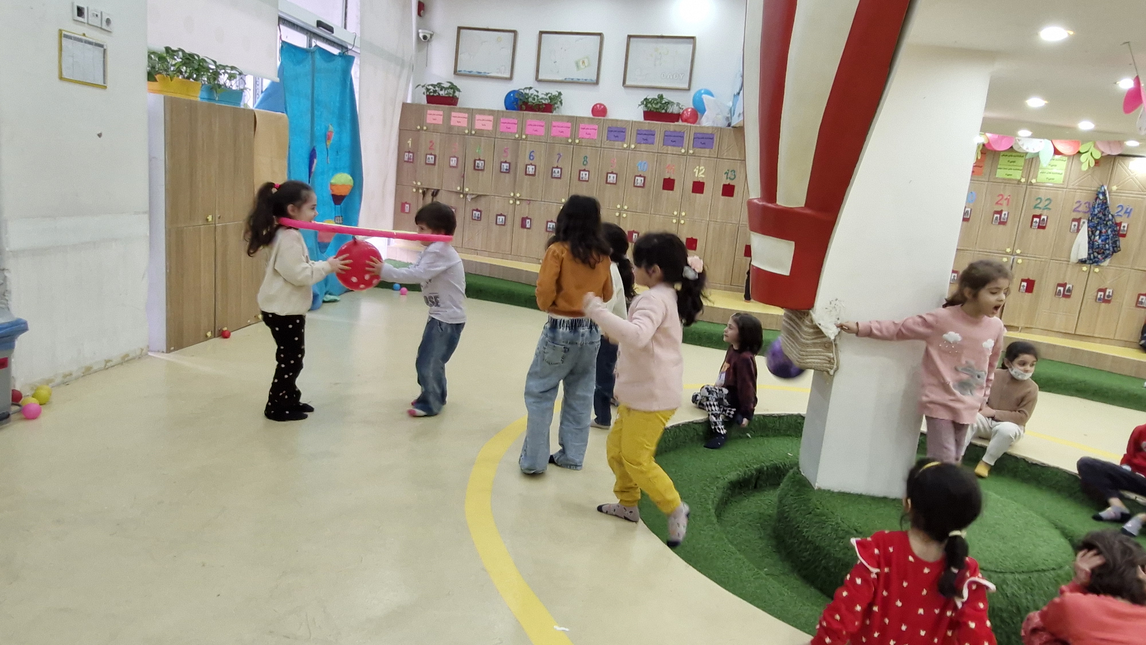 بچهها دوتایی در داخل هولاهوپ هستند... باید با همدیگه راه رفته و بادکنک را به مقصد برسانند