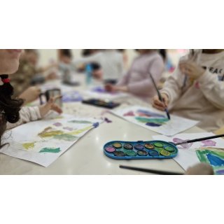 به کمک آبرنگ 🎨و چسب کاغذی طرحی کشیدند و بعد چسب ها را کندند و یه نقاشی خوشگل در اومد