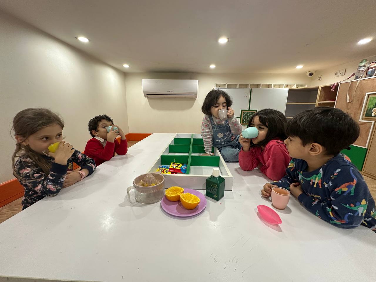 بچه ها امروز راجع به غذا های سالم و ناسالم یادگرفتند و آب پرتقال تازه خوردند و ازمایش آب پرتقال و بتادین رو انجام دادند 🍊🍊 ☺️