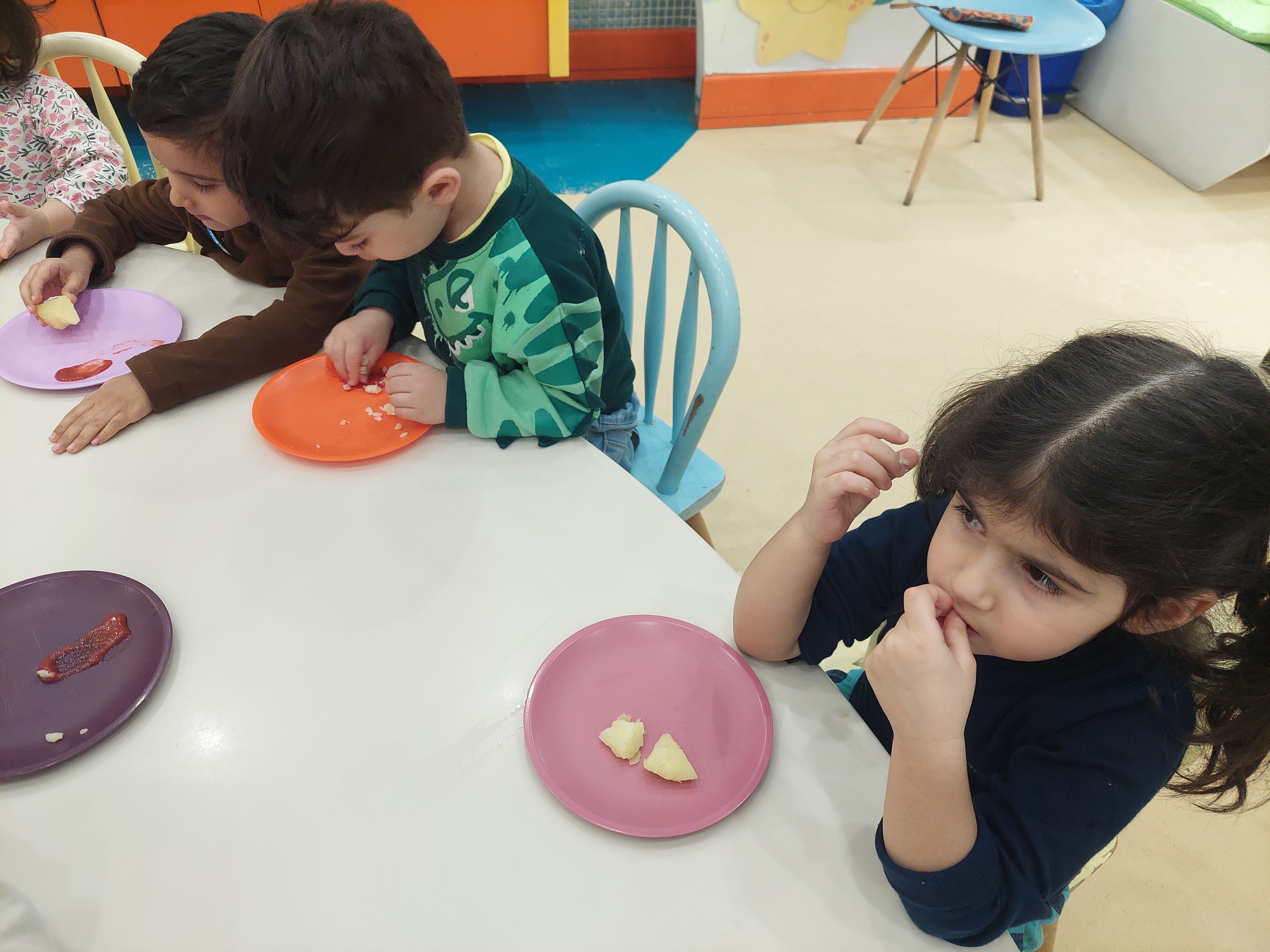بعد نوبت رسید به میان وعده بچه ها که سیب زمینی با سس کچاپ بود😋🥔