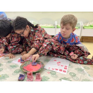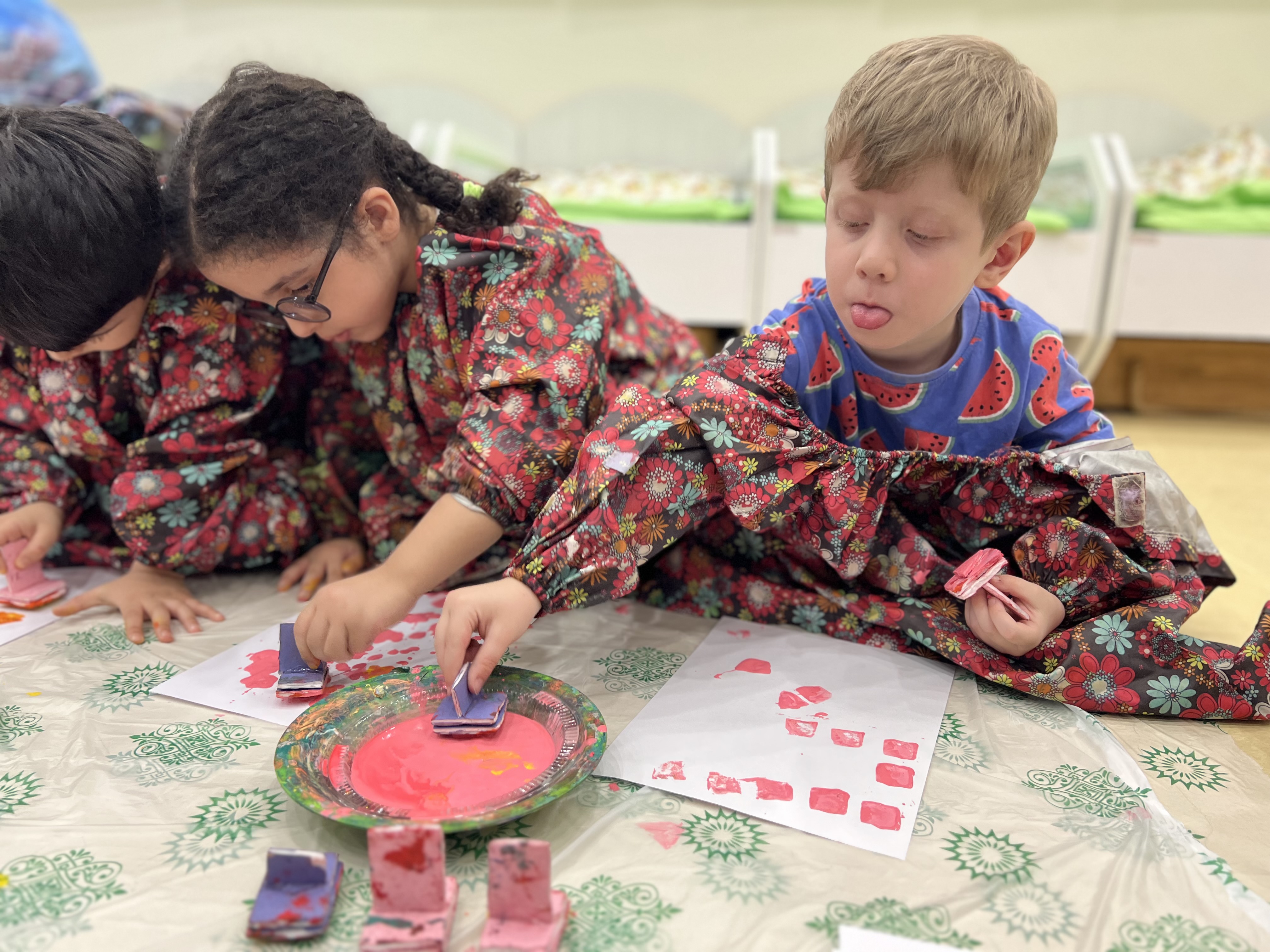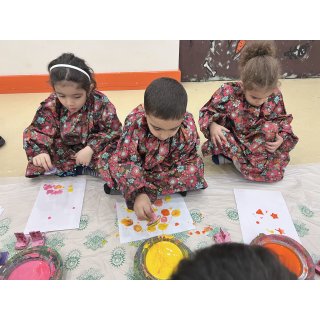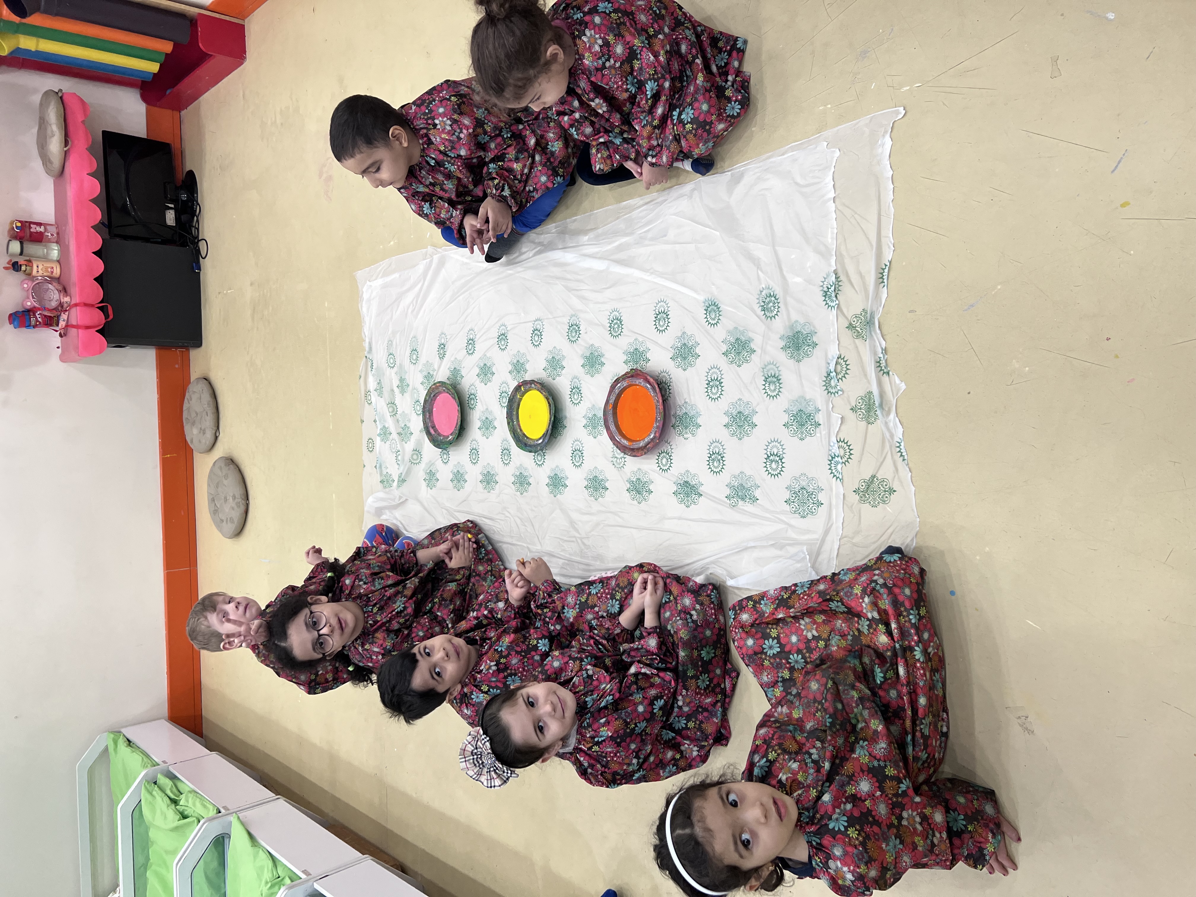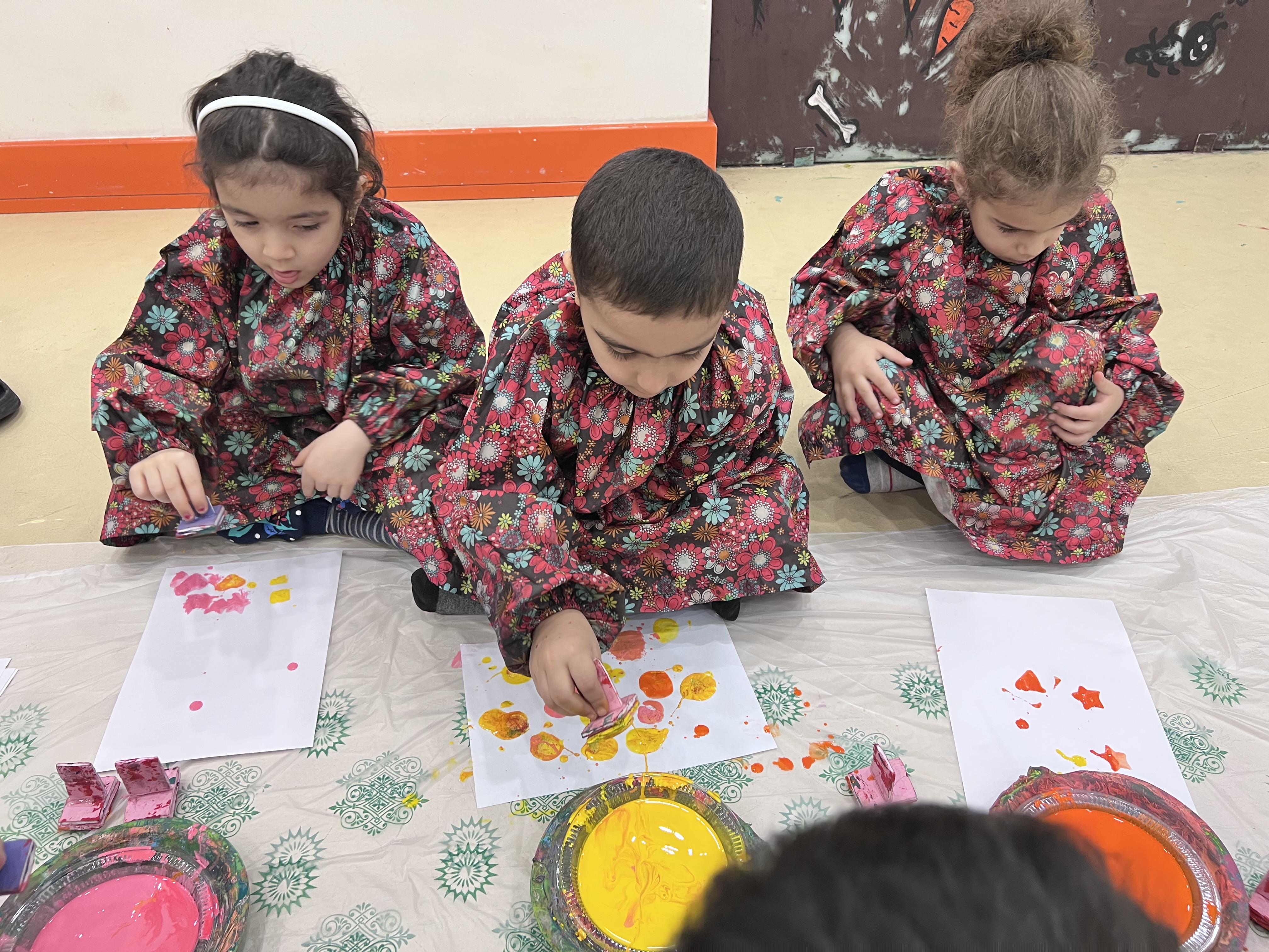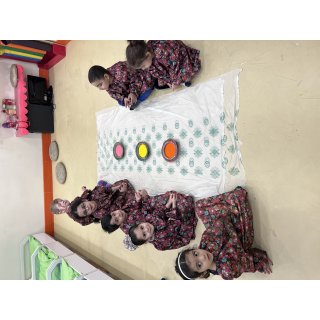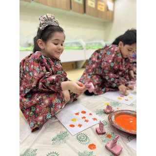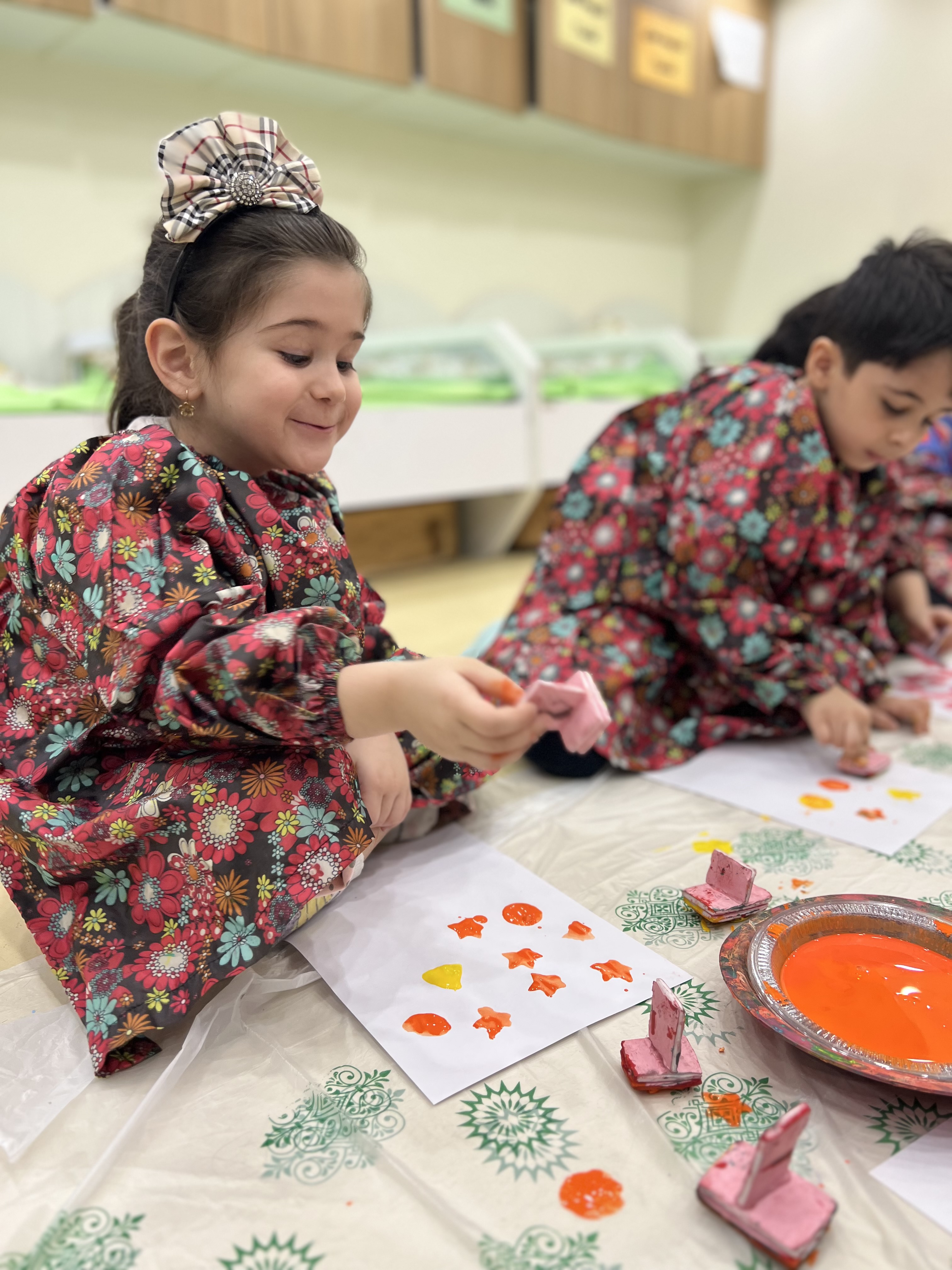ایستگاه بعدی دنیای رنگ بود که با حضور خاله فاطمه هنرمند انجام شد و با رنگ و مهر شکل های مختلف چاپ کردیم 🖌️