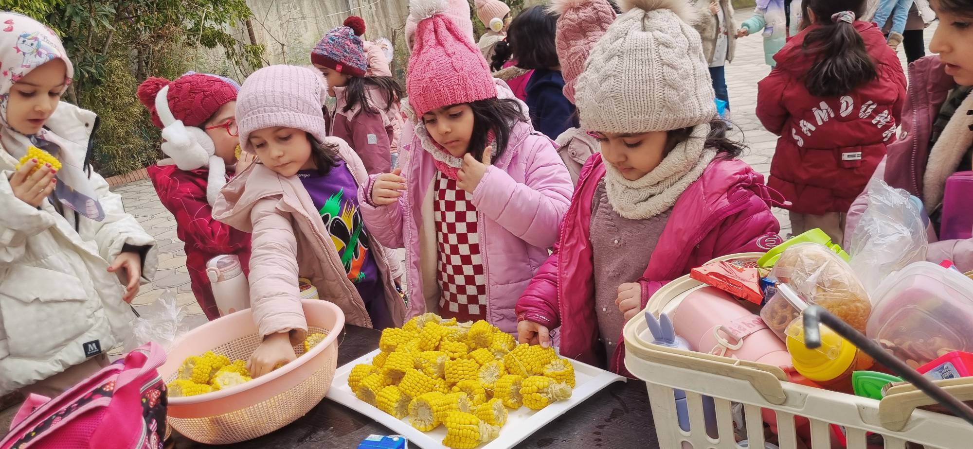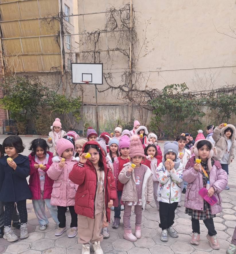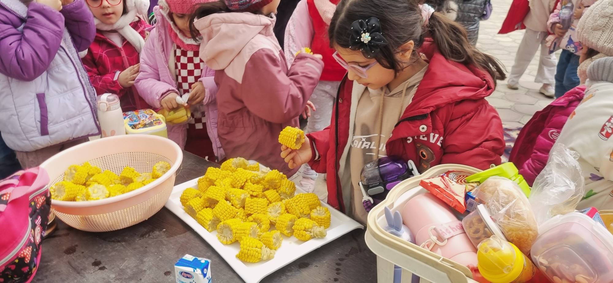سپس برای ادامه انرژی به حیاط رفتیم و میان وعده به همراه بلال میل کردیم و بازی کردیم