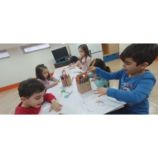 کلاس دنیای رنگ که دایره هایی رو قیچی کردیم و روی یه کاغذ دیگه چسبوندیم و تبدیل به آدمک کردیم🧍