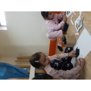 باهم با پین های رنگی طرح خونه رو سوزن کا ی کردیم و بعد طرح آدم برفی رو دوختیم☃️