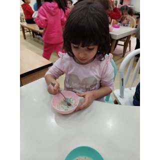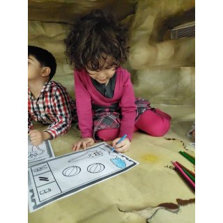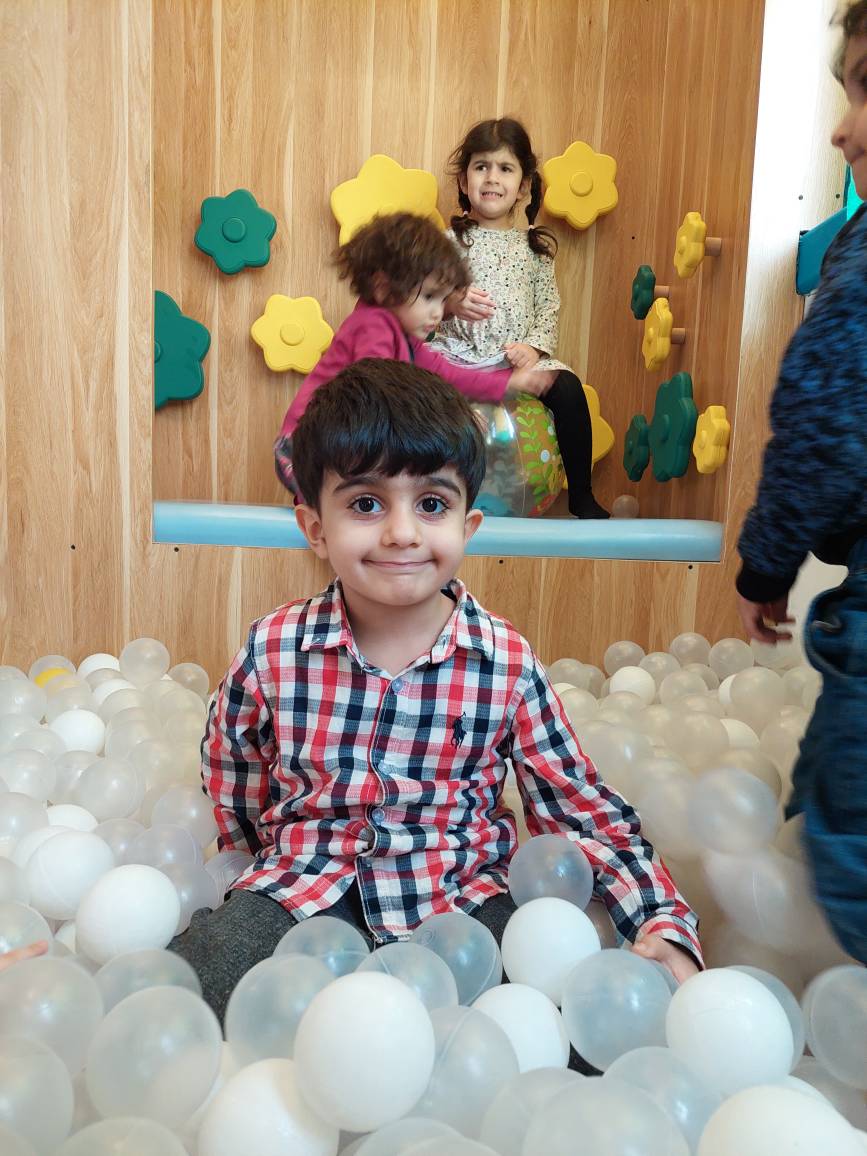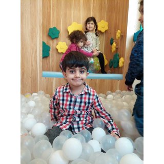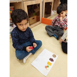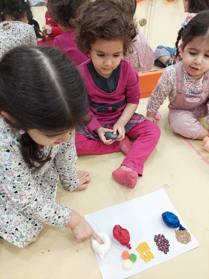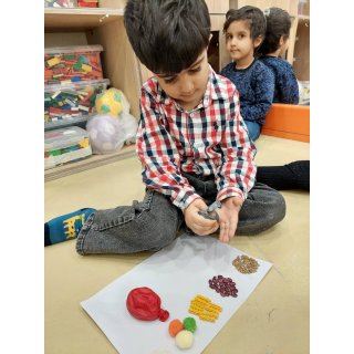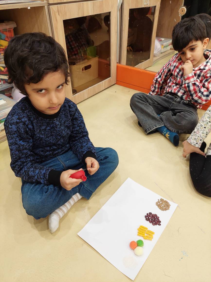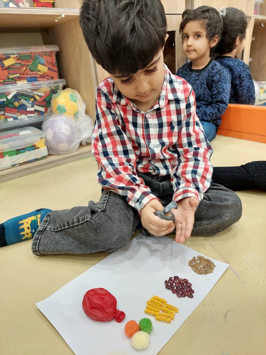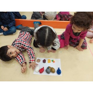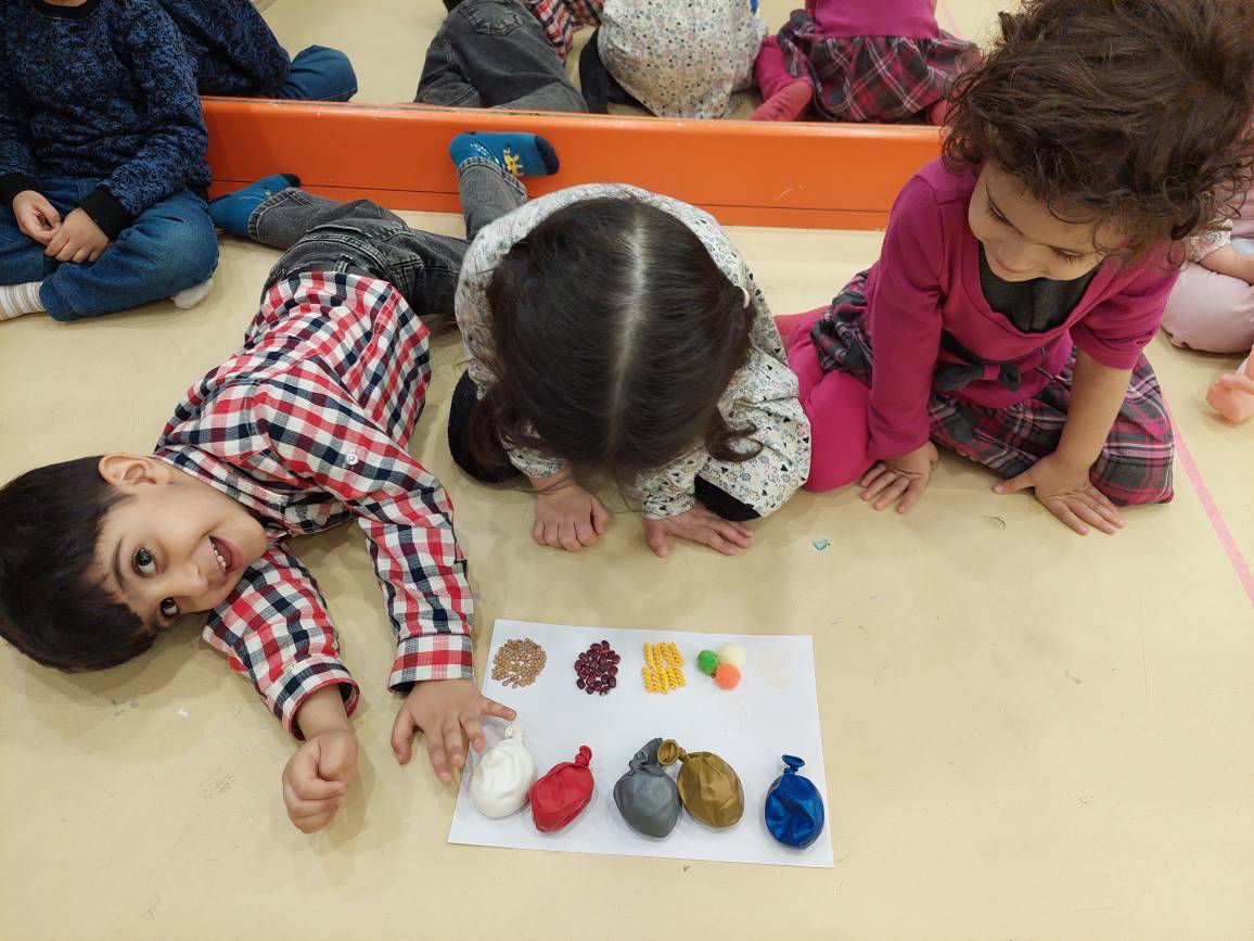 بعد رفتیم کلاس، ابتدا بازی حسی داشتیم، به این صورت بود که باید محتویات داخل بادکنک رو به وسیله حس لامسه متوجه بشوند
