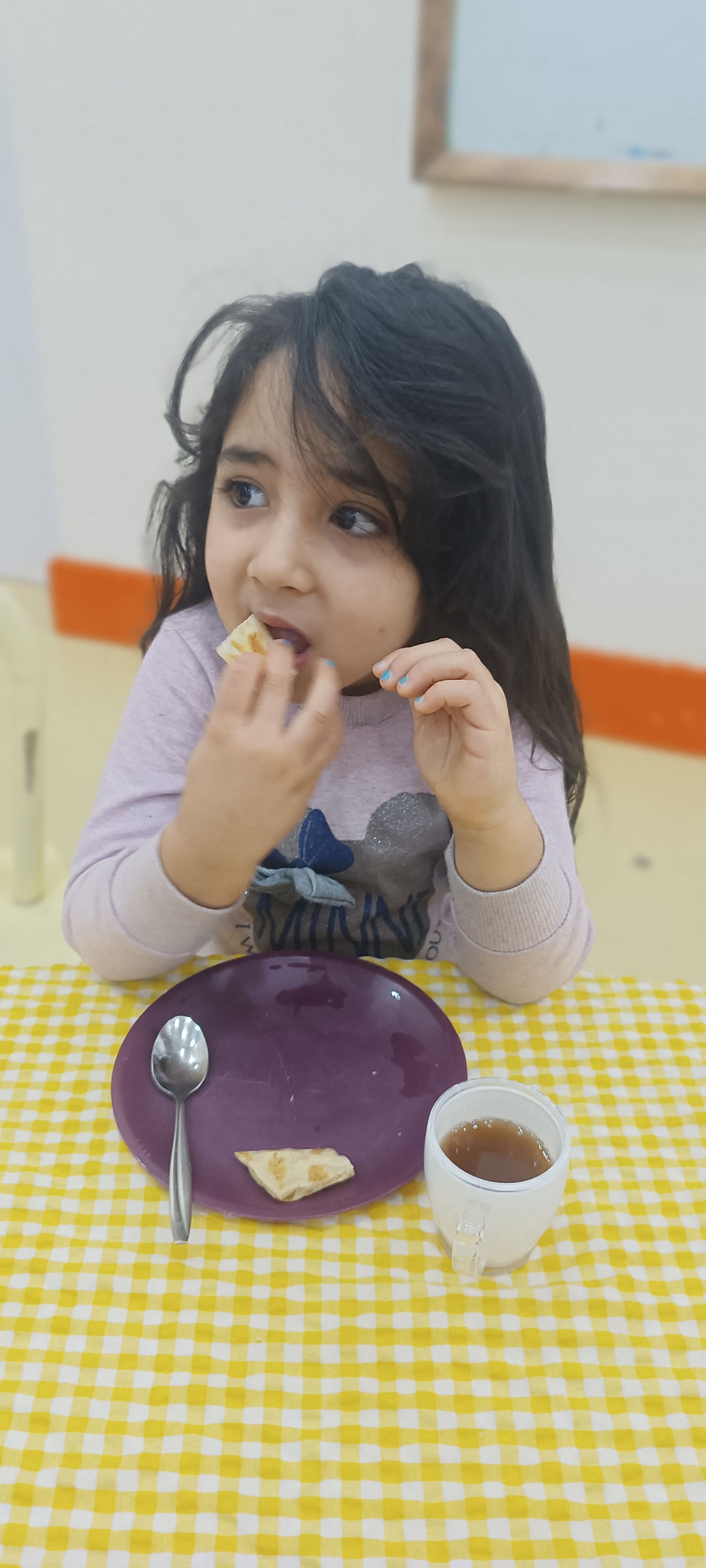 بعد رفتیم سراغ صبحانه خوشمزه یعنی نون و خامه شکلاتی باچای ☕🍞