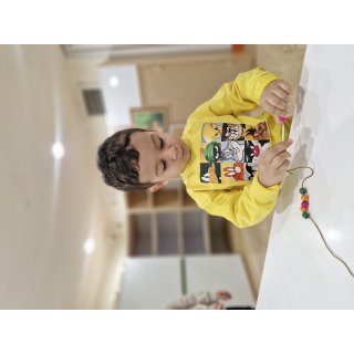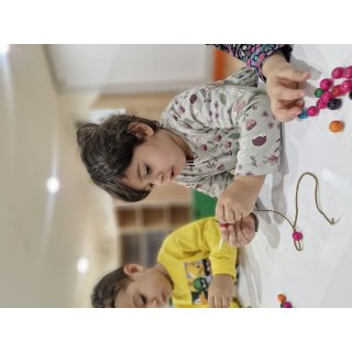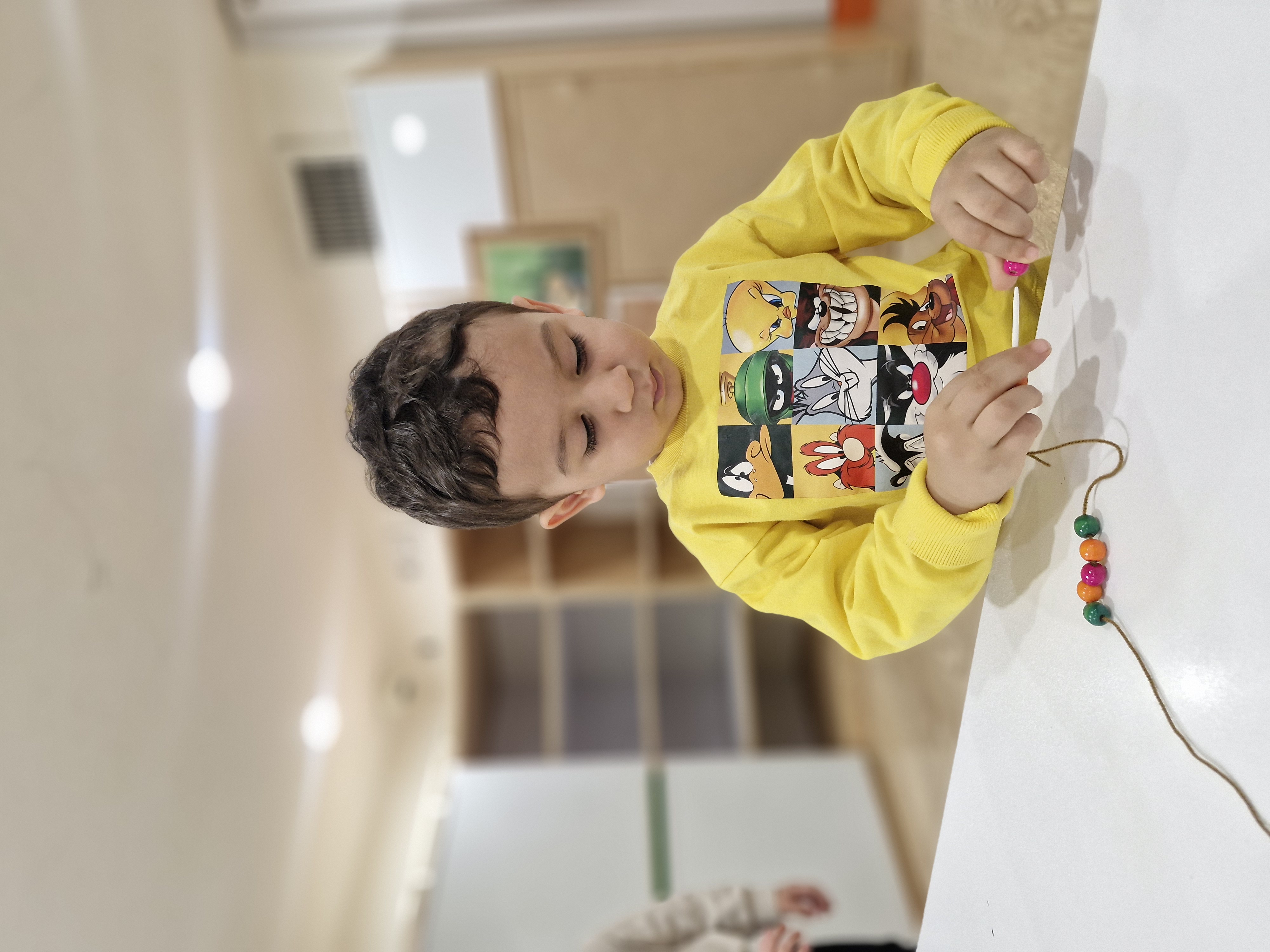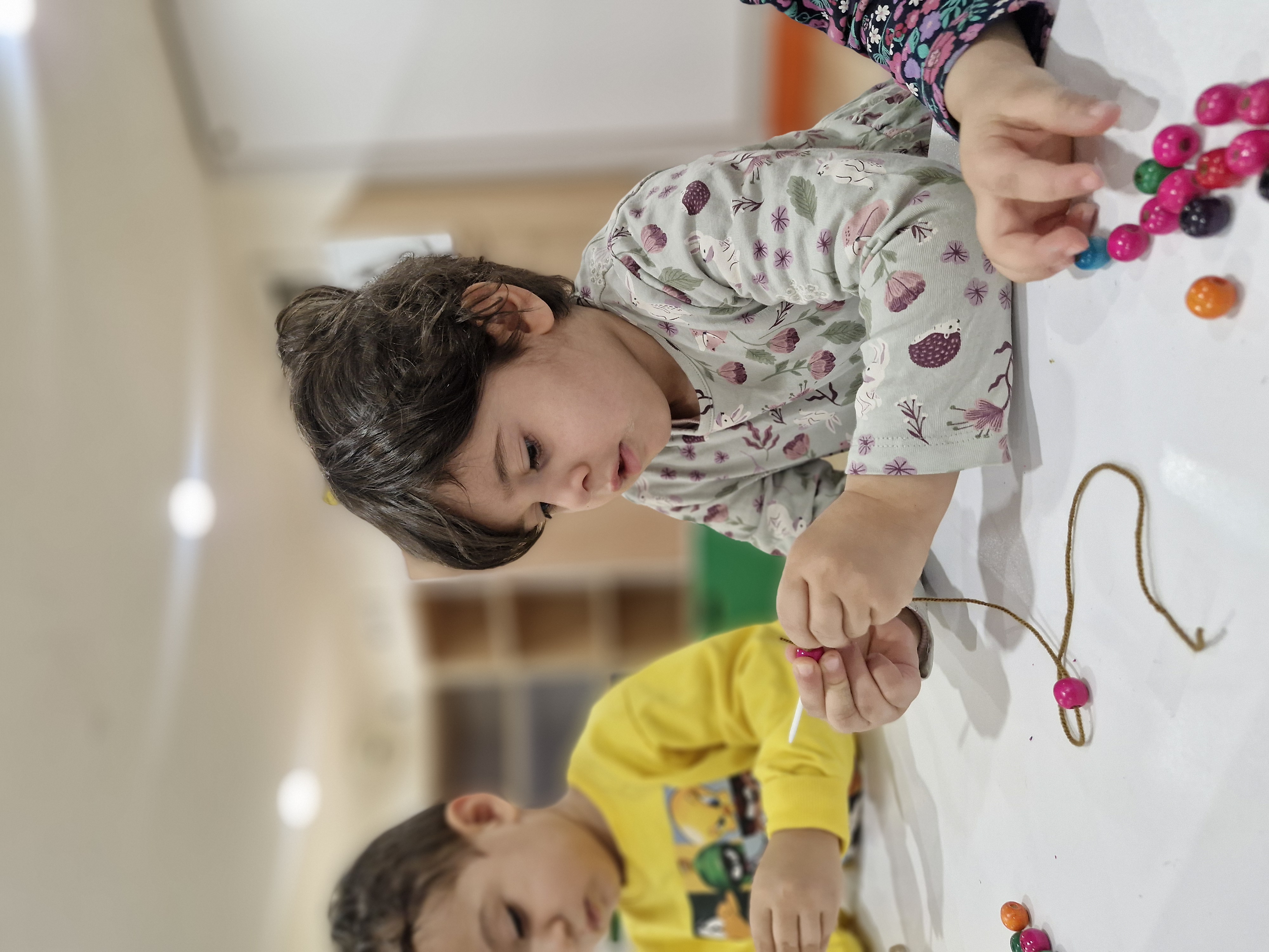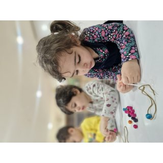 بعدش رفتیم دوخت و دوز داشتیم با مهره های رنگی با سوزن پلاستیکی دستبند رنگی رنگی درست کردیم.🪡🧶